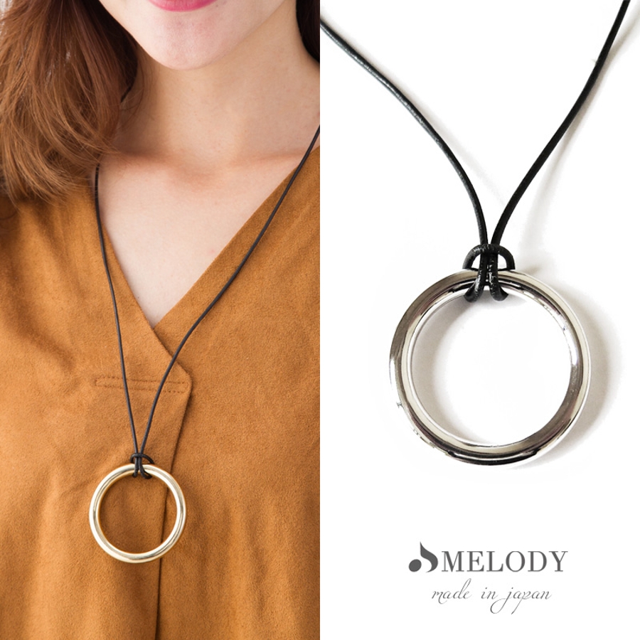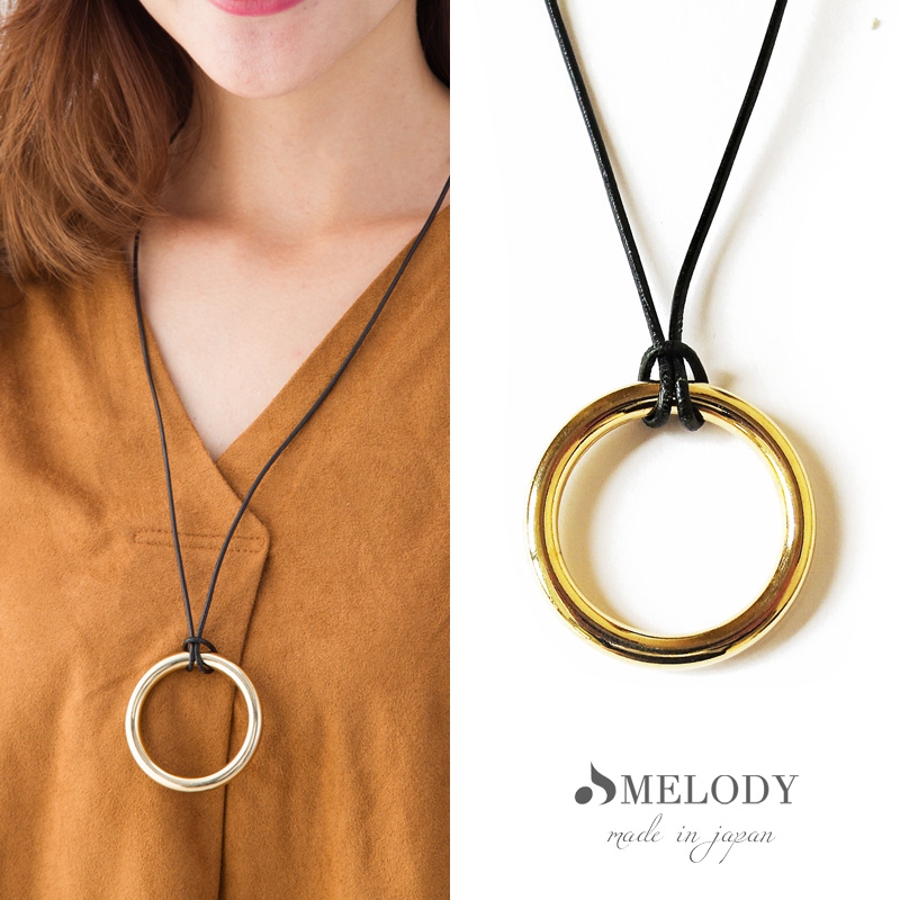 メタル質感のモチーフと、革紐を掛け合わせたフープネックレスです。