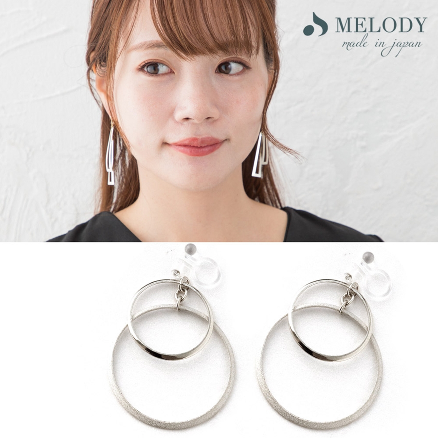 上下に繋げた2つのメタルフープが揺れて存在感を放つ、