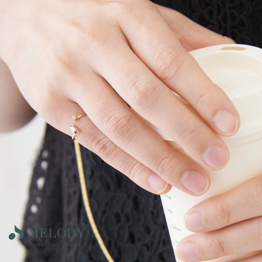 | 素材 | ■素材:真鍮製 ■色:シャンパンK18金コーティング ■2石(スクエアサイズ:大5mm、小3mm マーキスサイズ:6mm、小3mm) ■サイズ:フリーサイズ(最小3号~最大5号) ■日本製 |