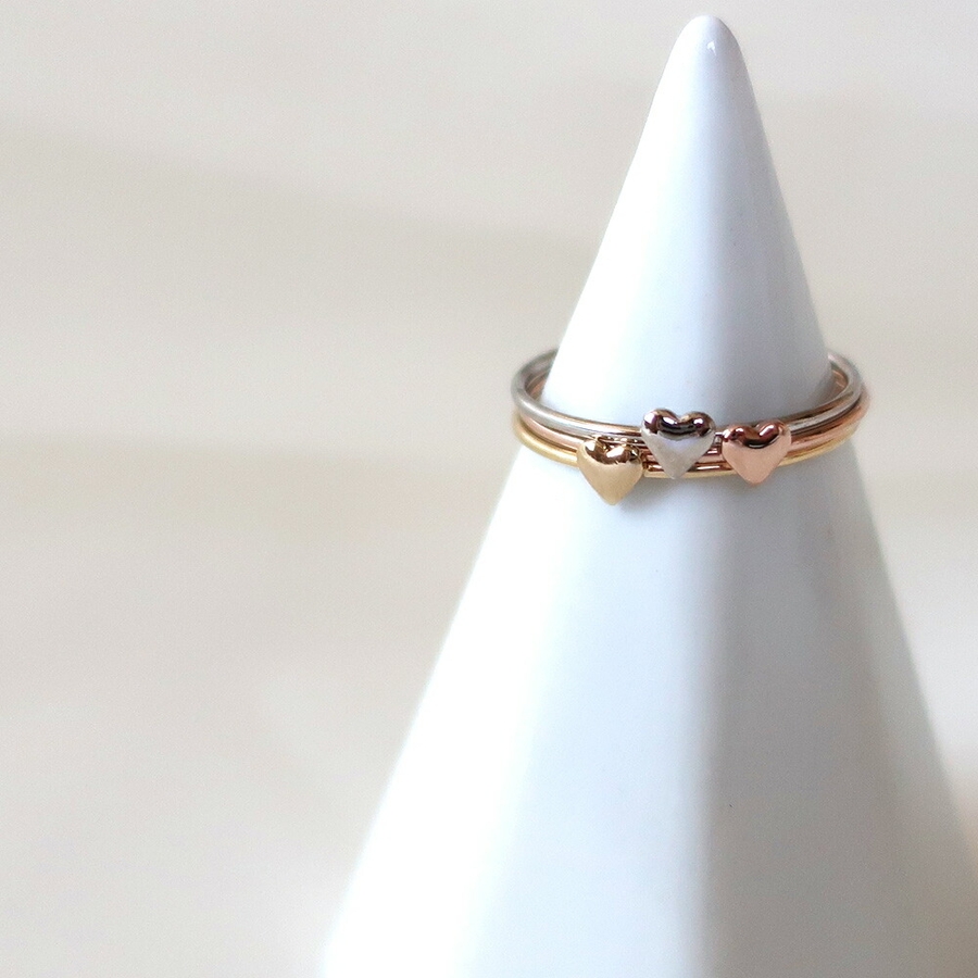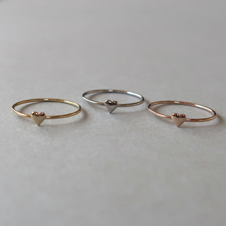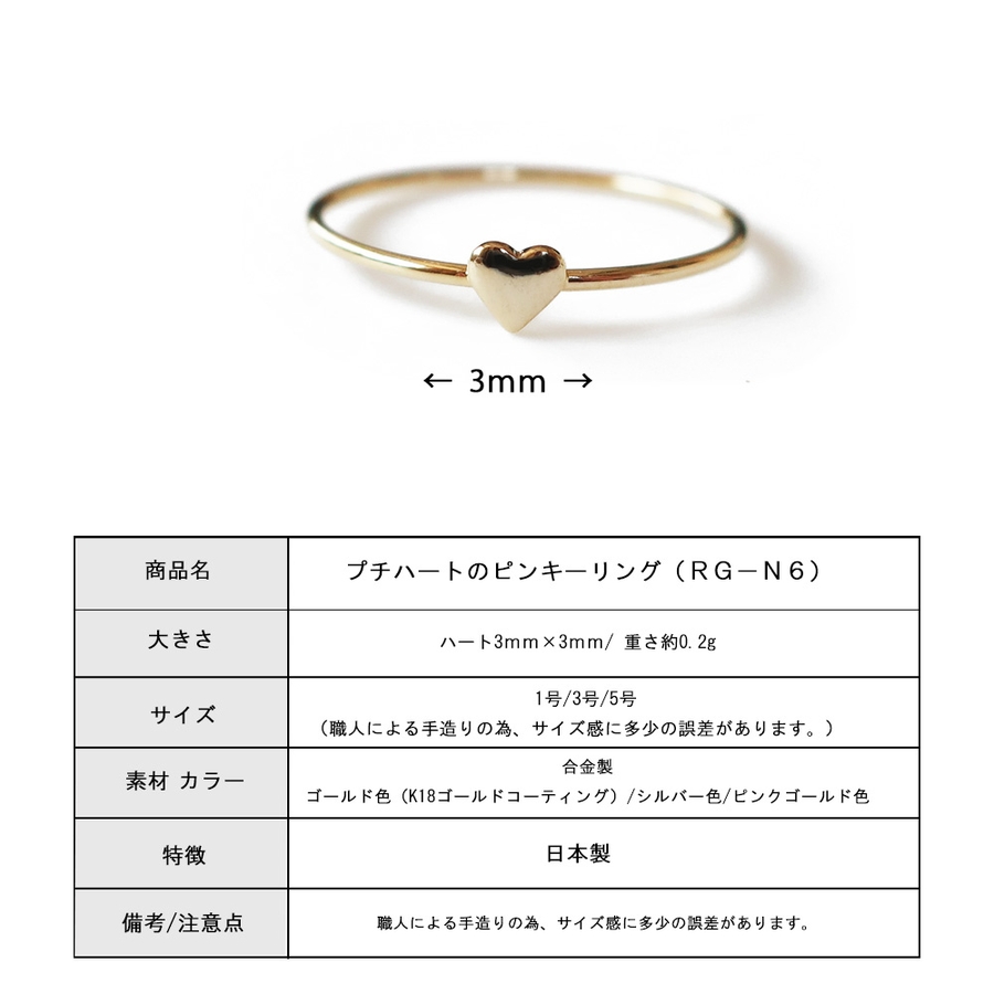 | 素材 | ■素材:真鍮製 ■ハートサイズ:3mm×3mm ■リング幅:2mm ■色:K18金コーティング・ロジュームコーティング・ピンクゴールドコーティング ■サイズ:1号・3号・5号 ■日本製 |