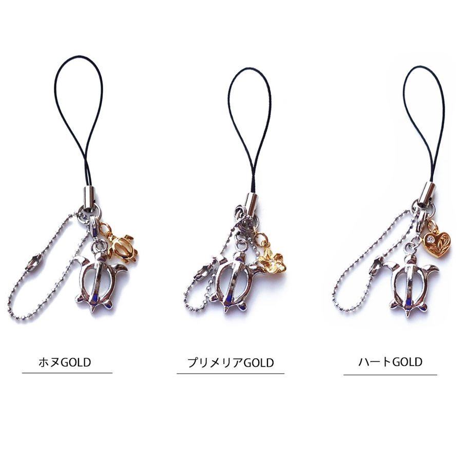 チャームはプリメリア・ハート・ホヌの選べる3種類。そして色は2色から選べます。