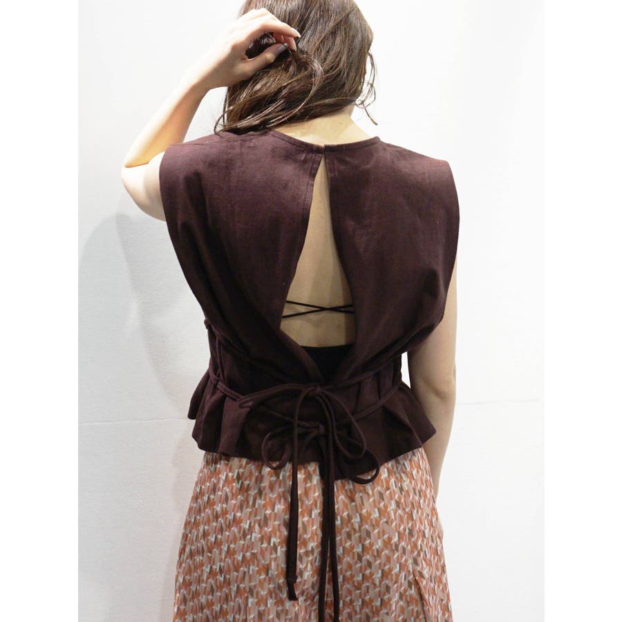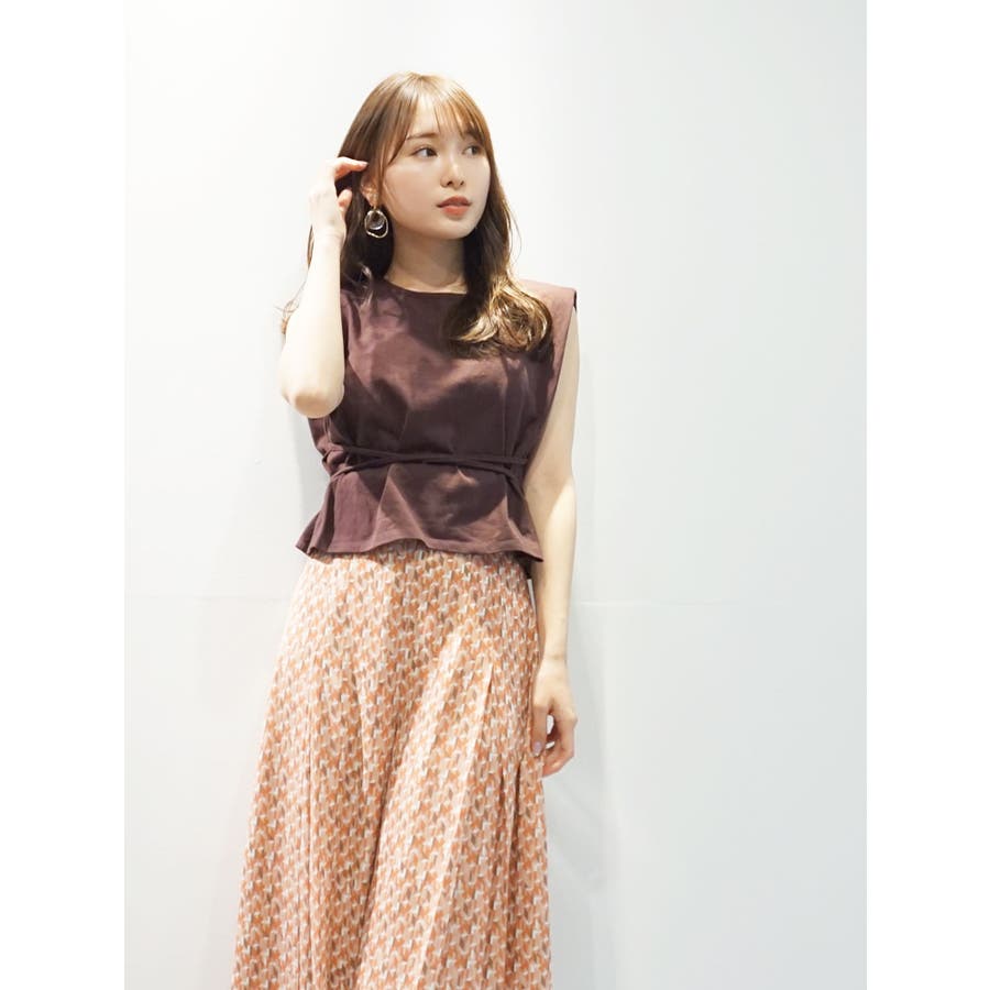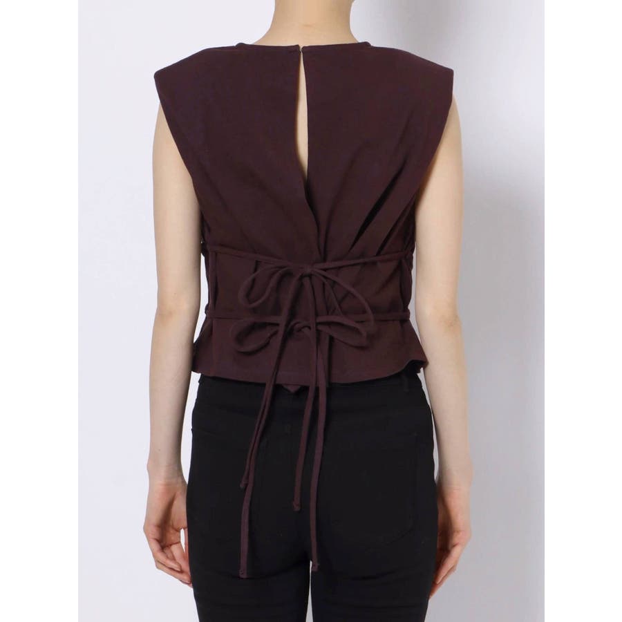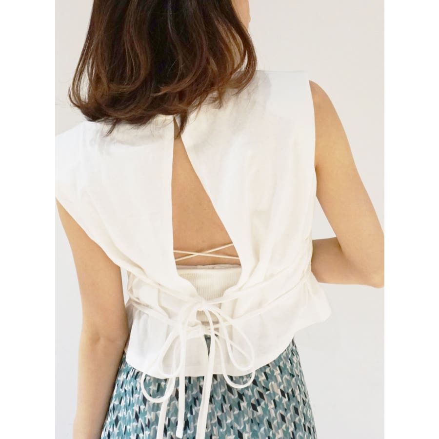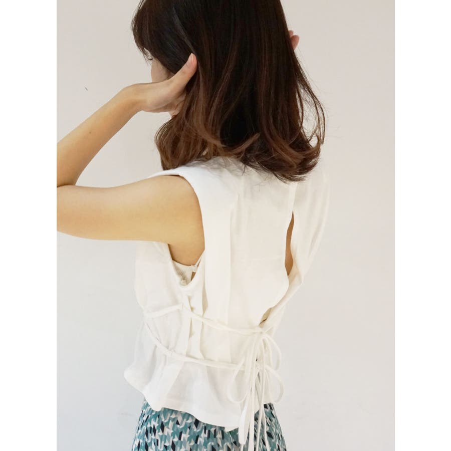 肩パッド付なのがトレンド感抜群のアイテム。後ろは大胆に開いたバックシャンデザインで、細いリボンがフェミニンさをプラスしてくれます。リボンはフロントでクロスされているので、ウエストマークされてスタイルアップして見える優秀なトップスです。着脱の際にリボンを外さずに着られるように左脇にファスナーを付けています。 【スタイリング】短丈で作っているので、ボトムにはハイウエストのものがお勧めです。裾はボトムにインしてもアウトしても可愛く見えるように設定しています。今年はジオメトリックなプリントのパンツと合わせて少しエスニックな雰囲気に仕上げるのがおすすめです。【商品特徴】透け感:なし伸縮性:ややあり生地の厚さ:普通サイズ感:普通裏地:なし
