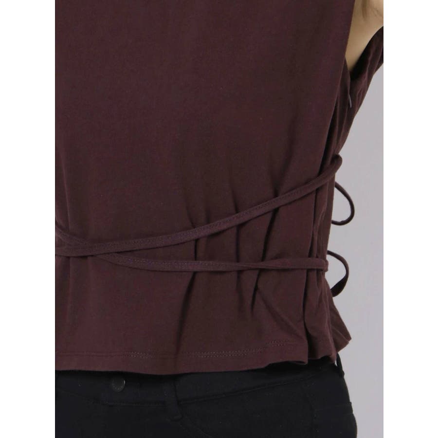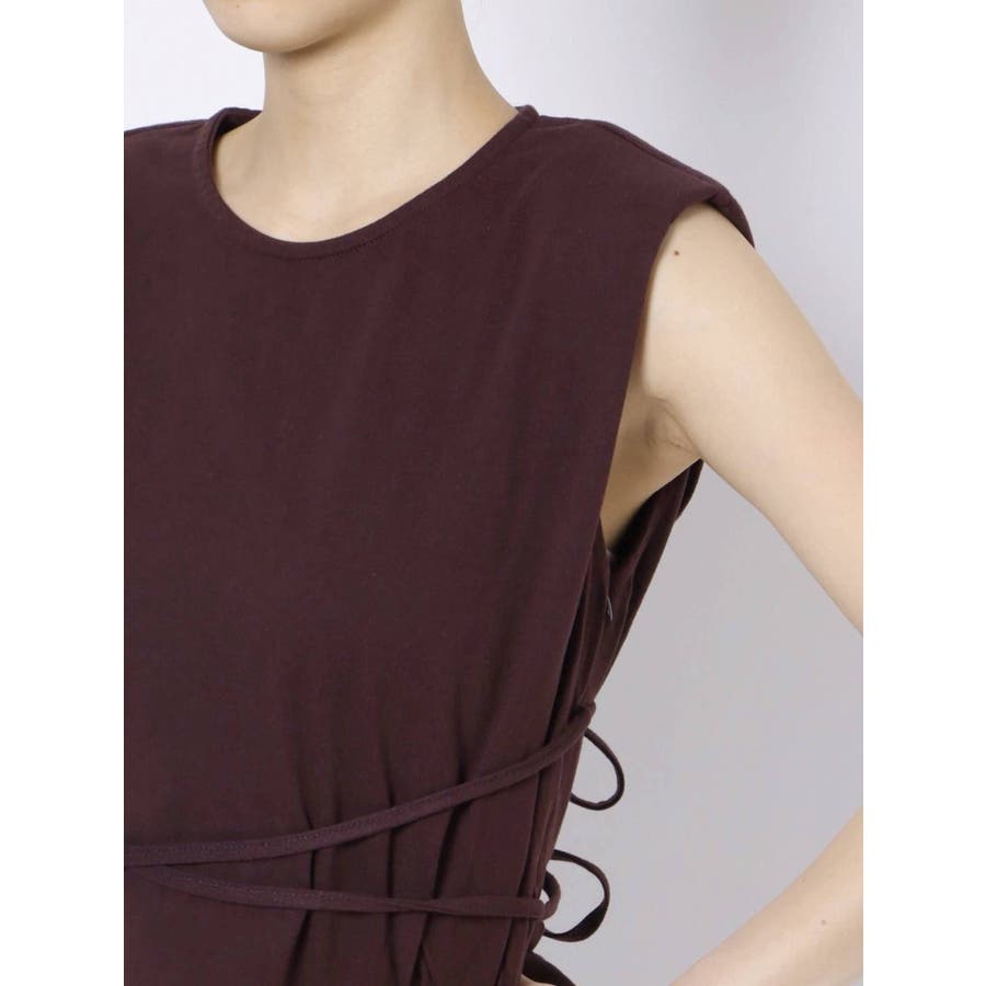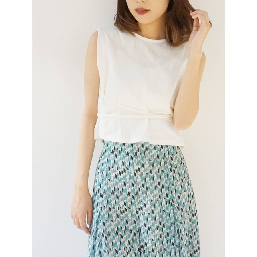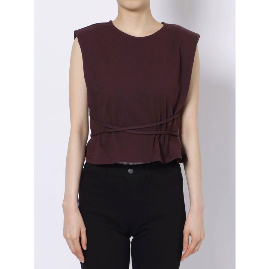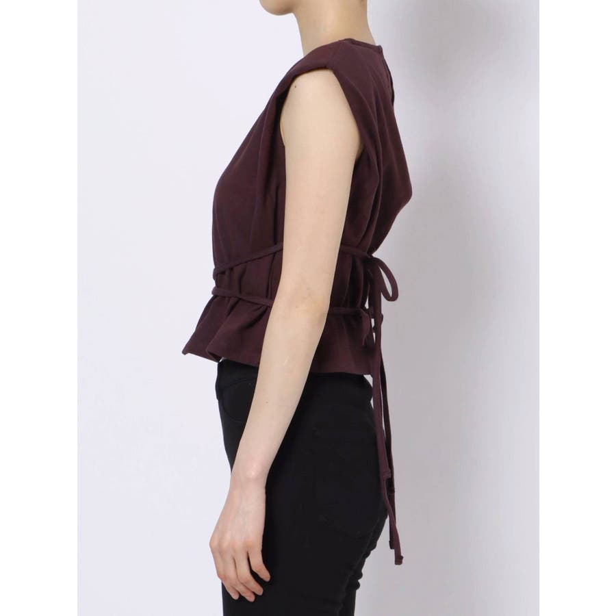肩パッド付なのがトレンド感抜群のアイテム。後ろは大胆に開いたバックシャンデザインで、細いリボンがフェミニンさをプラスしてくれます。リボンはフロントでクロスされているので、ウエストマークされてスタイルアップして見える優秀なトップスです。着脱の際にリボンを外さずに着られるように左脇にファスナーを付けています。 【スタイリング】短丈で作っているので、ボトムにはハイウエストのものがお勧めです。裾はボトムにインしてもアウトしても可愛く見えるように設定しています。今年はジオメトリックなプリントのパンツと合わせて少しエスニックな雰囲気に仕上げるのがおすすめです。【商品特徴】透け感:なし伸縮性:ややあり生地の厚さ:普通サイズ感:普通裏地:なし