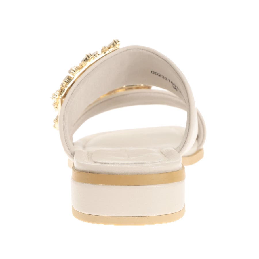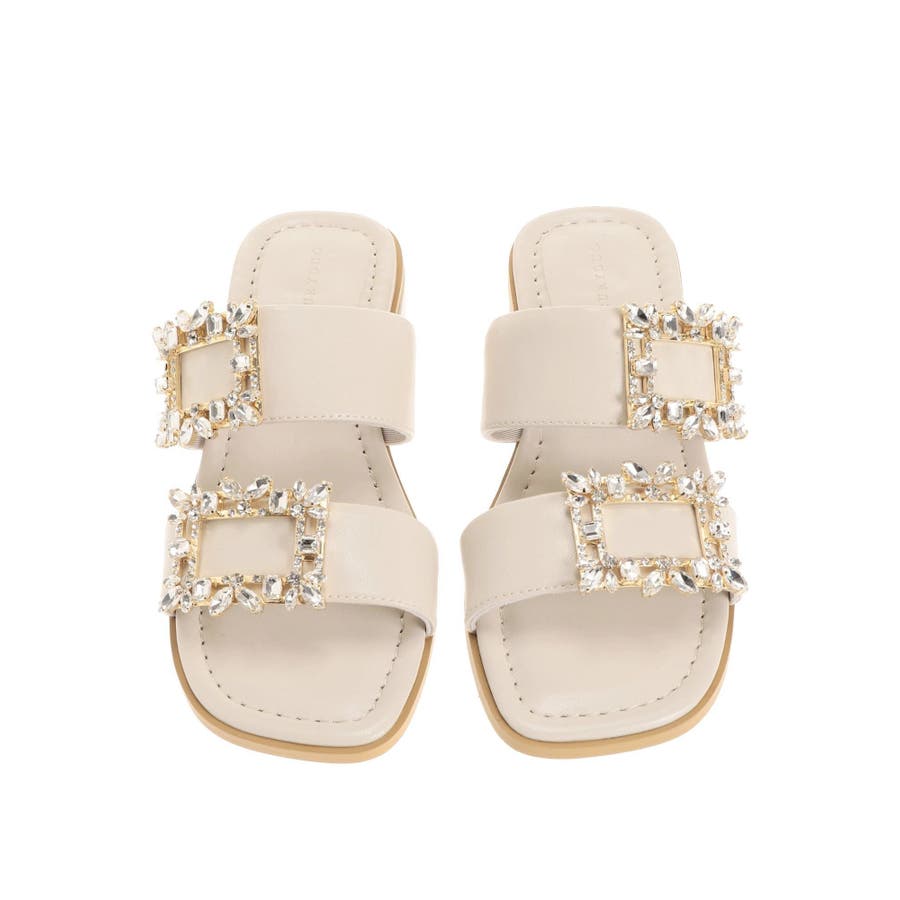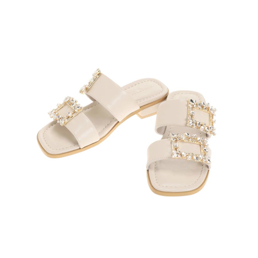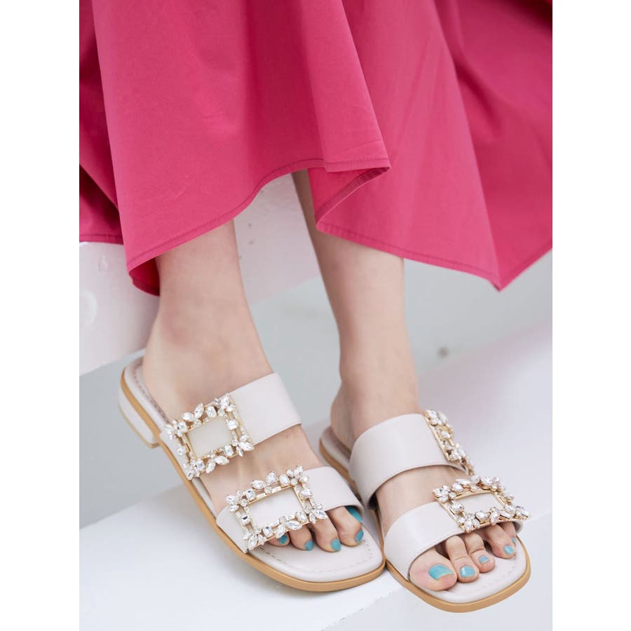 去年から引き続きトレンドのナローストラップをクロスさせた華奢サンダル。 ポインテッドトゥでより足の甲がきれいに見え、上品な印象になります。 ほんの少しだけヒールをつけていて、ヒールにはさりげなくメタルパーツをあしらってアクセントを加えています。 マキシワンピースにもパンツスタイルにも相性抜群のサンダルです。【スタッフ着用レビュー】 スタッフA(普段のサイズ: 24.5cm/足の幅: 9.8cm/甲の高さ: 5.6cm/ふくらはぎ周り:34cm)38サイズ着用でぴったりでした。足幅も丁度良く、甲の部分は柔らかいのであたっても痛くなりにくいのが嬉しいポイントです。