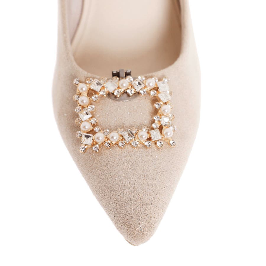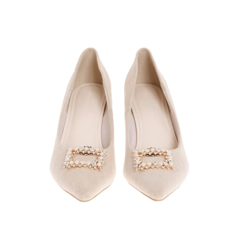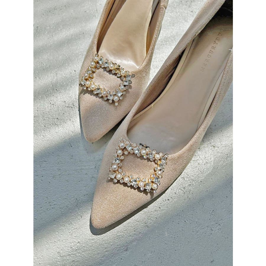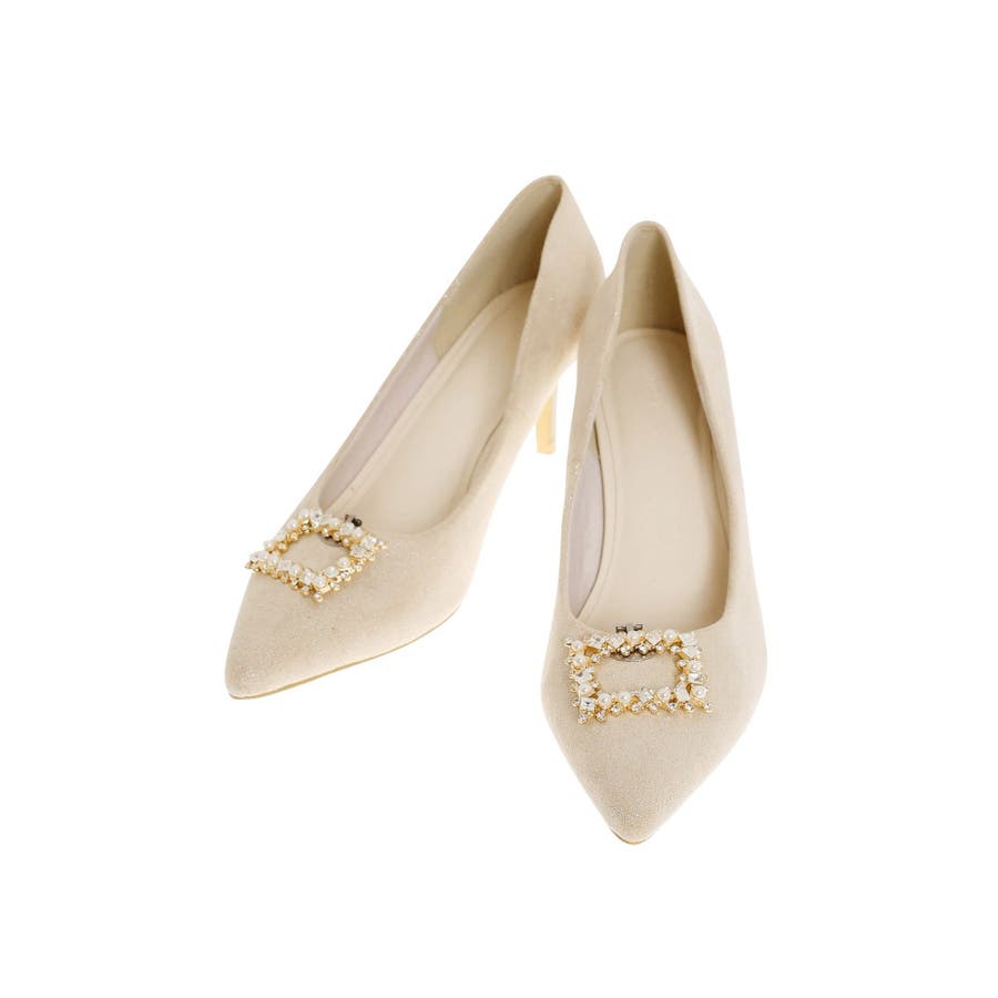 上品なラメ混の素材を使用した華やかなパンプス。今年らしいインパクトのあるビジューパーツがつま先にアクセントを加えています。取り外し可能なので、シーンに合わせて選べます。中敷きにはクッションが入っているので、履き心地にもこだわっています。足が綺麗に見える7cmヒールでヒールの形状も程よく華奢で安定感もあります。ブラックのみ合皮素材を使用しています。▼スタイリングドレスシーンに使えるように華やかにデザインされていますが、今年はデニムパンツなどに合わせてきれいめカジュアルなスタイリングを楽しむのも◎【スタッフ着用レビュー】スタッフC(普段のサイズ: 24.0cm/足の幅: 9.7cm/甲の高さ: 6.1cm/ふくらはぎ周り:33.5cm)38サイズ着用でピッタリでした。ビジューパーツが取り外し可能なので様々な雰囲気が作れ、1足持っていたいです。ヒールも高すぎず履きやすいです。