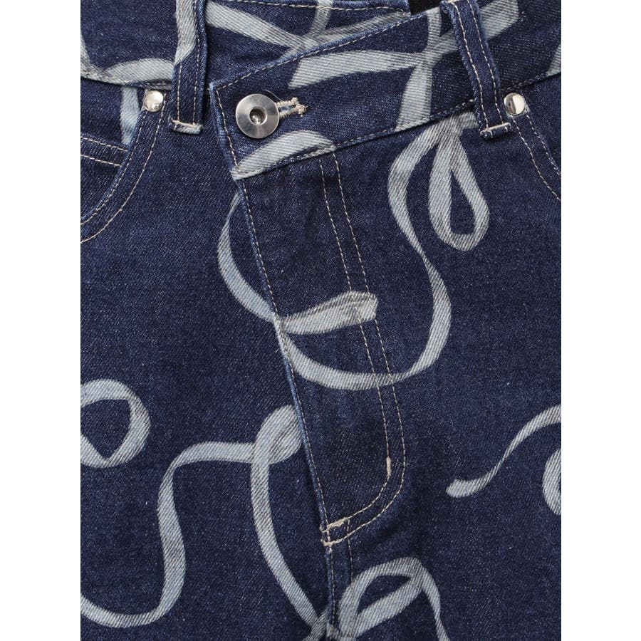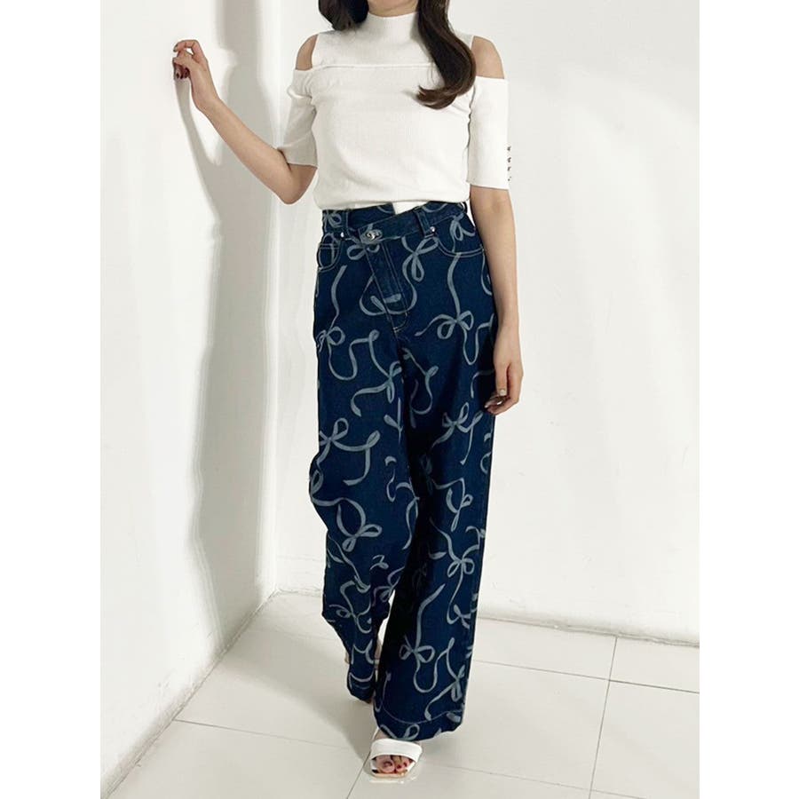 オリジナルでトレンドのリボン柄を起こしたプリントデニムパンツ。 ラップ風のフロントデザインが、ウエストをより華奢見えさせます。 全体に柄をプリントしているので、取り入れるだけで今年っぽいスタイリングに◎ ▼スタイリング 柄のあるデニムなので、トップスはシンプルなリブニットや、ラメのポロニットトップスとの合わせがおすすめ。 ※詳細画像以外はサンプルです。 ※SM着丈差4.5cm ※着用画像はフラッシュの加減で実際の製品と色味等が異なる場合がございますので、生地のズームアップ画像をご確認ください。※ご利用の端末画面の設定により実際の商品と色味が異なる場合がございます。【商品特徴】透け感:なし伸縮性:なし生地の厚さ:普通サイズ感:ゆったり裏地:なしポケット:あり(前/後)