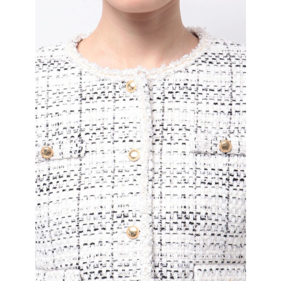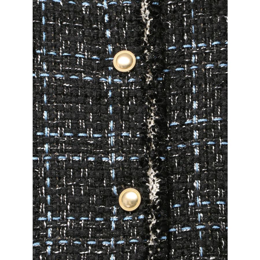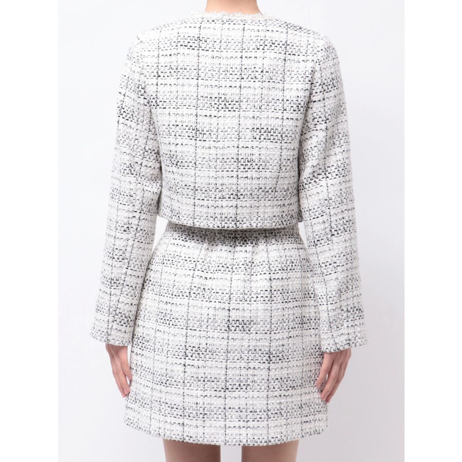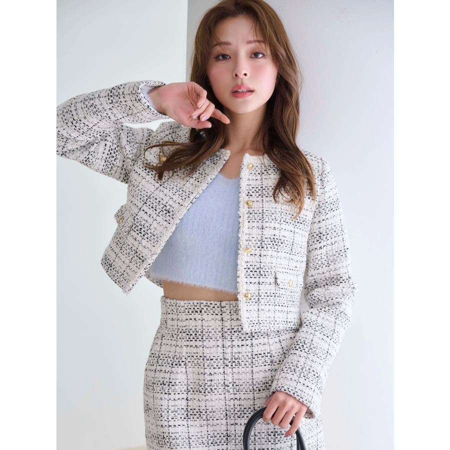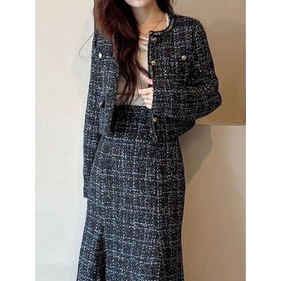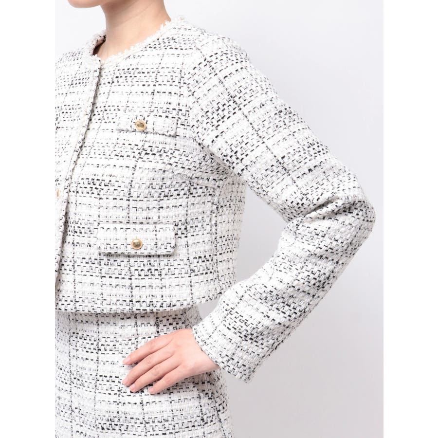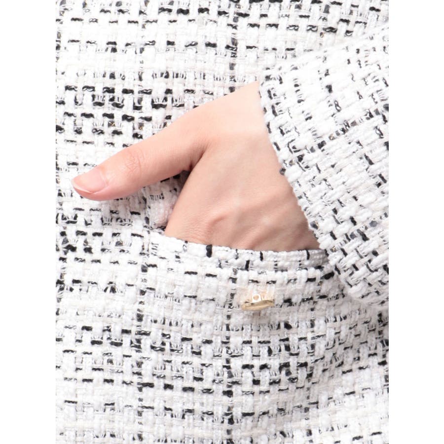 "ツイード素材をマーキュリーデュオオリジナルで糸からこだわって作りました。生地にはシルバーの糸をスラブ糸に撚って、全体が上品な輝きになるよう配色しました。衿周りはスッキリと着れるノーカラージャケット。金釦とツィードの組み合わせが秋のムードを高めてくれます。短丈のコンパクトなジャケットなので、スタイルアップ抜群。両脇のフラップミニポケットもこだわりポイントです。▼スタイリングコンパクトなサイズ感なので、ワンピースの羽織としても抜群。デニムと合わせてフェミニンカジュアルな装いが大人な着こなしに。今季はレイヤード見えのチュールティアードスカートを合わせて最先端なトレンドを取り入れたスタイリングもおすすめ。※着用は全てサンプルです。※SM着丈差1cm※ブラックの色、青みが強いですが全体的にブラック寄りの色になります。"