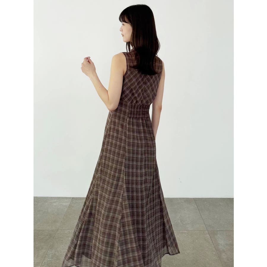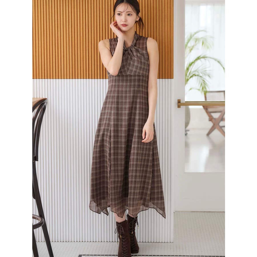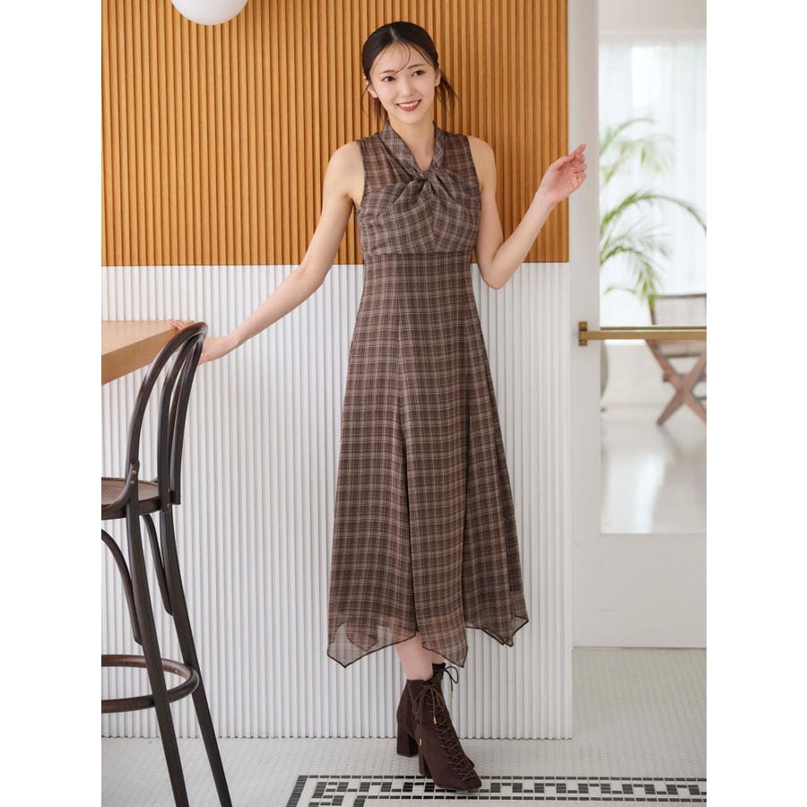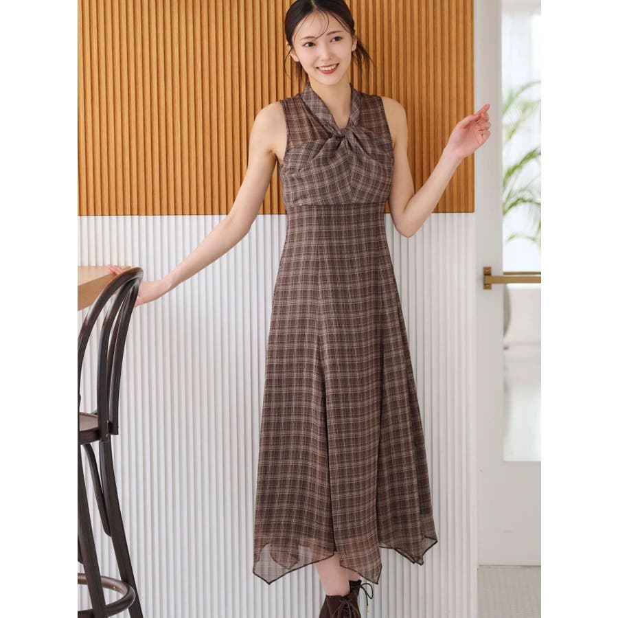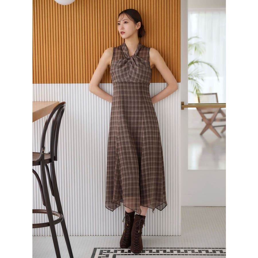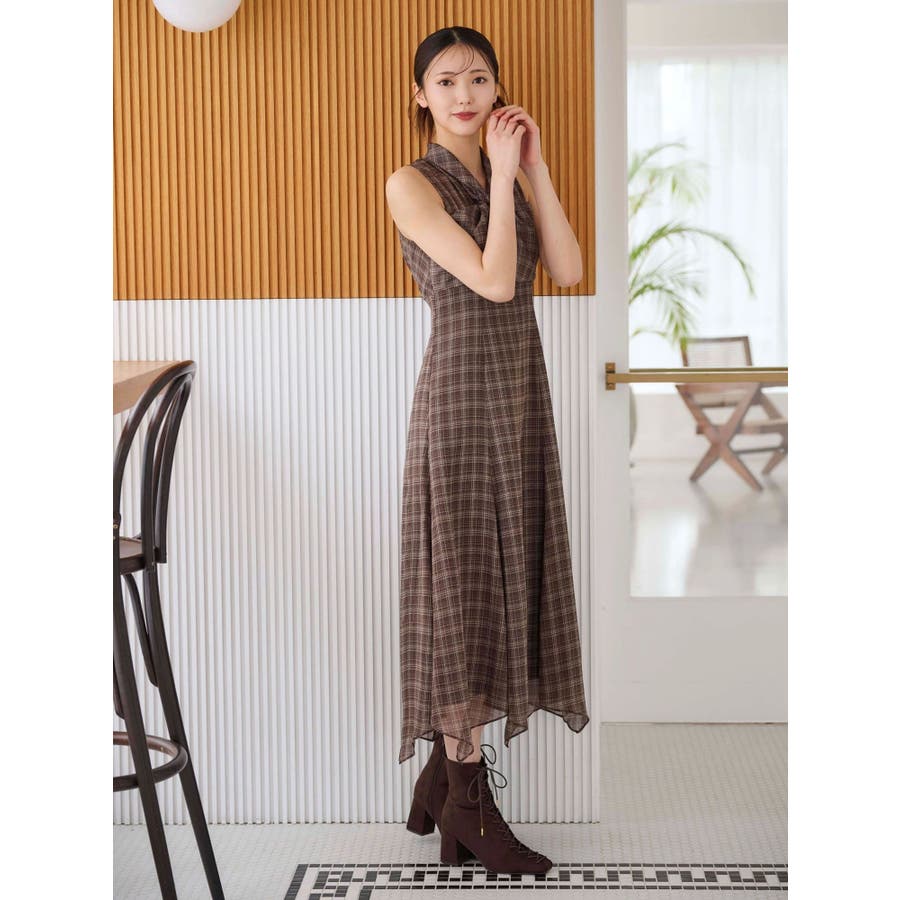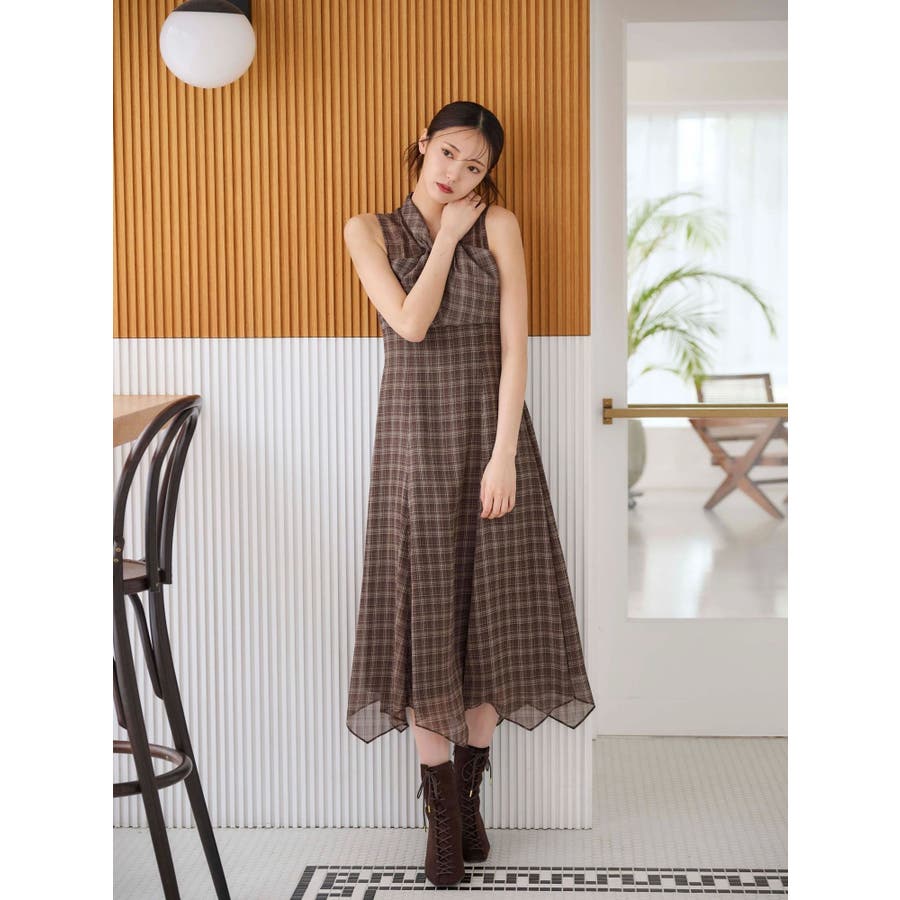 秋らしいダークトーンのチェック生地を使ったワンピースです。 ツイストした襟元から繋がるビスチェディテールはバイアスに柄をとって透ける部分とのコントラストがより強調されるようになっています。 裾はイレギュラーヘムにすることでトレンド感のある仕上がりになっています。 ▼スタイリング ボレロを肩を落として羽織ると抜け感が出ます。 足元はショートブーツやミュールがおすすめです。 ※着用画像はフラッシュの加減で実際の製品と色味等が異なる場合がございますので、生地のズームアップ画像をご確認ください。※ご利用の端末画面の設定により実際の商品と色味が異なる場合がございます。【商品特徴】透け感:なし伸縮性:なし生地の厚さ:薄手サイズ感:普通裏地:ありポケット:なしファスナー:あり(後)
