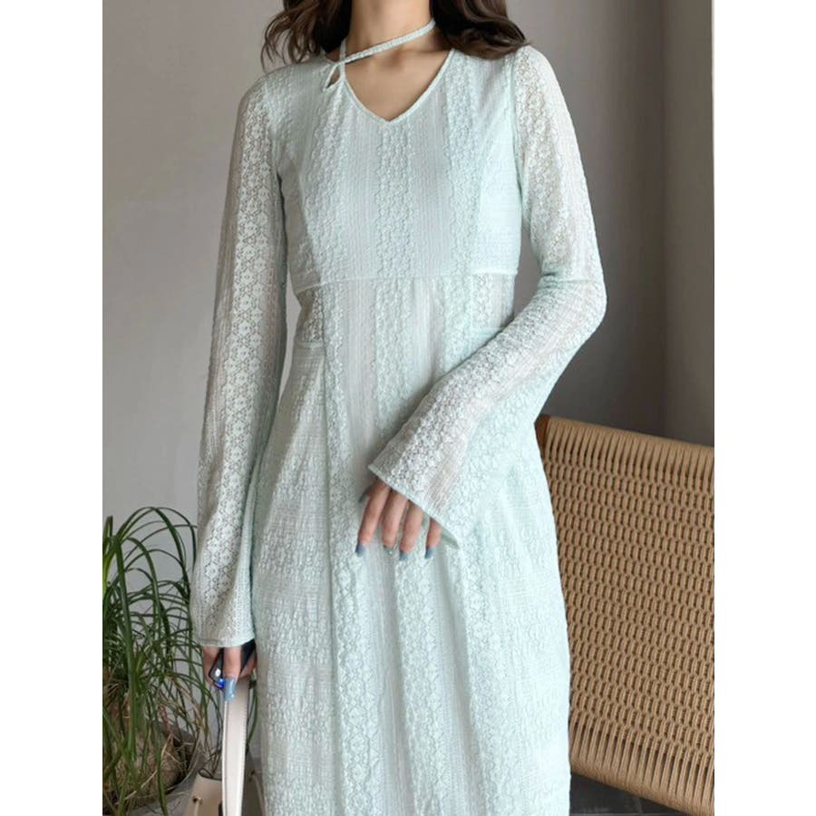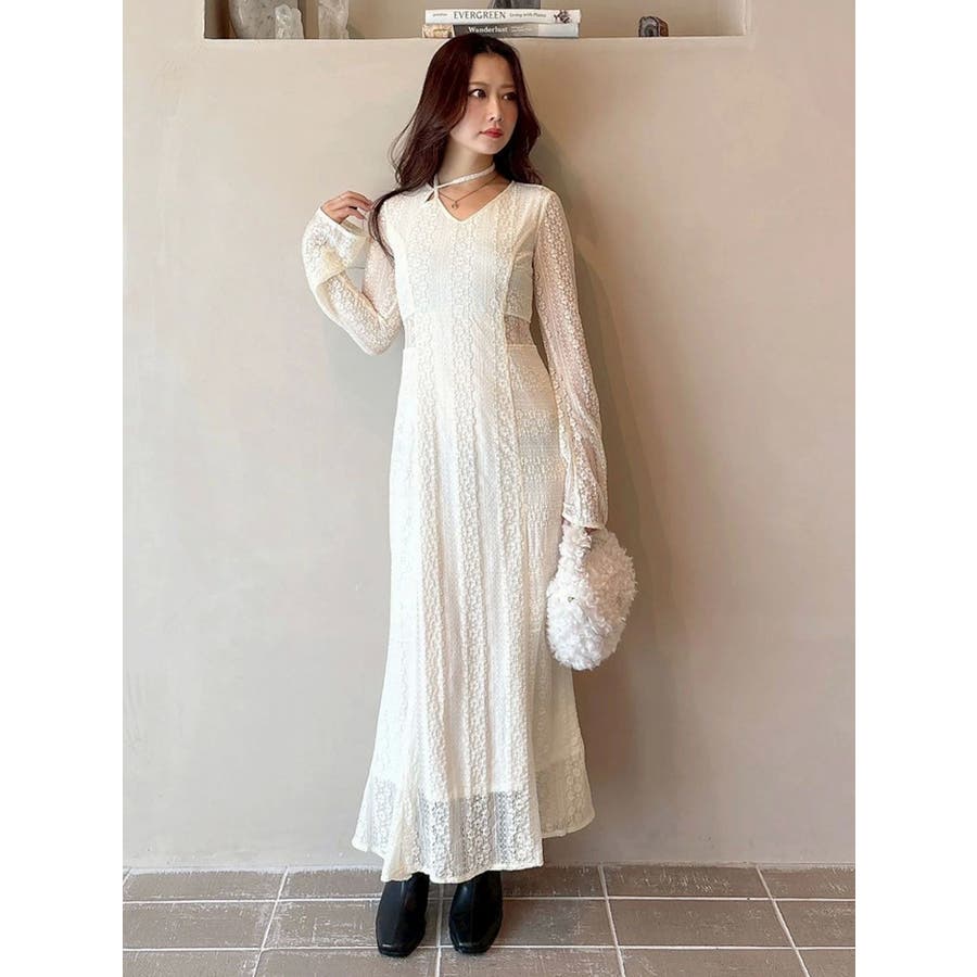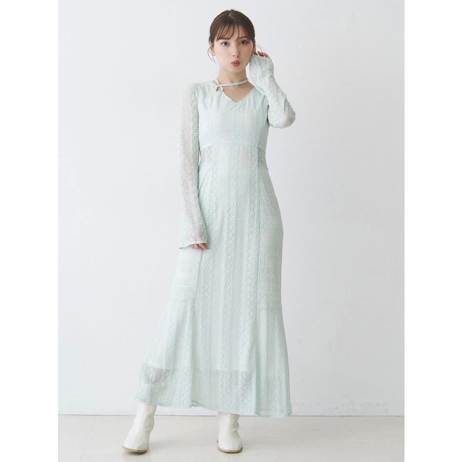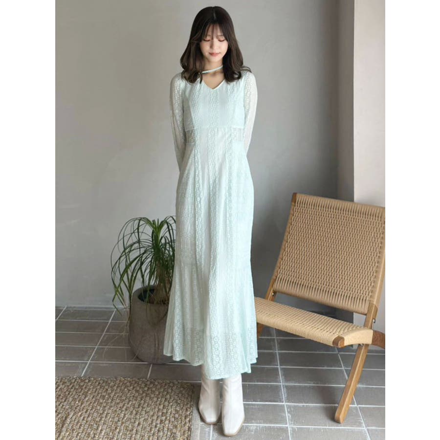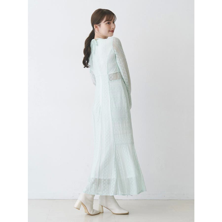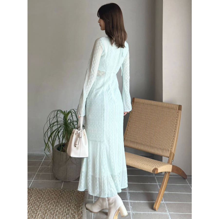 カットレースブロッキングフレアスリーブマーメイドワンピース