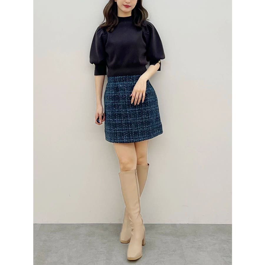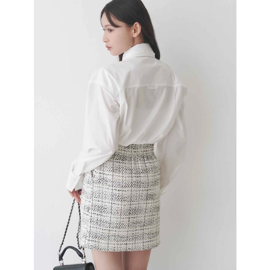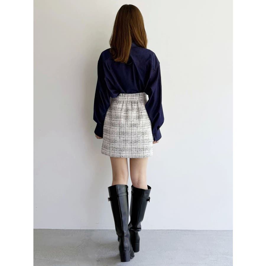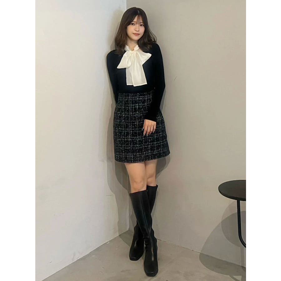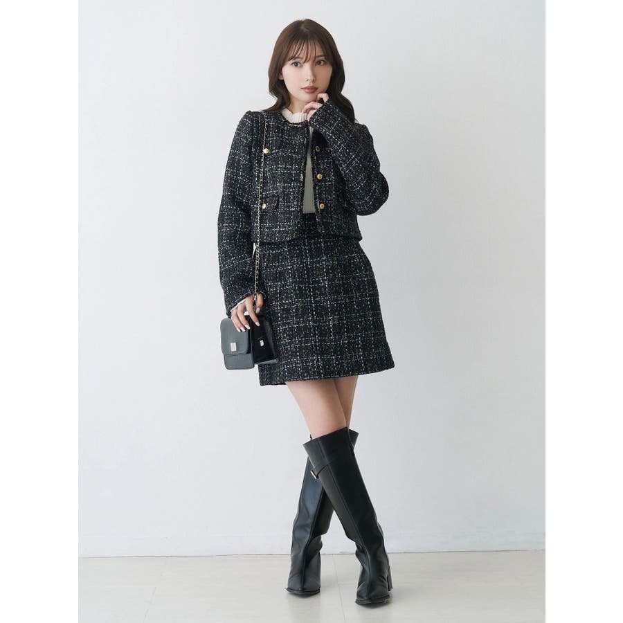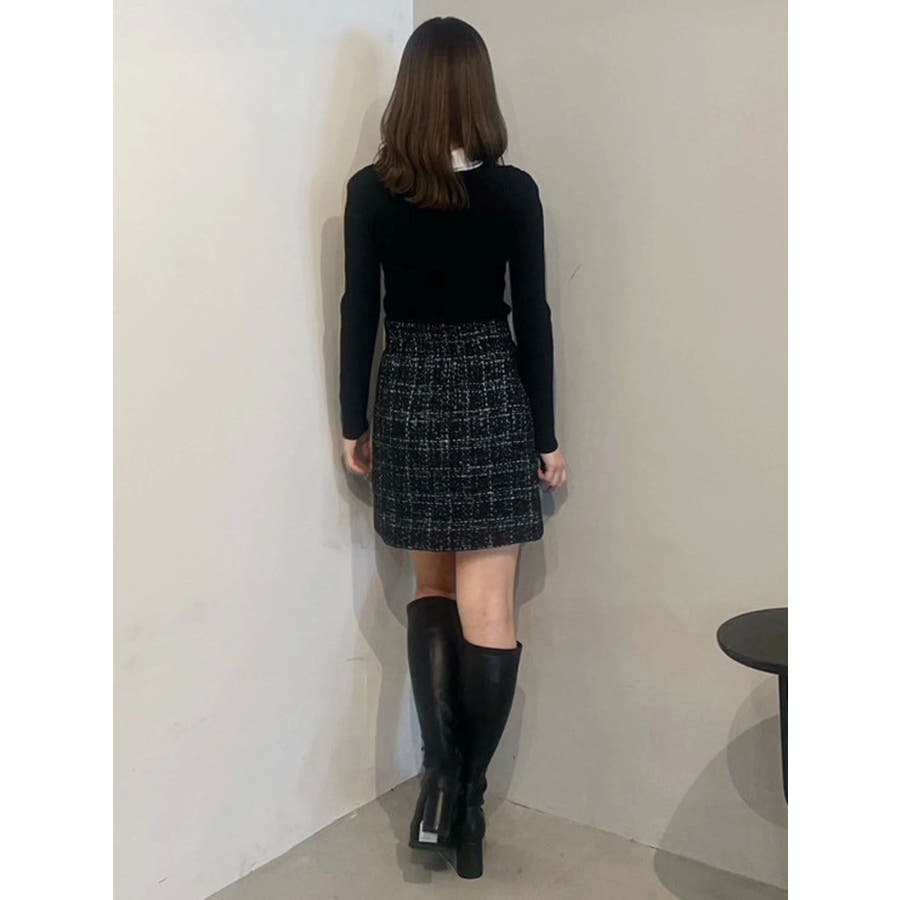 "ツイード素材をマーキュリーデュオオリジナルで糸からこだわって作りました。生地にはシルバーの糸をスラブ糸に撚って、全体が上品な輝きになるよう配色しました。スカートの丈感は足が一番きれいに見える丈で作り、広がりすぎないタイトシルエットの台形ミニスカート。どんなトップスとも合わせやすいスカートです。▼スタイリングセットアップコーデのできる、ノーカラージャケットとロングブーツを合わせたスタイリングがおすすめ。トップスはぴたっとしたニットから、フリルブラウスでリボンを見せてたスタイリングもトラディッショナルな雰囲気を演出できます◎ペプラムジャケットに合わせても◎※着用画像はすべてサンプルです。※ブラックの色、青みが強いですが全体的にブラック寄りの色になります。※SM着丈差3cm"