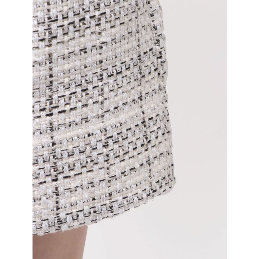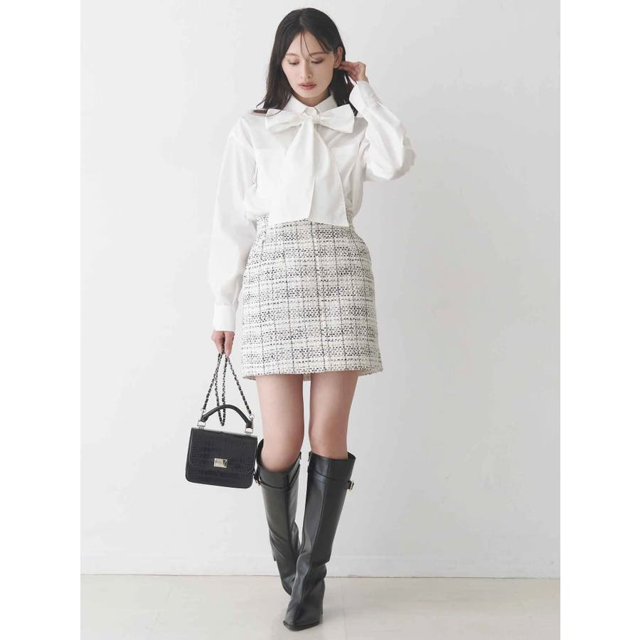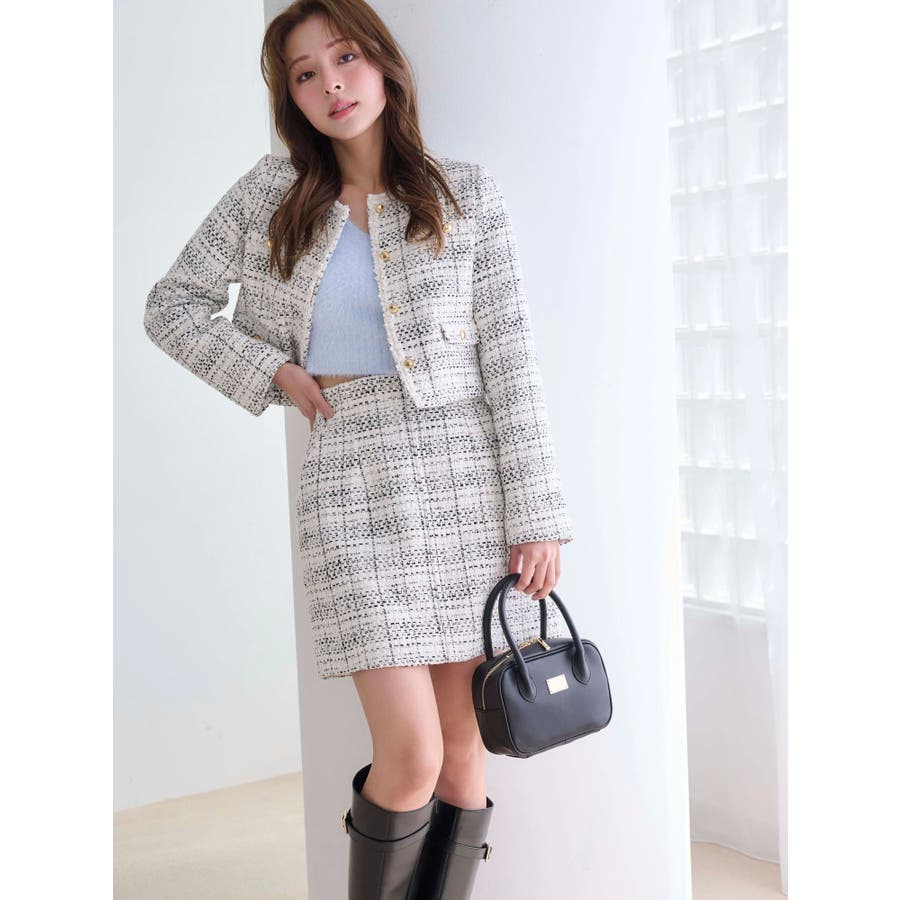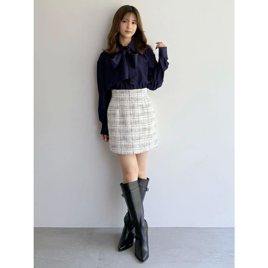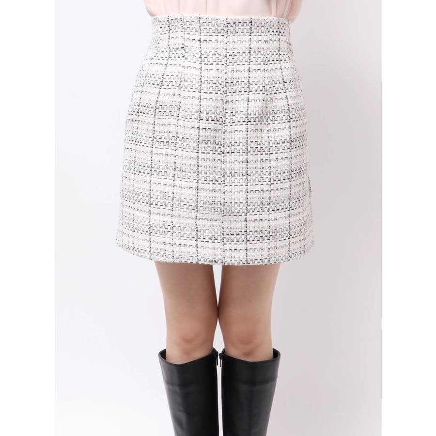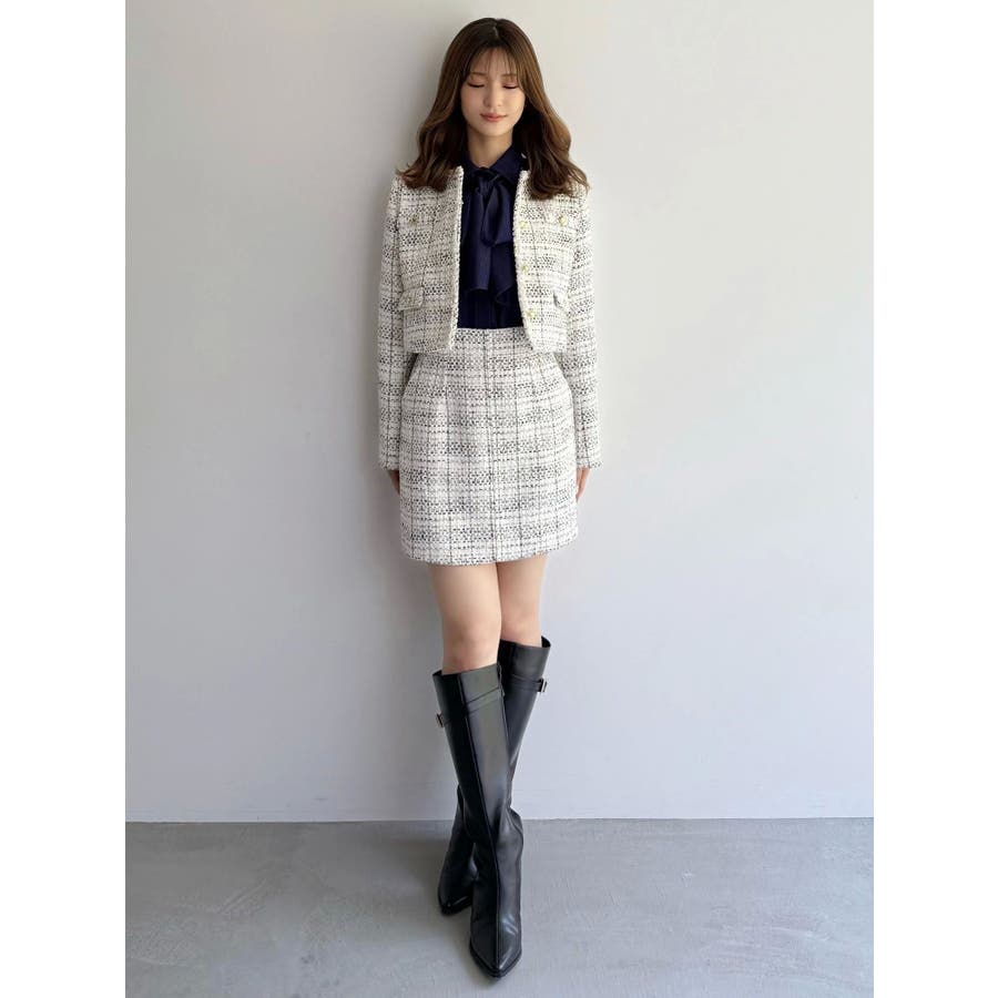"ツイード素材をマーキュリーデュオオリジナルで糸からこだわって作りました。生地にはシルバーの糸をスラブ糸に撚って、全体が上品な輝きになるよう配色しました。スカートの丈感は足が一番きれいに見える丈で作り、広がりすぎないタイトシルエットの台形ミニスカート。どんなトップスとも合わせやすいスカートです。▼スタイリングセットアップコーデのできる、ノーカラージャケットとロングブーツを合わせたスタイリングがおすすめ。トップスはぴたっとしたニットから、フリルブラウスでリボンを見せてたスタイリングもトラディッショナルな雰囲気を演出できます◎ペプラムジャケットに合わせても◎※着用画像はすべてサンプルです。※ブラックの色、青みが強いですが全体的にブラック寄りの色になります。※SM着丈差3cm"