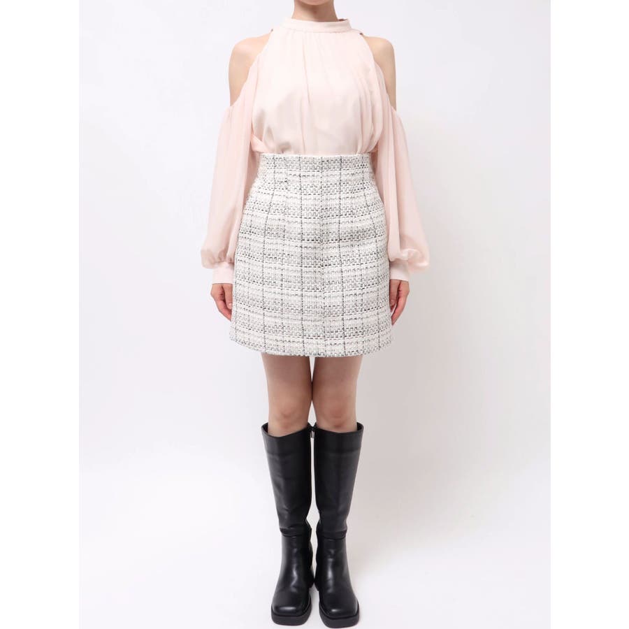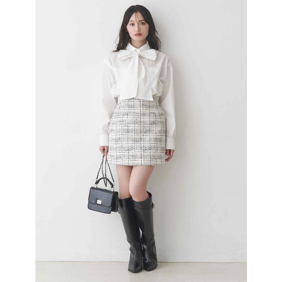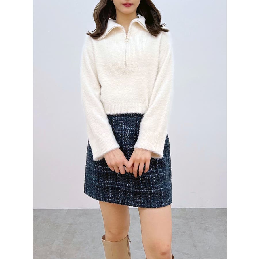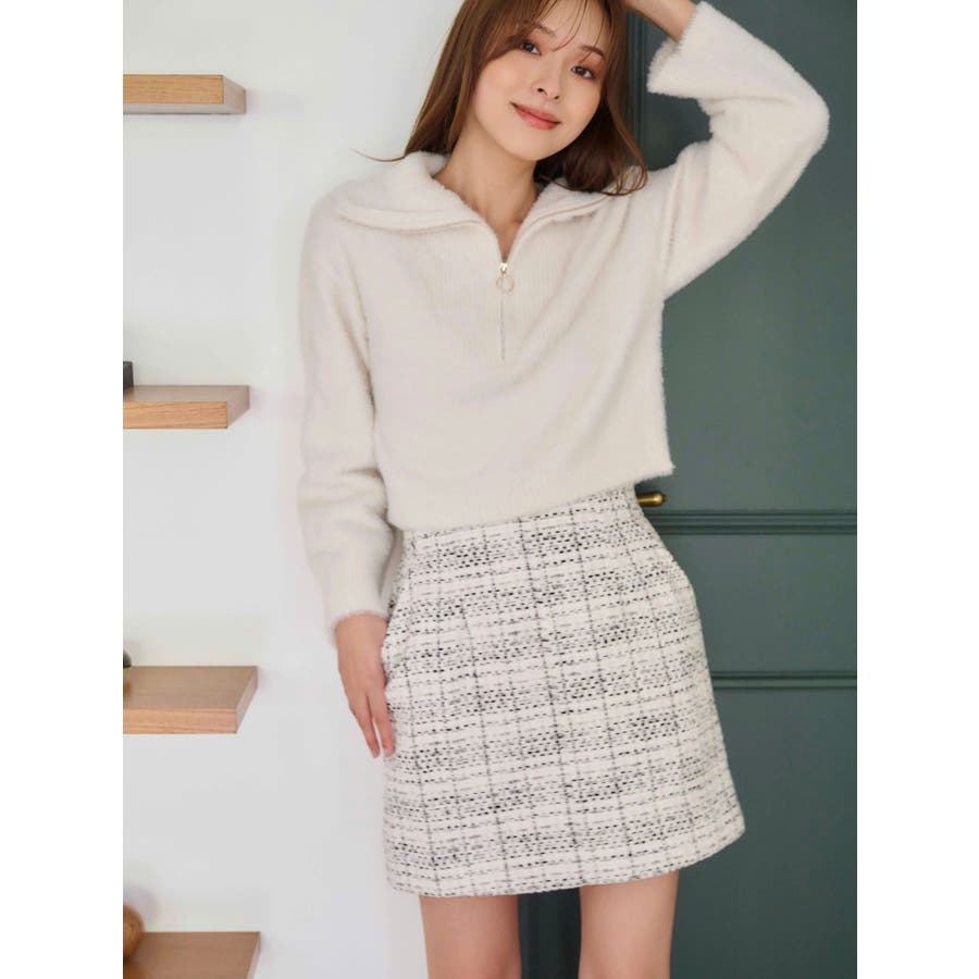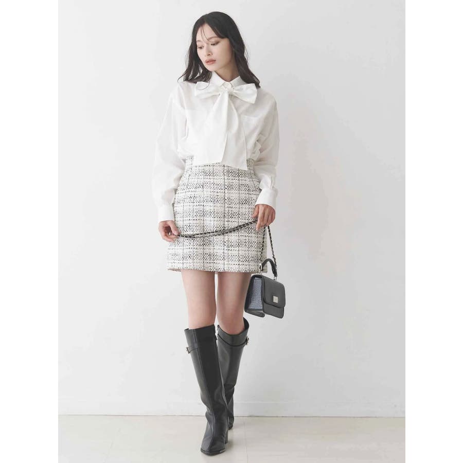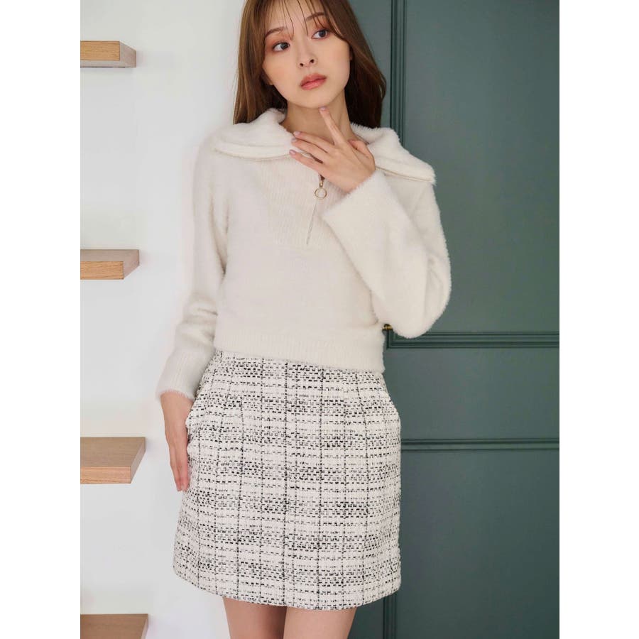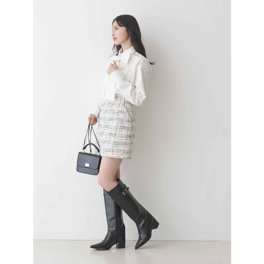 "ツイード素材をマーキュリーデュオオリジナルで糸からこだわって作りました。生地にはシルバーの糸をスラブ糸に撚って、全体が上品な輝きになるよう配色しました。スカートの丈感は足が一番きれいに見える丈で作り、広がりすぎないタイトシルエットの台形ミニスカート。どんなトップスとも合わせやすいスカートです。▼スタイリングセットアップコーデのできる、ノーカラージャケットとロングブーツを合わせたスタイリングがおすすめ。トップスはぴたっとしたニットから、フリルブラウスでリボンを見せてたスタイリングもトラディッショナルな雰囲気を演出できます◎ペプラムジャケットに合わせても◎※着用画像はすべてサンプルです。※ブラックの色、青みが強いですが全体的にブラック寄りの色になります。※SM着丈差3cm"
