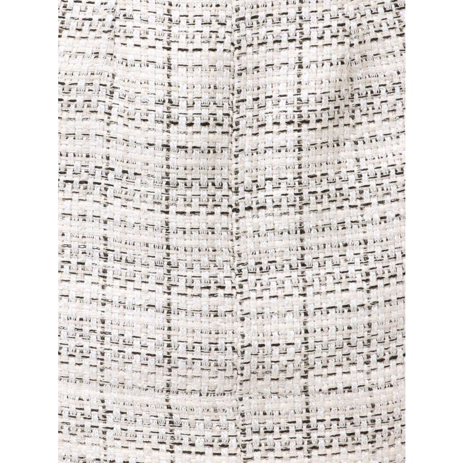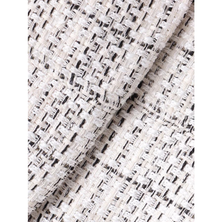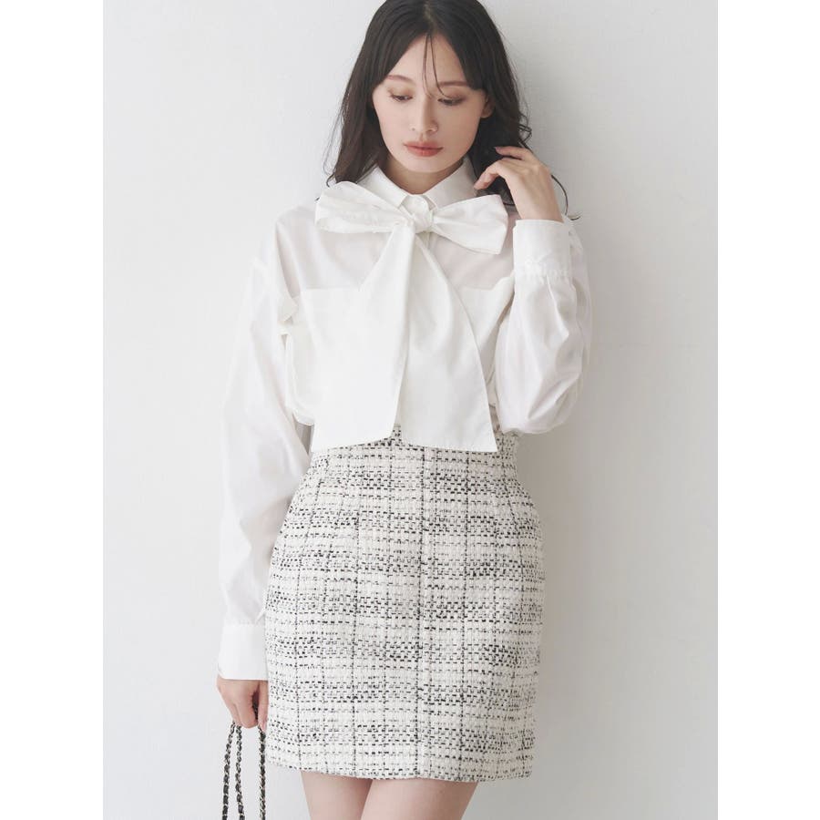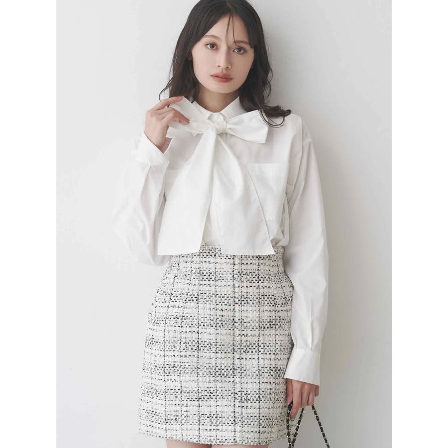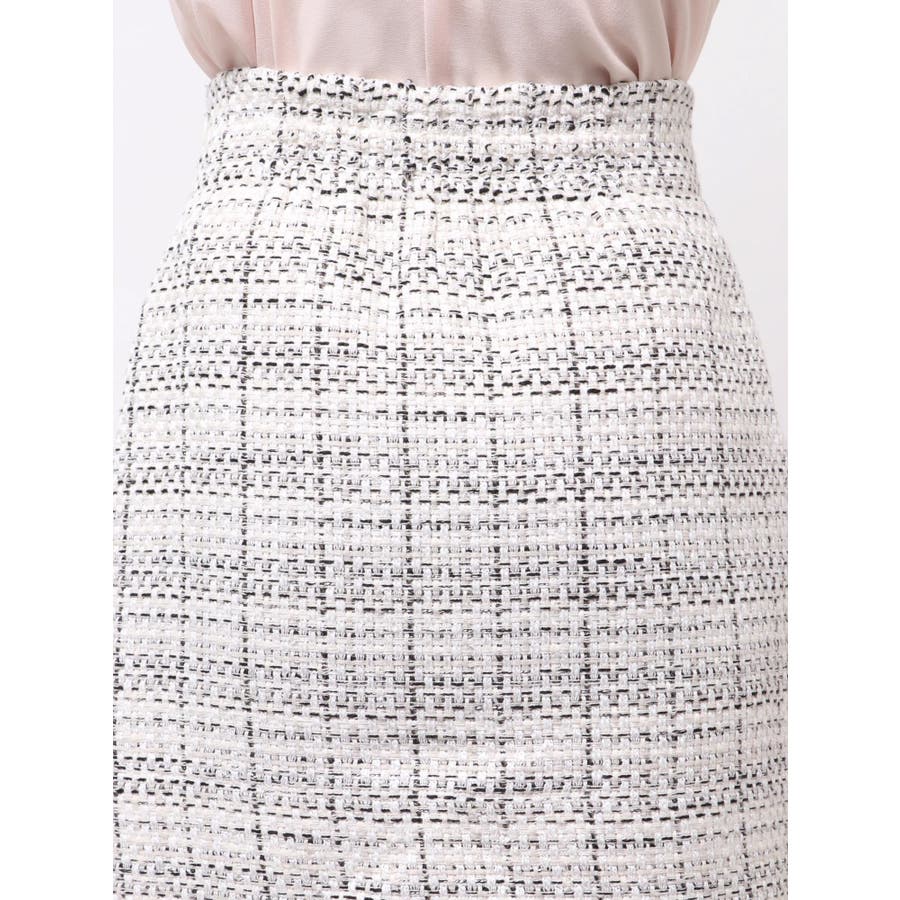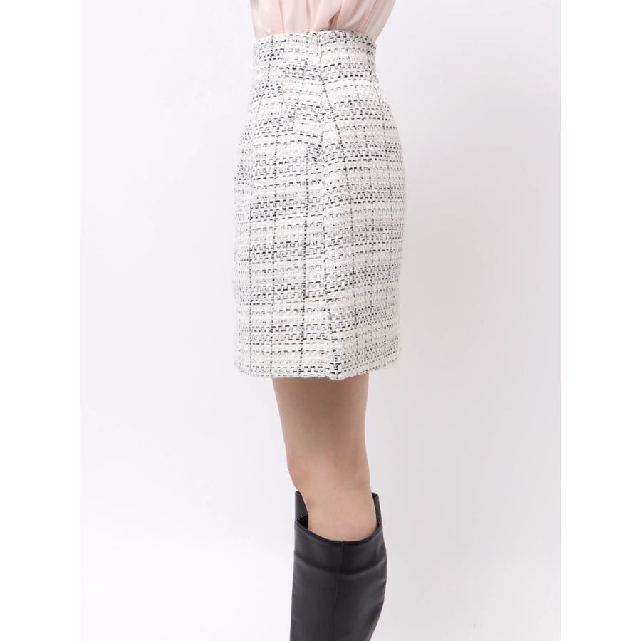 "ツイード素材をマーキュリーデュオオリジナルで糸からこだわって作りました。生地にはシルバーの糸をスラブ糸に撚って、全体が上品な輝きになるよう配色しました。スカートの丈感は足が一番きれいに見える丈で作り、広がりすぎないタイトシルエットの台形ミニスカート。どんなトップスとも合わせやすいスカートです。▼スタイリングセットアップコーデのできる、ノーカラージャケットとロングブーツを合わせたスタイリングがおすすめ。トップスはぴたっとしたニットから、フリルブラウスでリボンを見せてたスタイリングもトラディッショナルな雰囲気を演出できます◎ペプラムジャケットに合わせても◎※着用画像はすべてサンプルです。※ブラックの色、青みが強いですが全体的にブラック寄りの色になります。※SM着丈差3cm"