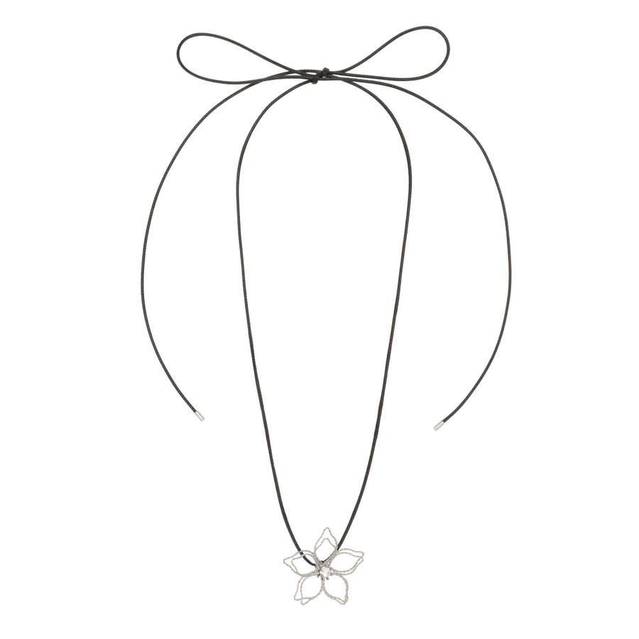 金属で作った繊細なフラワーモチーフを蝋引きの紐に通したチョーカーです。チョーカーの先端に金具を付けることでモチーフが抜けないようになっています。首に巻き付けて蝶々結びをして付けたり、紐を結ばずに垂らしたりとお好みに合わせて巻き方を変えることができます。※写真はすべてサンプルです。※詳細画像が正しい仕様となります。