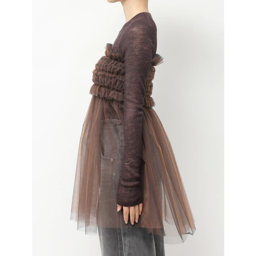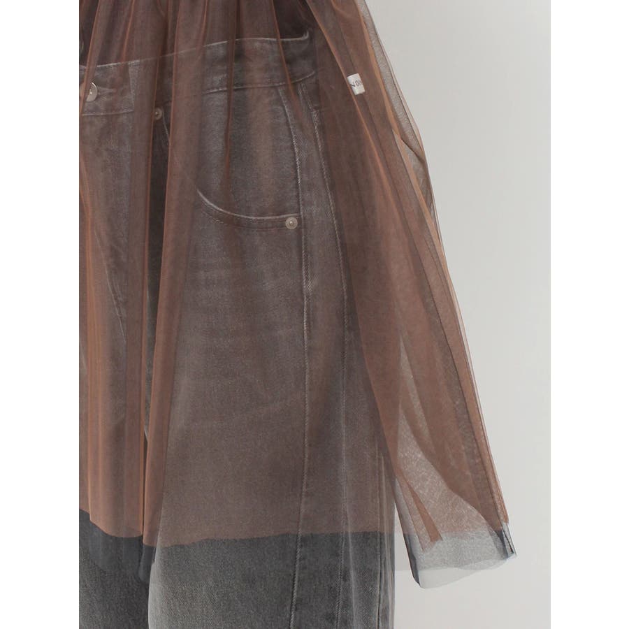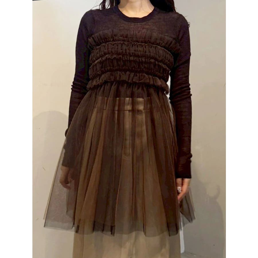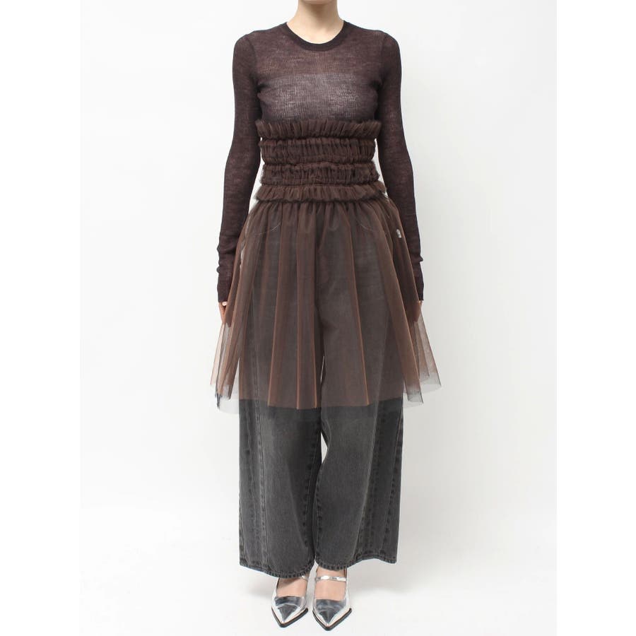 繊細なチュールを配色で二枚重ねに仕立て、深みのあるニュアンスを宿したマルチユースアイテム。ビスチェのように纏ったり、スカートとしてレイヤードしたり、パンツやニットの上からさりげなく覗かせるなど、自在にスタイリングが楽しめます。モードな重ね着に洗練された表情を添える、大人のための一枚です。※着用画像は全てサンプルです。※詳細画像が正しい仕様となります。※着用画像はフラッシュの加減で実際の製品と色味等が異なる場合がございますので、生地のズームアップ画像をご確認ください。※ご利用の端末画面の設定により実際の商品と色味が異なる場合がございます。【商品特徴】透け感:あり伸縮性:なし生地の厚さ:薄手サイズ感:普通裏地:なしポケット:なし