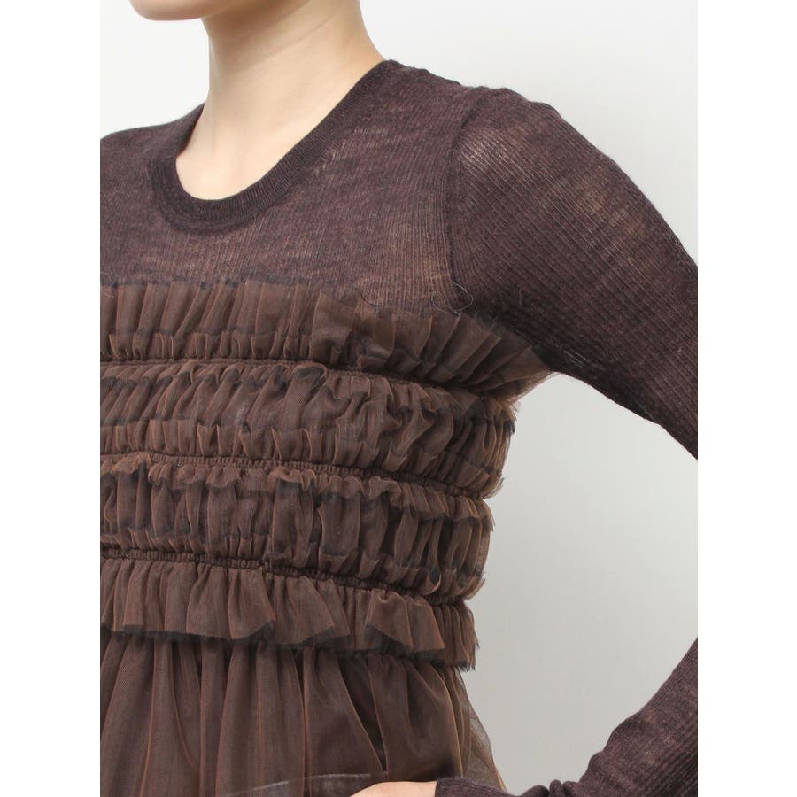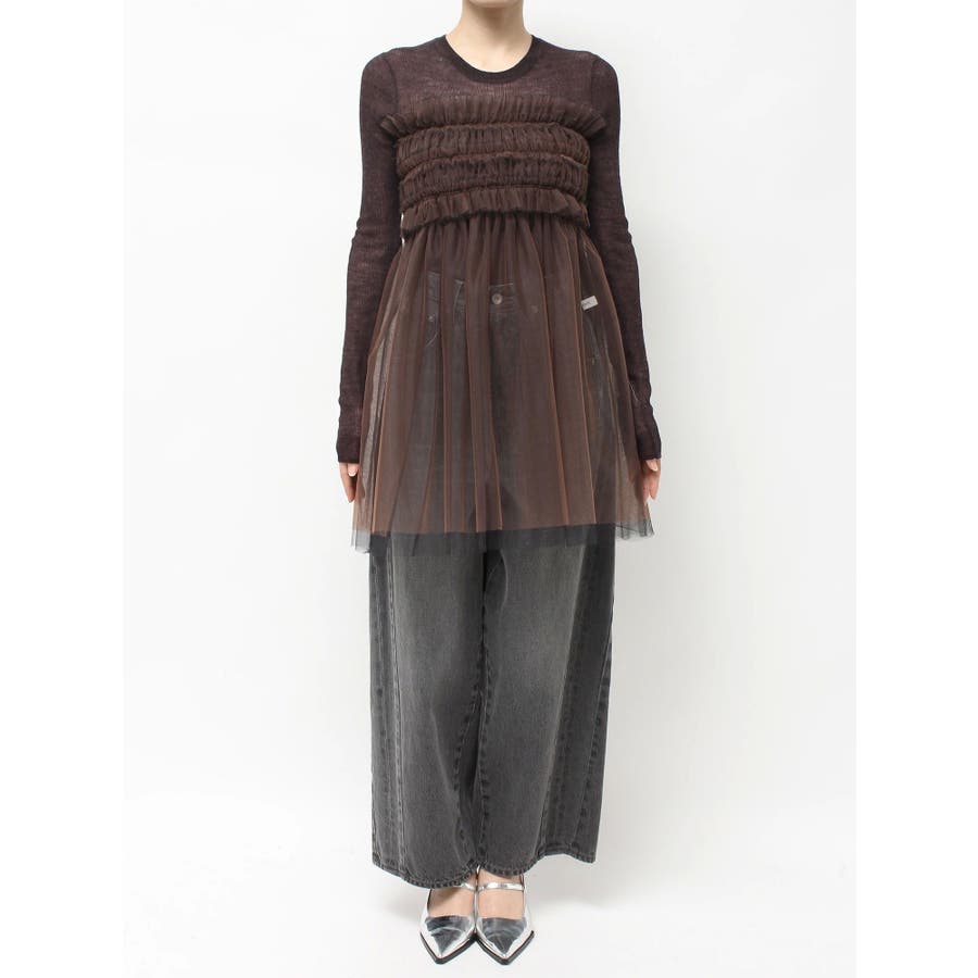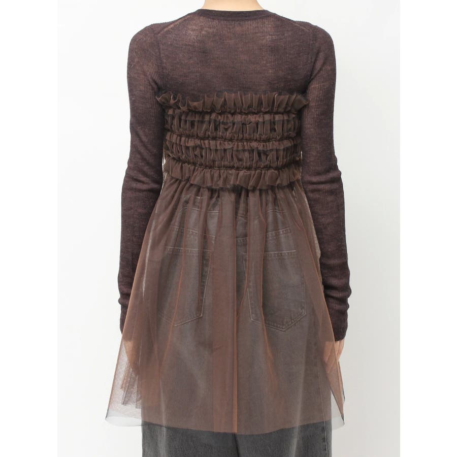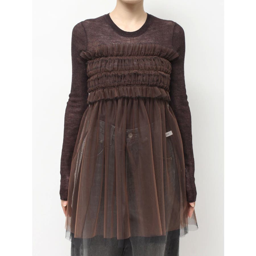 繊細なチュールを配色で二枚重ねに仕立て、深みのあるニュアンスを宿したマルチユースアイテム。ビスチェのように纏ったり、スカートとしてレイヤードしたり、パンツやニットの上からさりげなく覗かせるなど、自在にスタイリングが楽しめます。モードな重ね着に洗練された表情を添える、大人のための一枚です。※着用画像は全てサンプルです。※詳細画像が正しい仕様となります。※着用画像はフラッシュの加減で実際の製品と色味等が異なる場合がございますので、生地のズームアップ画像をご確認ください。※ご利用の端末画面の設定により実際の商品と色味が異なる場合がございます。【商品特徴】透け感:あり伸縮性:なし生地の厚さ:薄手サイズ感:普通裏地:なしポケット:なし