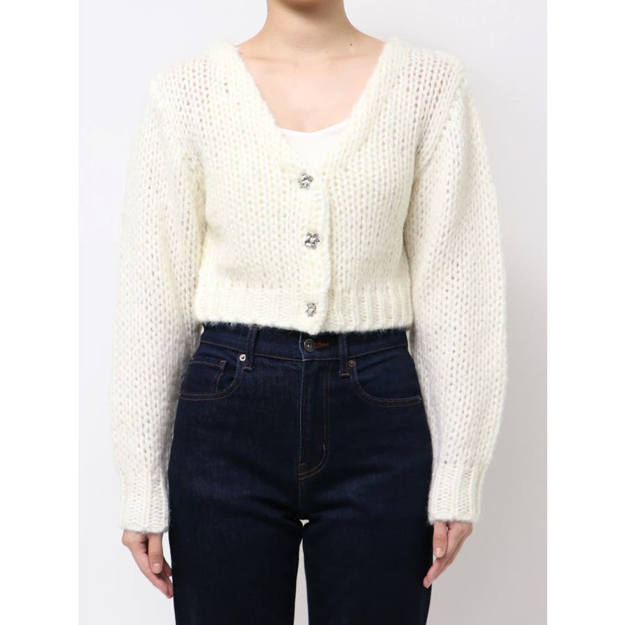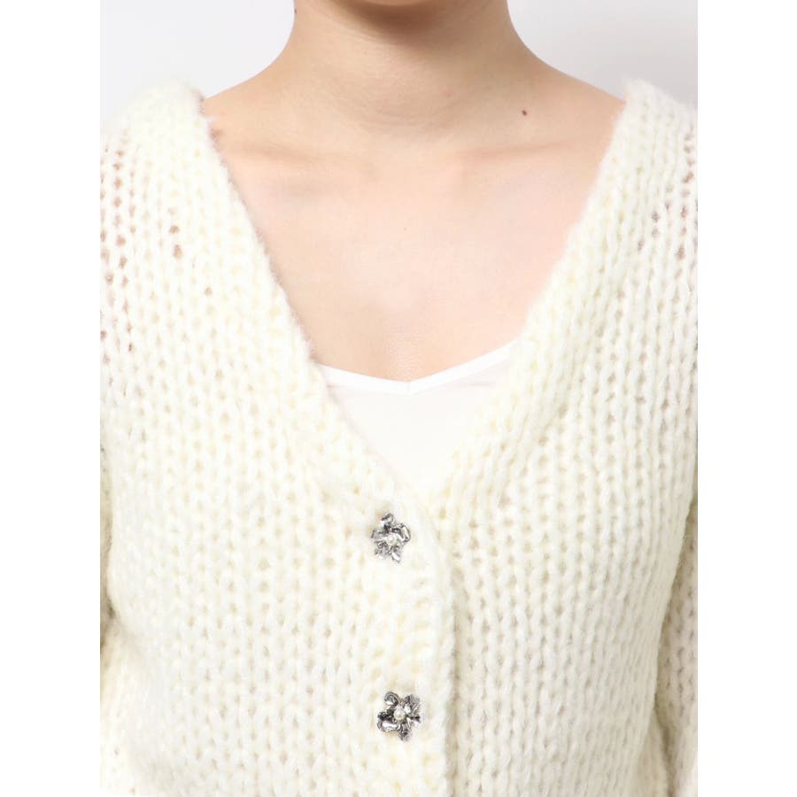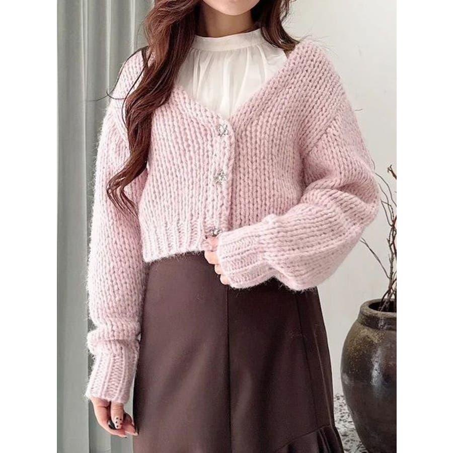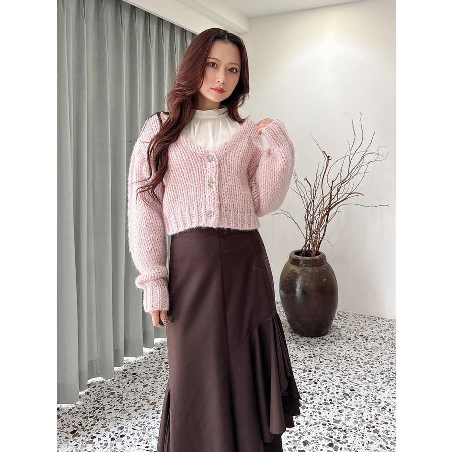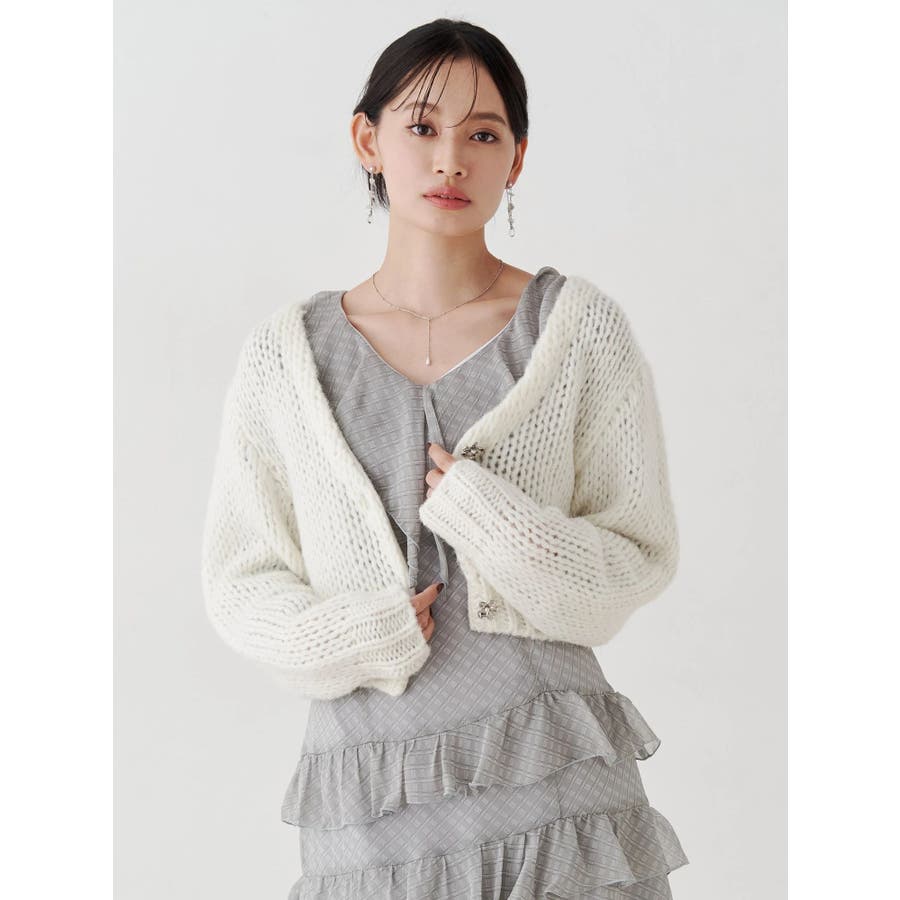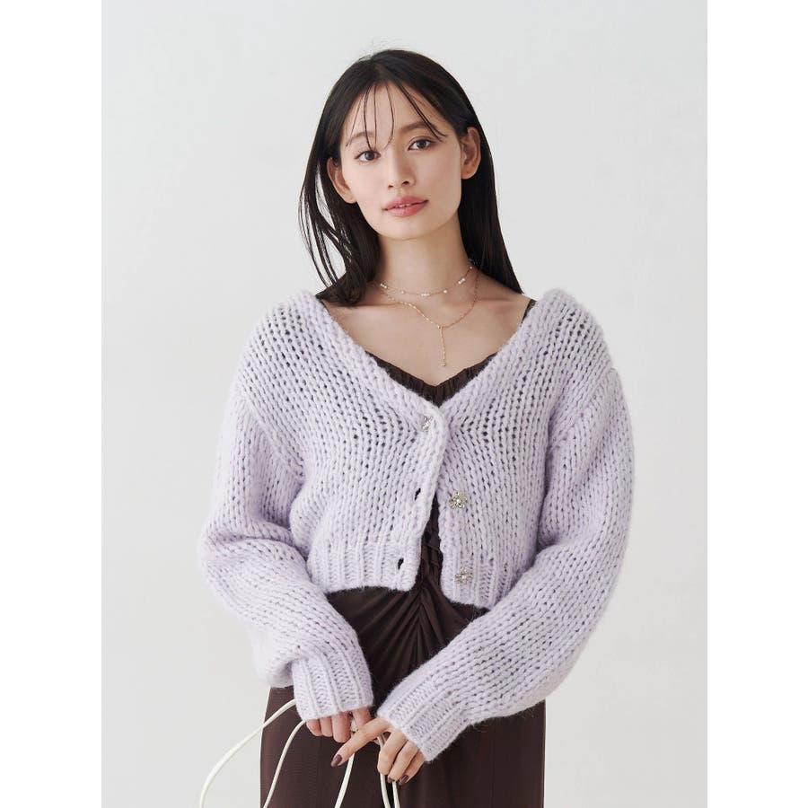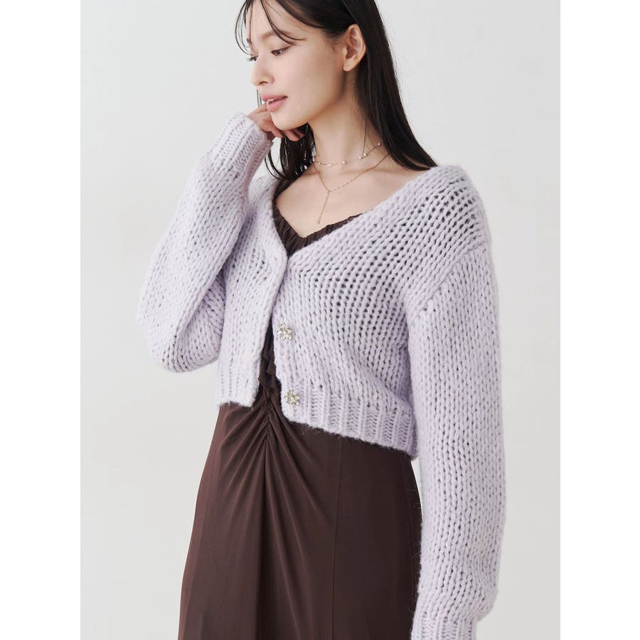 ふわっとした太めの糸でざっくりと編み上げた、冬のムードを高めてくれるローゲージカーディガン。 手編みのようなあたたかみのある風合いで、羽織るだけで優しい雰囲気に仕上がります。 短丈シルエットなので、ワンピースとのバランスも取りやすく、スタイルアップ効果も◎。 フロントにはさりげなく光るフラワーモチーフの金属ボタンをあしらい、シンプルながらも女らしい華やかさをプラスしました。 MERCURYDUO(マーキュリーデュオ)らしい柔らかなパステルカラーの展開で、冬のコーディネートに甘さと軽やかさを添えてくれる1枚です。 ▼スタイリング ワンピースの羽織として合わせたり、シンプルリブニットにレイヤードしたりするのがおすすめです。 柔らかい素材なのでボリュームがあってもアウターの中に合わせやすいカーディガンです。※着用画像はフラッシュの加減で実際の製品と色味等が異なる場合がございますので、生地のズームアップ画像をご確認ください。※ご利用の端末画面の設定により実際の商品と色味が異なる場合がございます。【商品特徴】透け感:なし伸縮性:あり生地の厚さ:普通サイズ感:普通裏地:なしポケット:なし