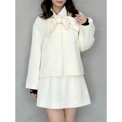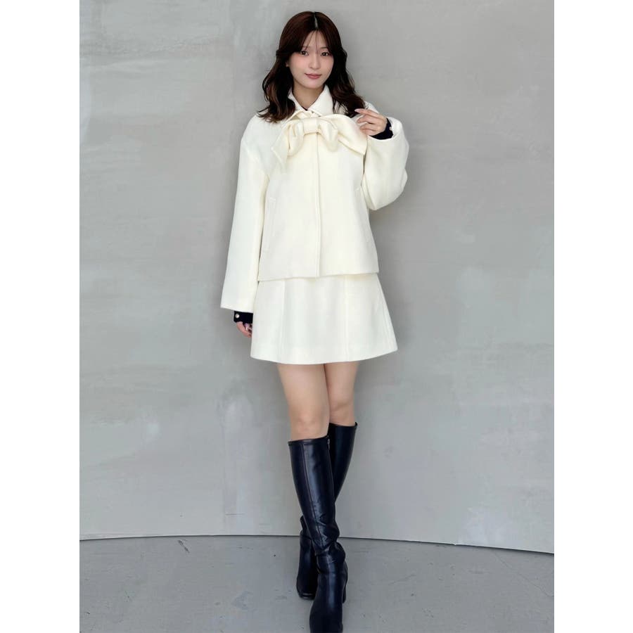 春カラーで冬コーデを明るく彩る、ショートコート。 国内生産の上質なウール生地を贅沢に使い、冬のスタイリングに春の軽やかさをひとさじ加えました。 ふんわり柔らかな春カラーが、暗くなりがちな季節のアウターコーデをぱっと華やかに見せてくれます。 ステンカラーにあしらった大きめリボンは、取り外し可能なデザイン。 その日の気分やスタイリングに合わせて、“甘さを足す or 引く”が自由に楽しめます。 ドロップショルダーでゆるっとしたフォルムに加え、横から見ると丸みのあるコクーンシルエットがかわいらしさを引き立てる一枚。 着脱はスナップボタン仕様で、すっきりとした印象に仕上げています。 ▼スタイリング 同素材のミニボトムとセットアップで着れば、統一感のある洗練スタイルが完成します。