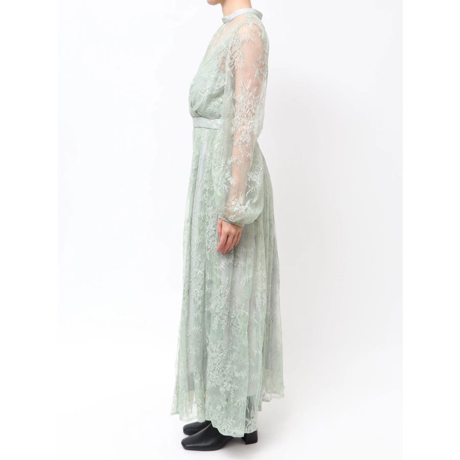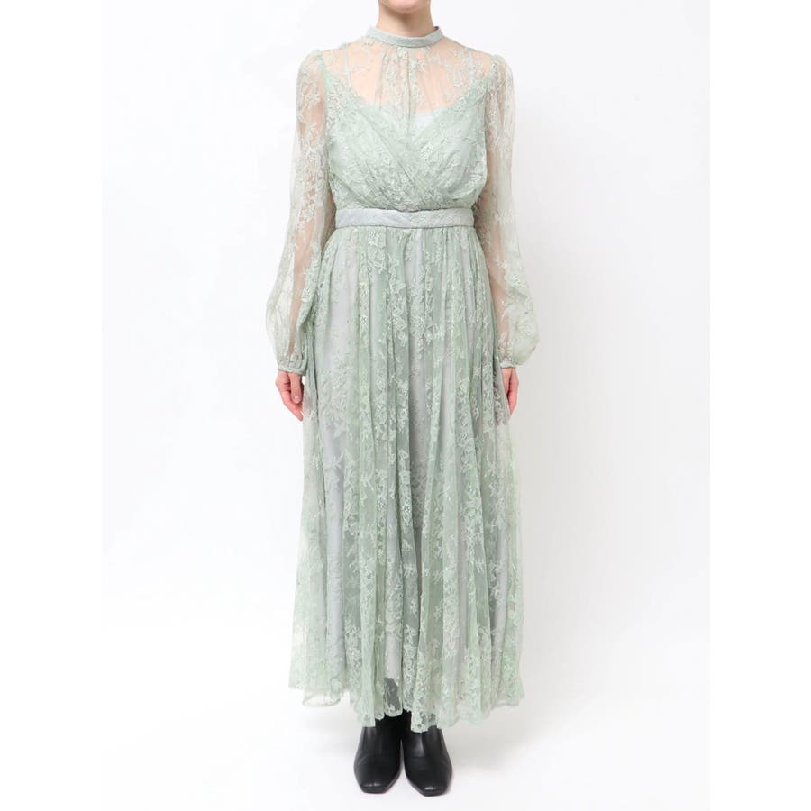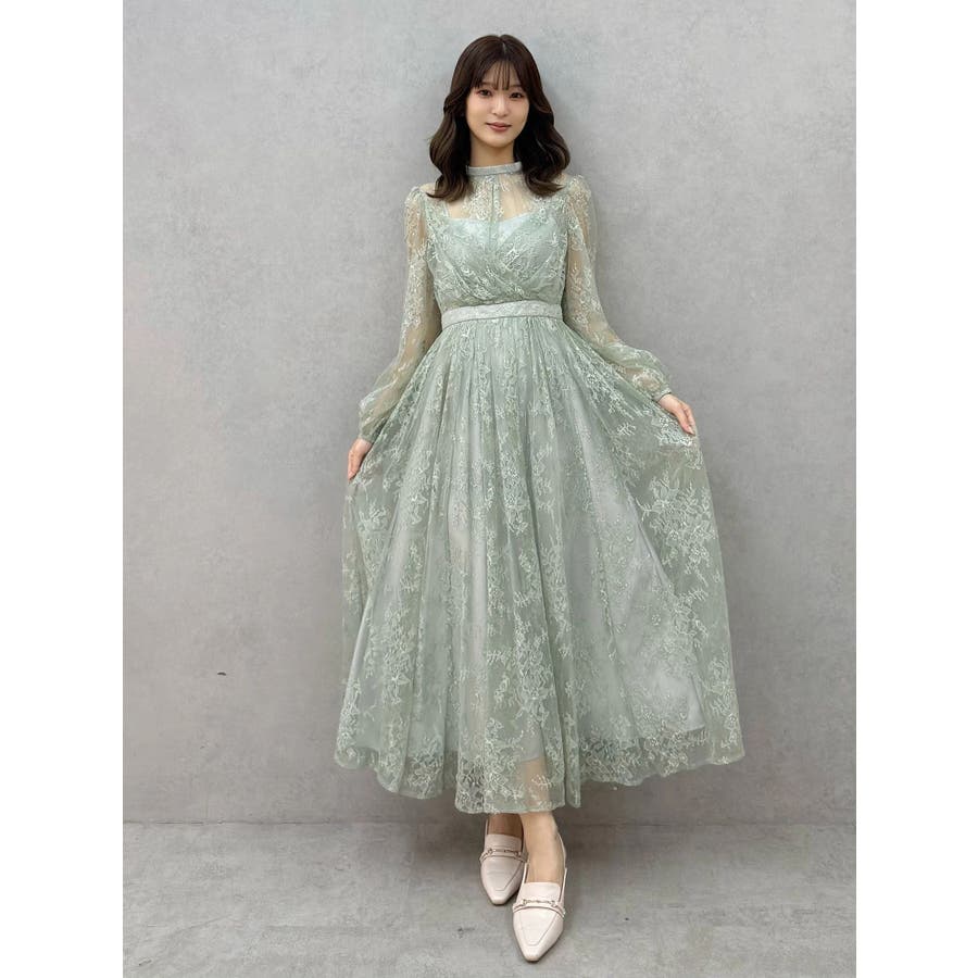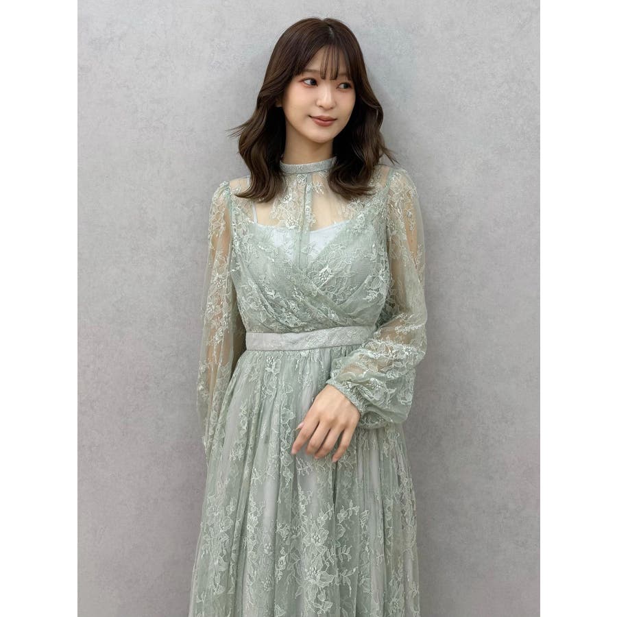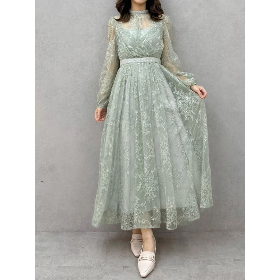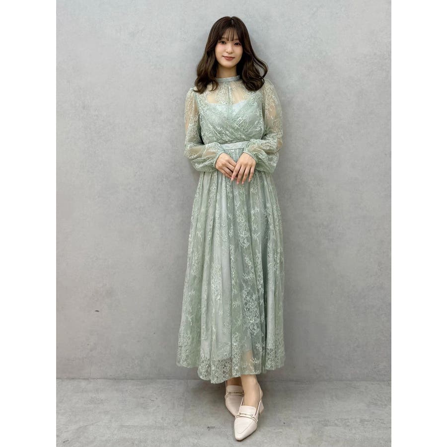 繊細なレースを贅沢に使用した、大人っぽいロングドレス。ハイネックデザインながら、胸元はカシュクール仕立てでレースを重ね、立体感と華やかさをプラスしました。ウエストは高めの位置で切り替え、スタイルアップ効果も抜群。スカート部分にはたっぷりとギャザーを寄せながらも、腰位置では広がりすぎない絶妙なシルエットに仕上げています。歩くたびにレースが軽やかに揺れ、女性らしさを引き立てる一枚。大人っぽいグリーンと、柔らかな印象のベージュの2色展開で、イベントシーズンにも映える華やかなドレスです。▼スタイリング ハイネックデザインなので、アップヘアにして大振りのピアスなど、アクセサリーでポイントにするのがおすすめです。※画像は全てサンプルです。※SM着丈差7cm※ベージュの裏地はもう少しピンク味が強くなります。