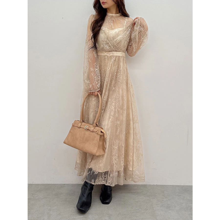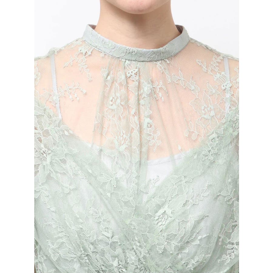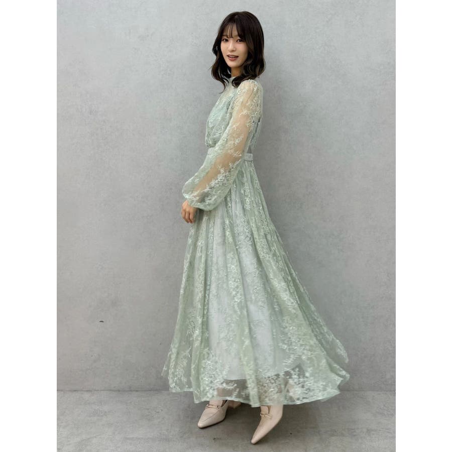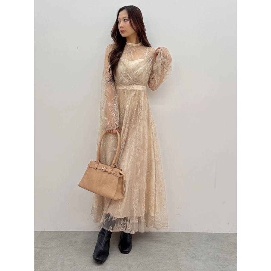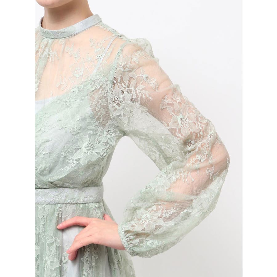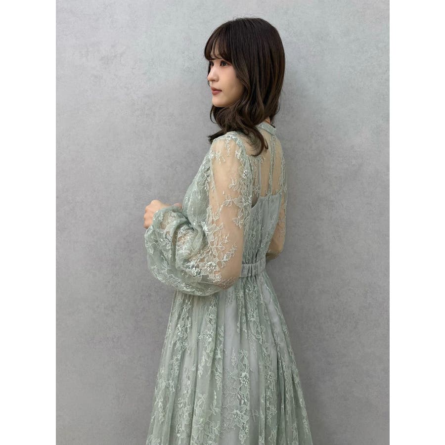 繊細なレースを贅沢に使用した、大人っぽいロングドレス。ハイネックデザインながら、胸元はカシュクール仕立てでレースを重ね、立体感と華やかさをプラスしました。ウエストは高めの位置で切り替え、スタイルアップ効果も抜群。スカート部分にはたっぷりとギャザーを寄せながらも、腰位置では広がりすぎない絶妙なシルエットに仕上げています。歩くたびにレースが軽やかに揺れ、女性らしさを引き立てる一枚。大人っぽいグリーンと、柔らかな印象のベージュの2色展開で、イベントシーズンにも映える華やかなドレスです。▼スタイリング ハイネックデザインなので、アップヘアにして大振りのピアスなど、アクセサリーでポイントにするのがおすすめです。※画像は全てサンプルです。※SM着丈差7cm※ベージュの裏地はもう少しピンク味が強くなります。