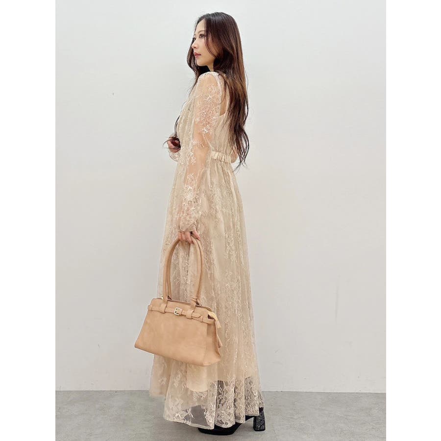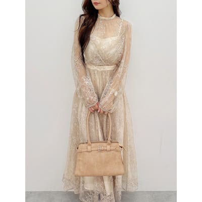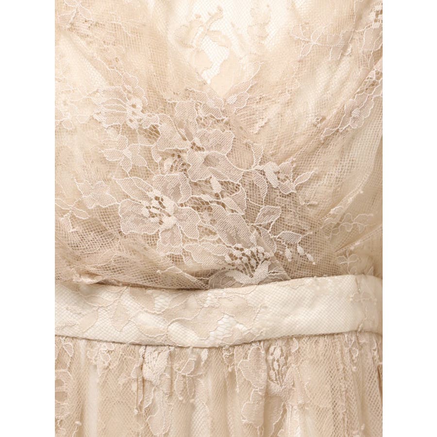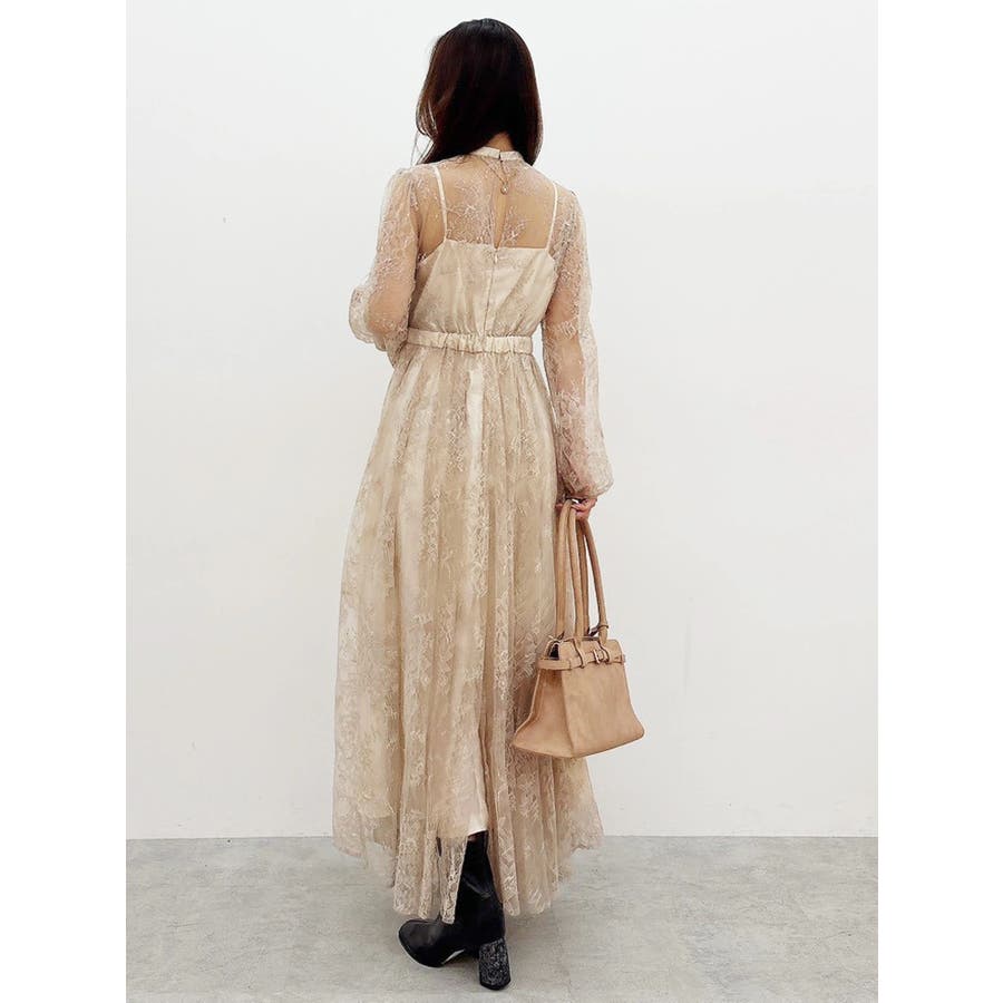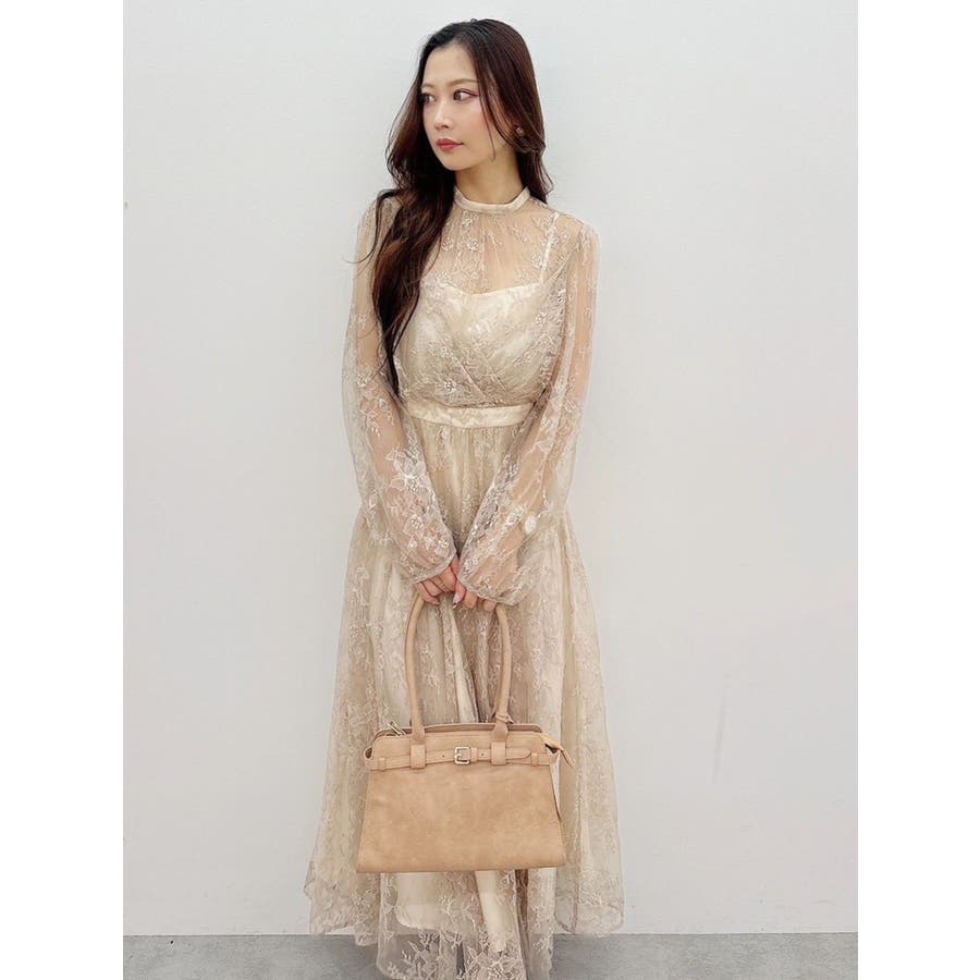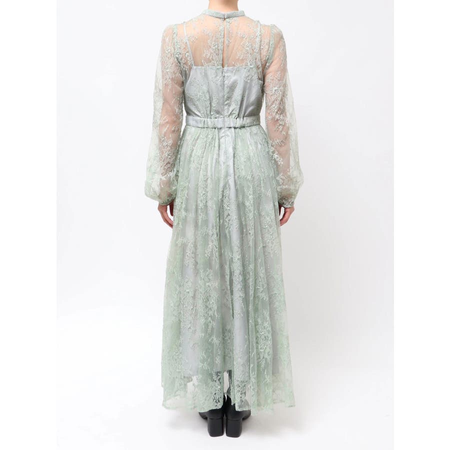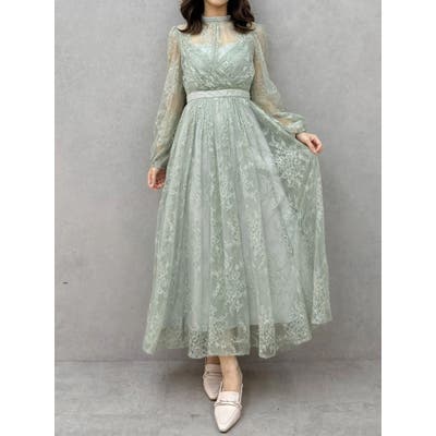 繊細なレースを贅沢に使用した、大人っぽいロングドレス。ハイネックデザインながら、胸元はカシュクール仕立てでレースを重ね、立体感と華やかさをプラスしました。ウエストは高めの位置で切り替え、スタイルアップ効果も抜群。スカート部分にはたっぷりとギャザーを寄せながらも、腰位置では広がりすぎない絶妙なシルエットに仕上げています。歩くたびにレースが軽やかに揺れ、女性らしさを引き立てる一枚。大人っぽいグリーンと、柔らかな印象のベージュの2色展開で、イベントシーズンにも映える華やかなドレスです。▼スタイリング ハイネックデザインなので、アップヘアにして大振りのピアスなど、アクセサリーでポイントにするのがおすすめです。※画像は全てサンプルです。※SM着丈差7cm※ベージュの裏地はもう少しピンク味が強くなります。