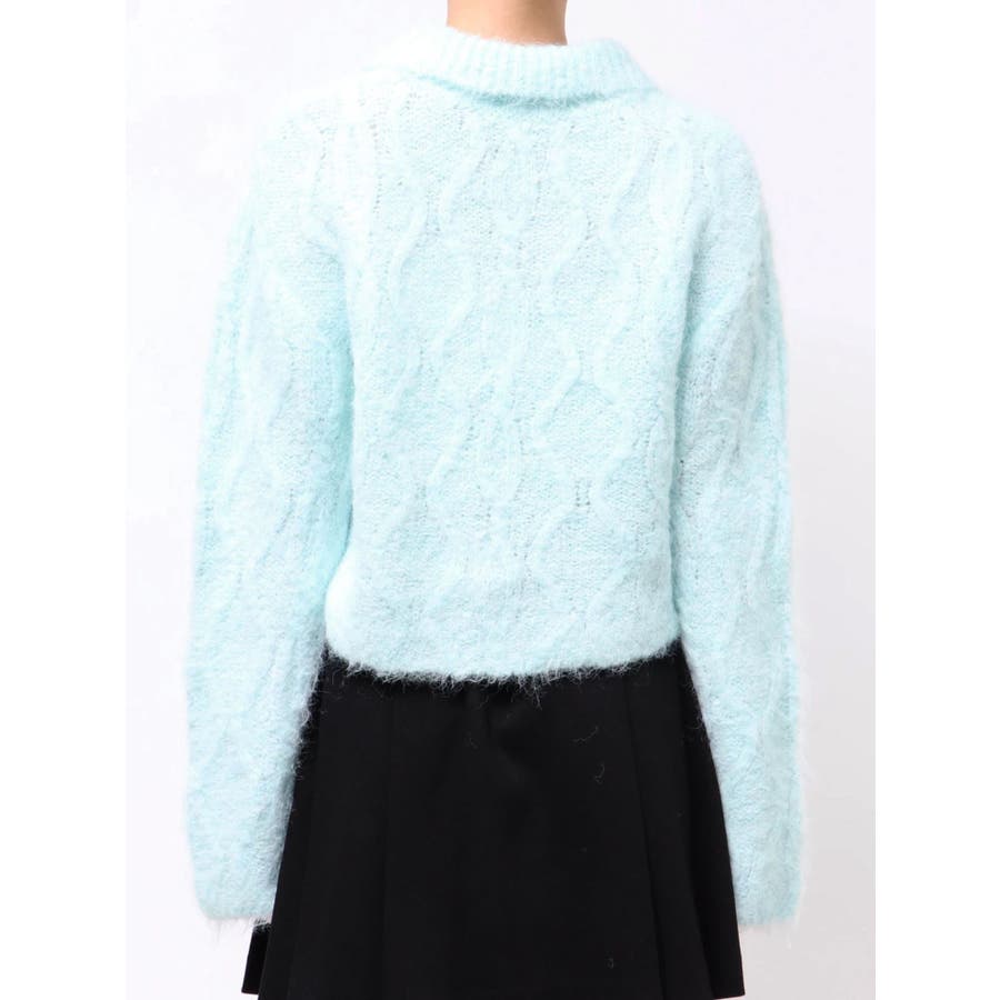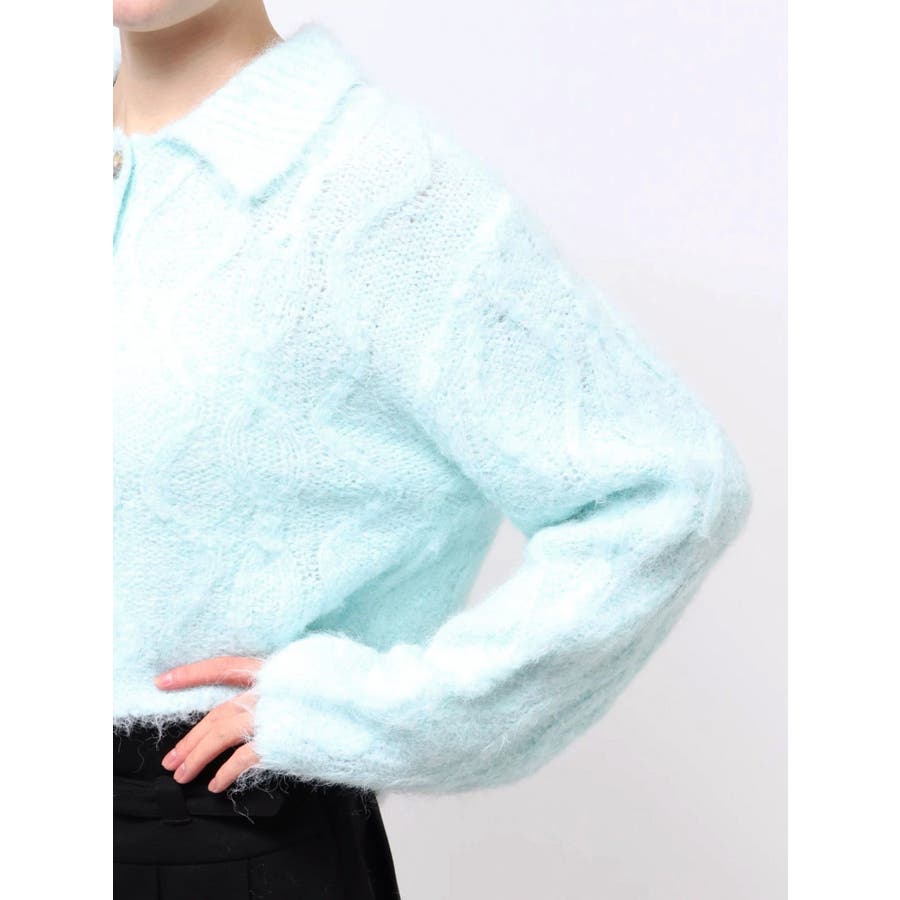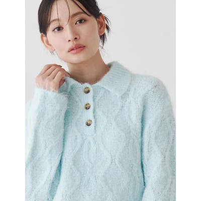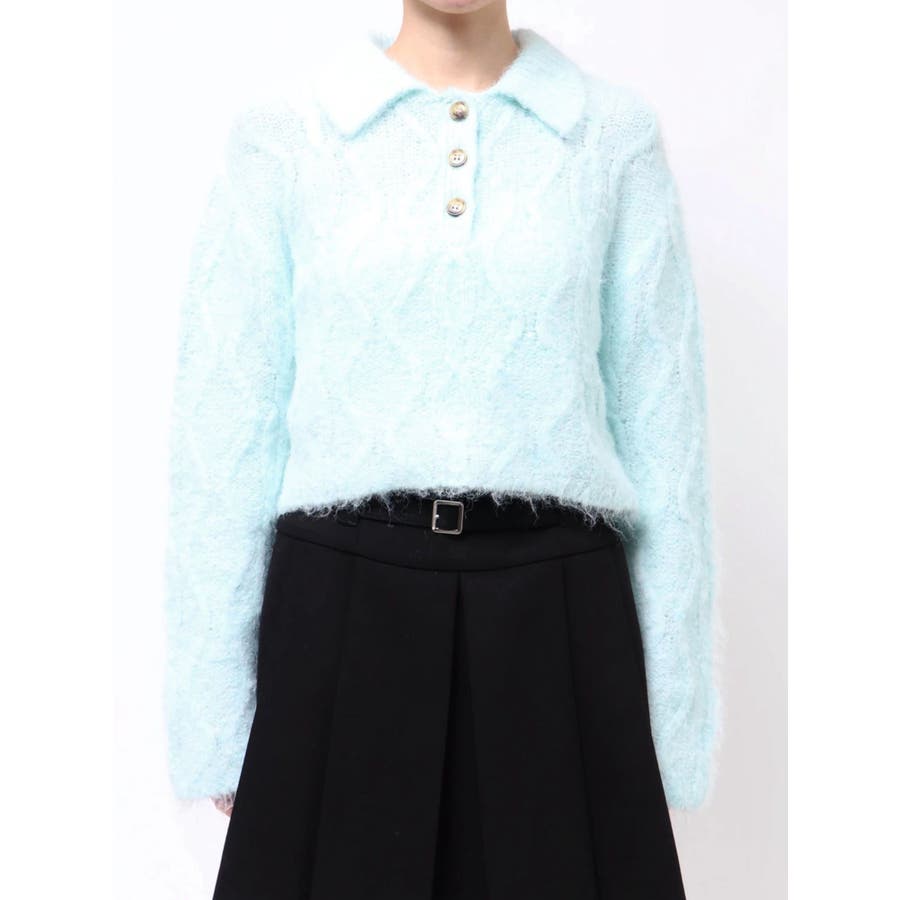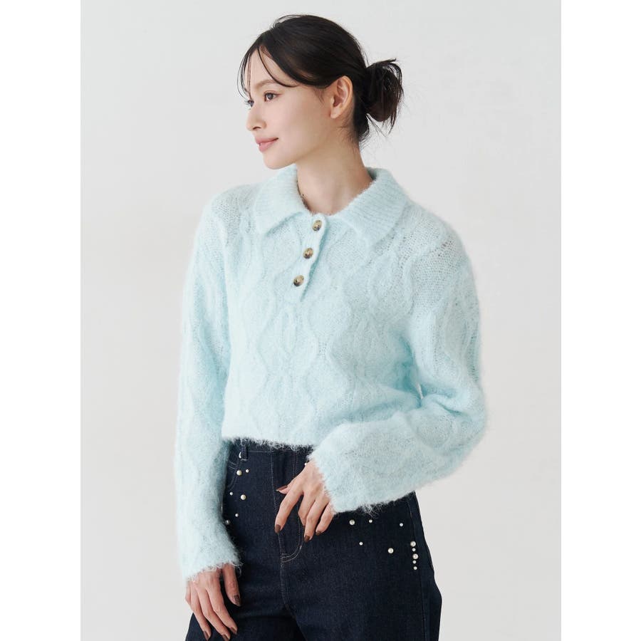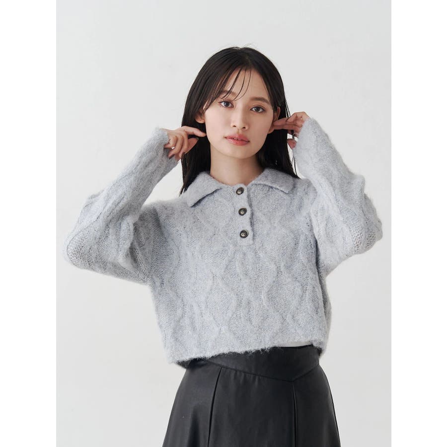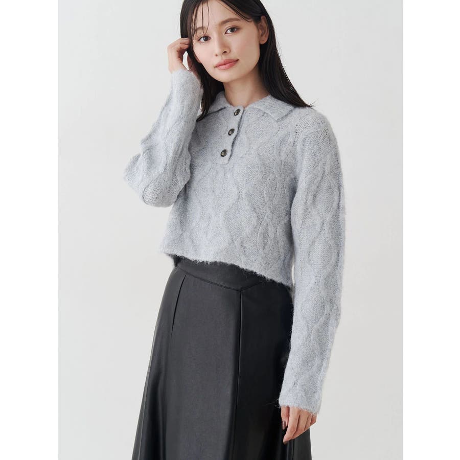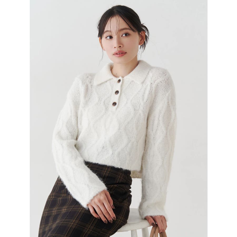 ふわふわな糸で編んだポフっとシルエットのポロ衿ニット。すっきりとした色合いに大き目のケーブル編みがカジュアルなあざとさを演出、ふわふらな糸で編んでいるので、着心地よく着用していただけます。 ▼スタイリング クロップド丈なので、裾はアウトして細見のスカート合わせがおすすめ。パンツと合わせる際は、ミュールで女っぽく◎ ※着用画像は全てサンプルです。