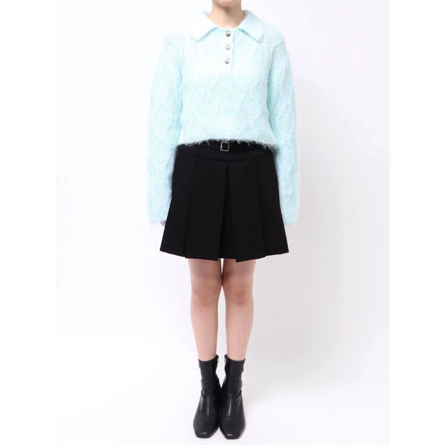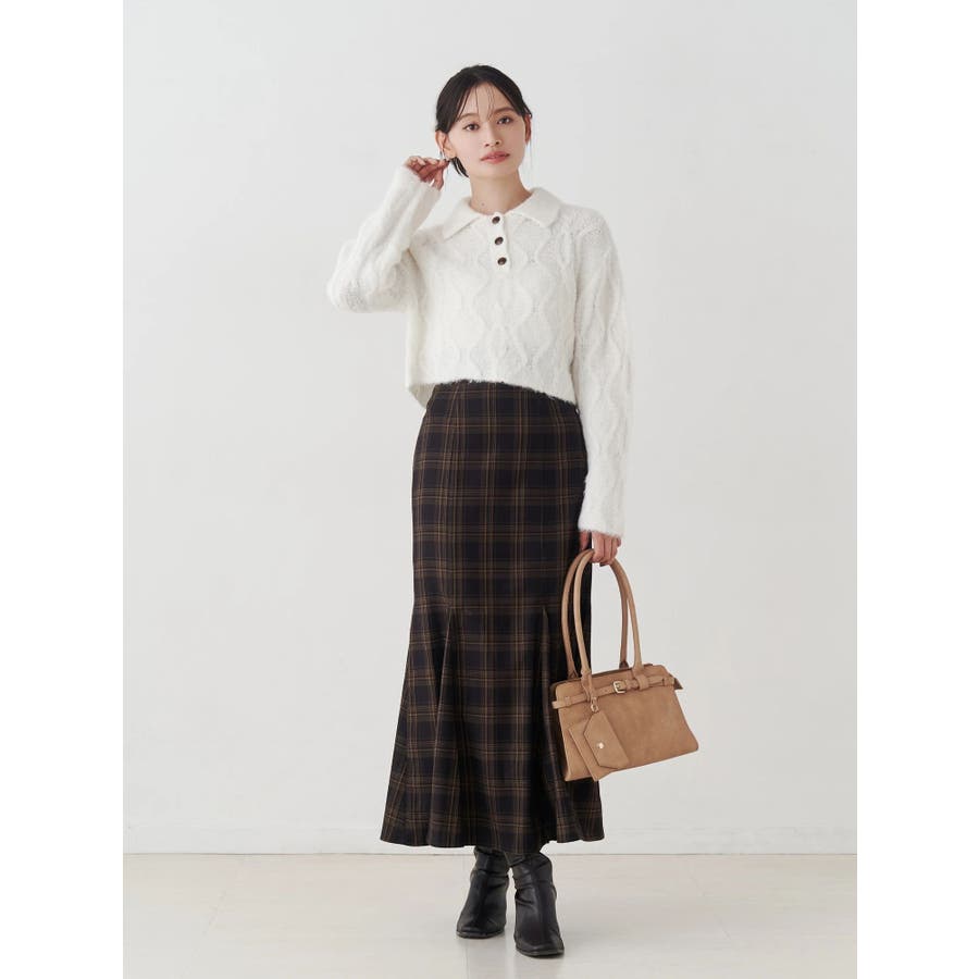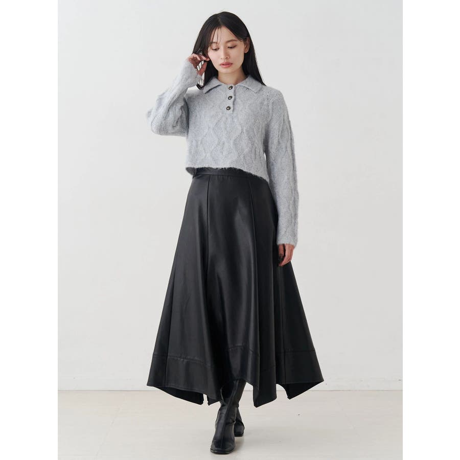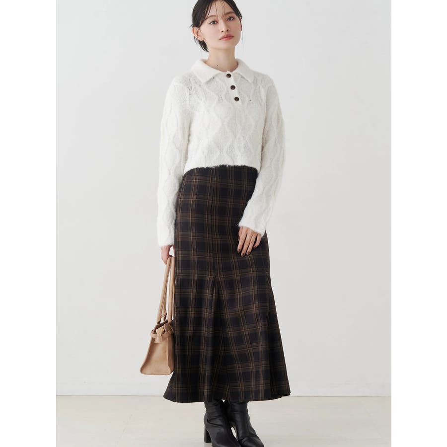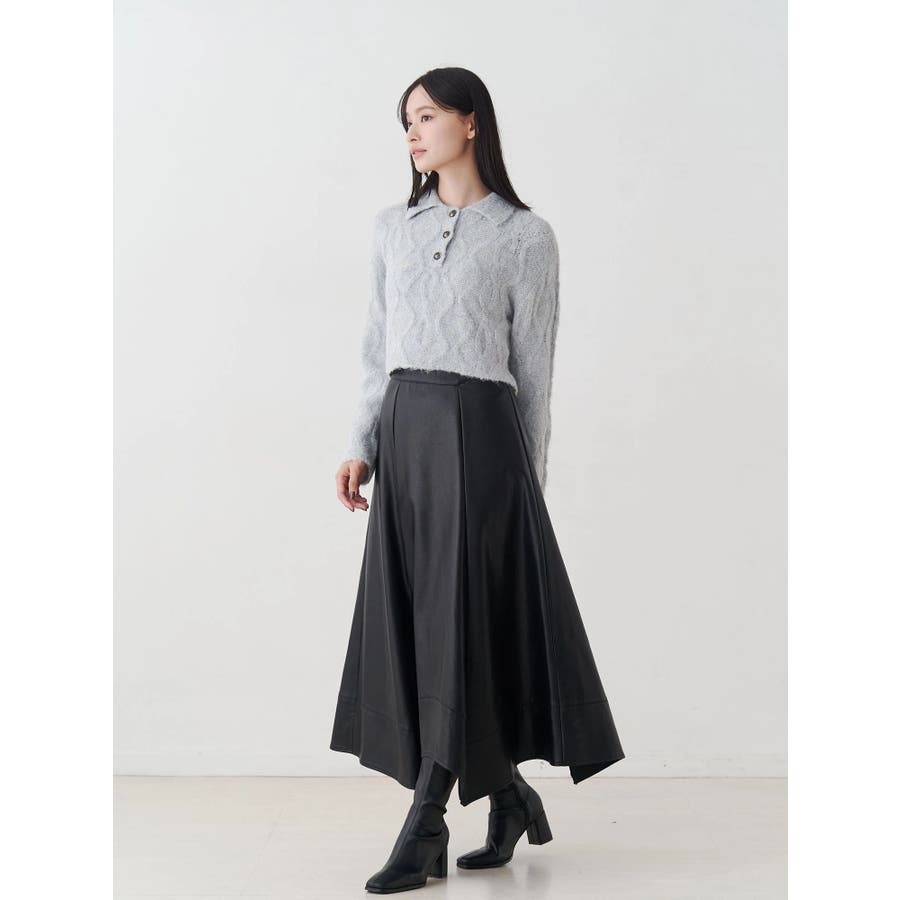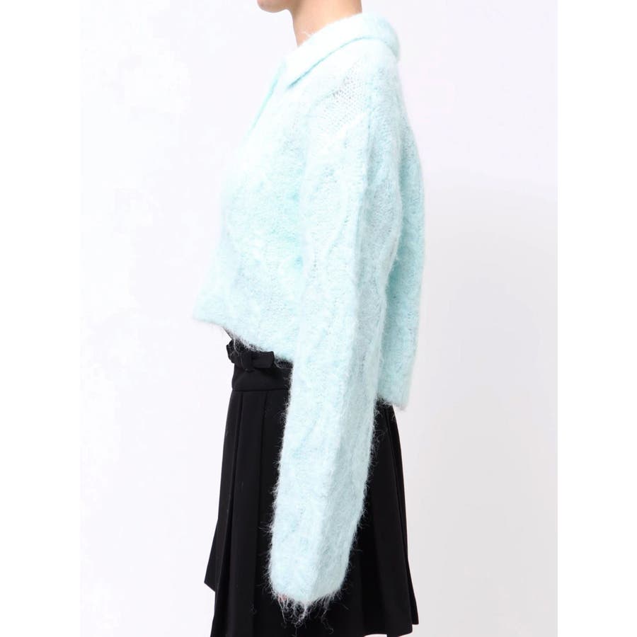 ふわふわな糸で編んだポフっとシルエットのポロ衿ニット。すっきりとした色合いに大き目のケーブル編みがカジュアルなあざとさを演出、ふわふらな糸で編んでいるので、着心地よく着用していただけます。 ▼スタイリング クロップド丈なので、裾はアウトして細見のスカート合わせがおすすめ。パンツと合わせる際は、ミュールで女っぽく◎ ※着用画像は全てサンプルです。