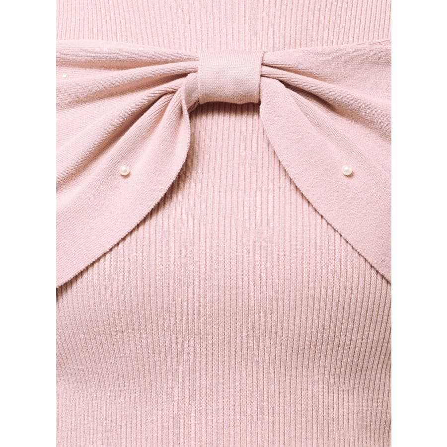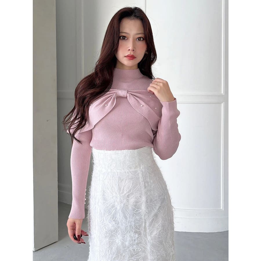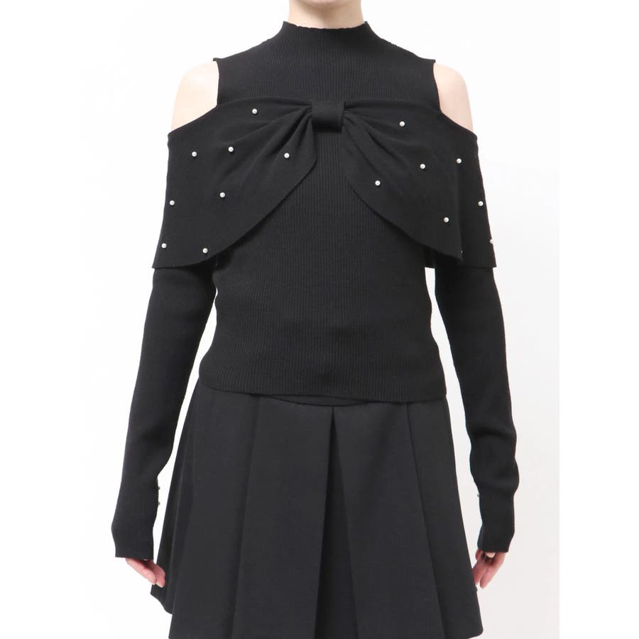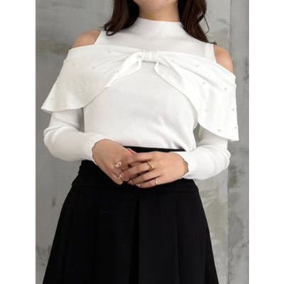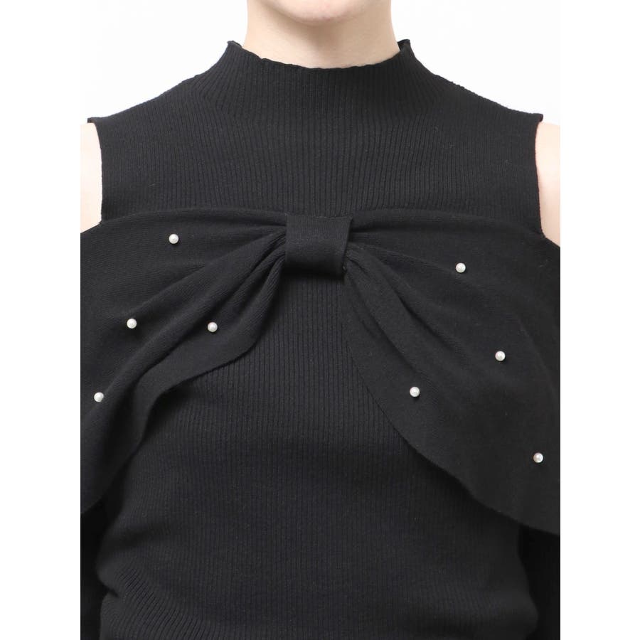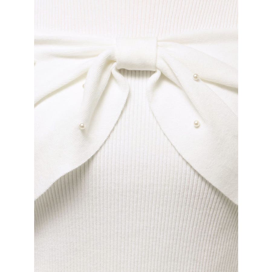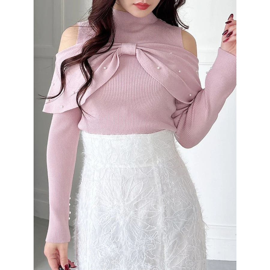 中心にあしらったリボンが印象的な、華やかさと上品さを兼ね備えたリブニット。 リボンには繊細なパールを散りばめ、さりげなく女性らしい輝きをプラスしました。 袖口にもパールをあしらい、ディテールまで抜かりのないデザインに。 まるでリボンに包まれているようなオープンショルダーデザインが、エレガントな抜け感を演出します。 身体にフィットするリブニットで、フェミニンなシルエットを美しく引き立てる一枚です。 ▼スタイリング マーメイドスカートを合わせて上品にまとめたり、デニムでカジュアルダウンしても大人フェミニンに決まるアイテム。 シンプルなボトムと合わせても、リボン×パールの華やかさが主役感を放ちます。 ※着用写真はすべてサンプルです。