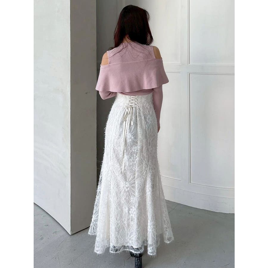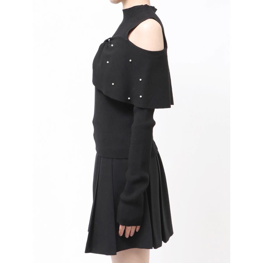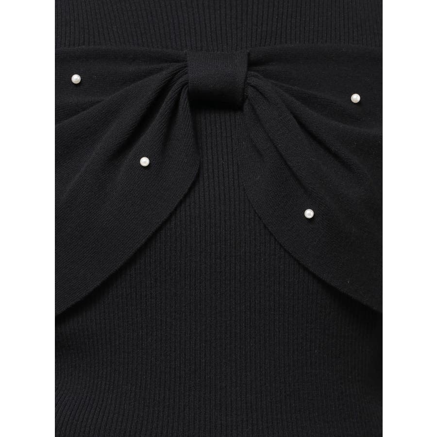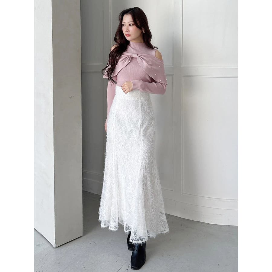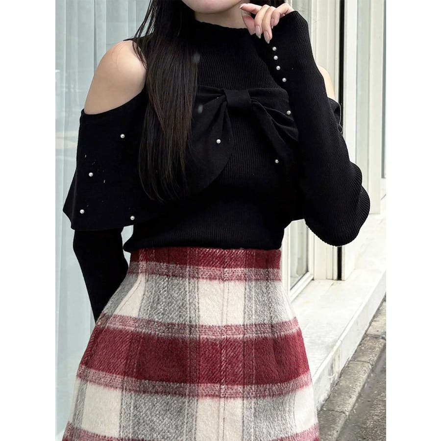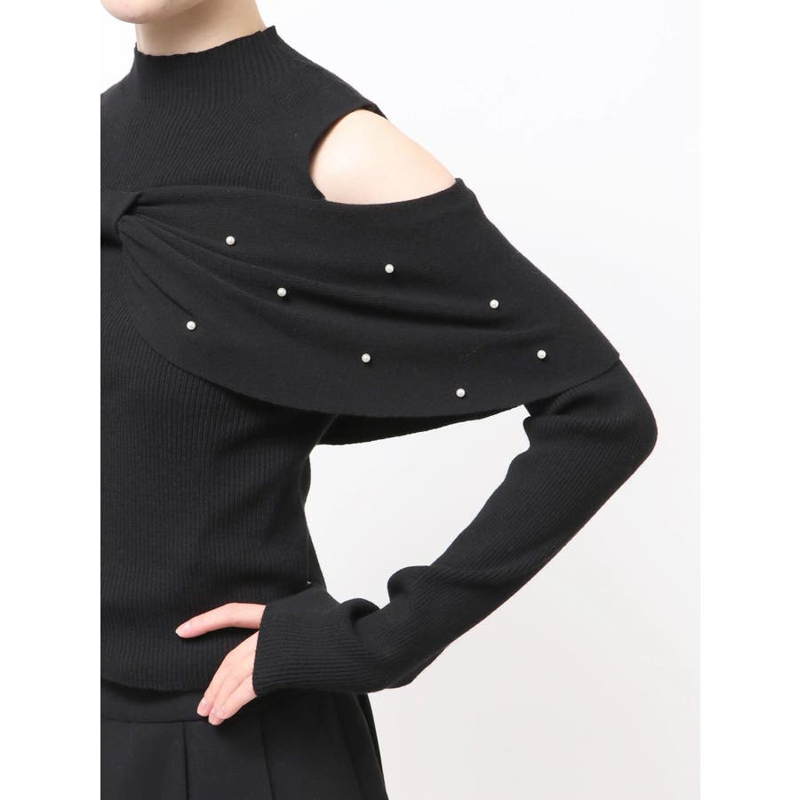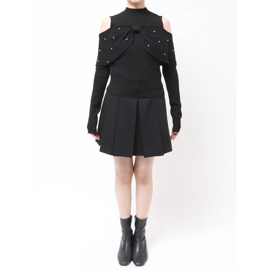 中心にあしらったリボンが印象的な、華やかさと上品さを兼ね備えたリブニット。 リボンには繊細なパールを散りばめ、さりげなく女性らしい輝きをプラスしました。 袖口にもパールをあしらい、ディテールまで抜かりのないデザインに。 まるでリボンに包まれているようなオープンショルダーデザインが、エレガントな抜け感を演出します。 身体にフィットするリブニットで、フェミニンなシルエットを美しく引き立てる一枚です。 ▼スタイリング マーメイドスカートを合わせて上品にまとめたり、デニムでカジュアルダウンしても大人フェミニンに決まるアイテム。 シンプルなボトムと合わせても、リボン×パールの華やかさが主役感を放ちます。 ※着用写真はすべてサンプルです。