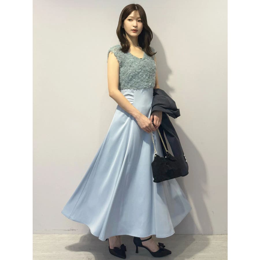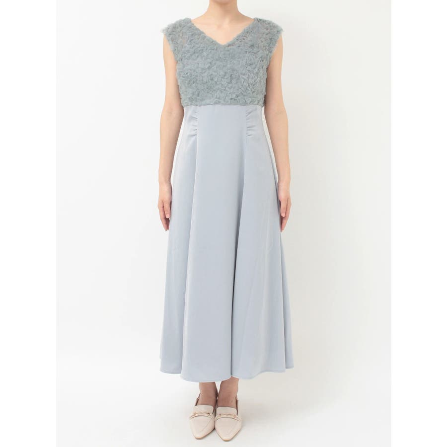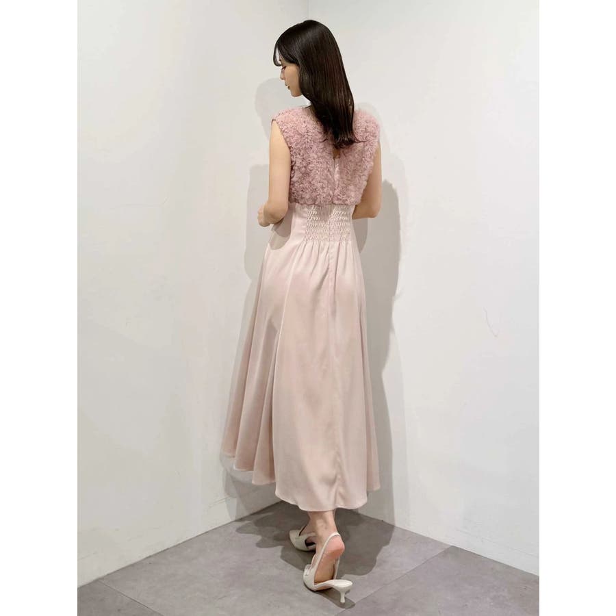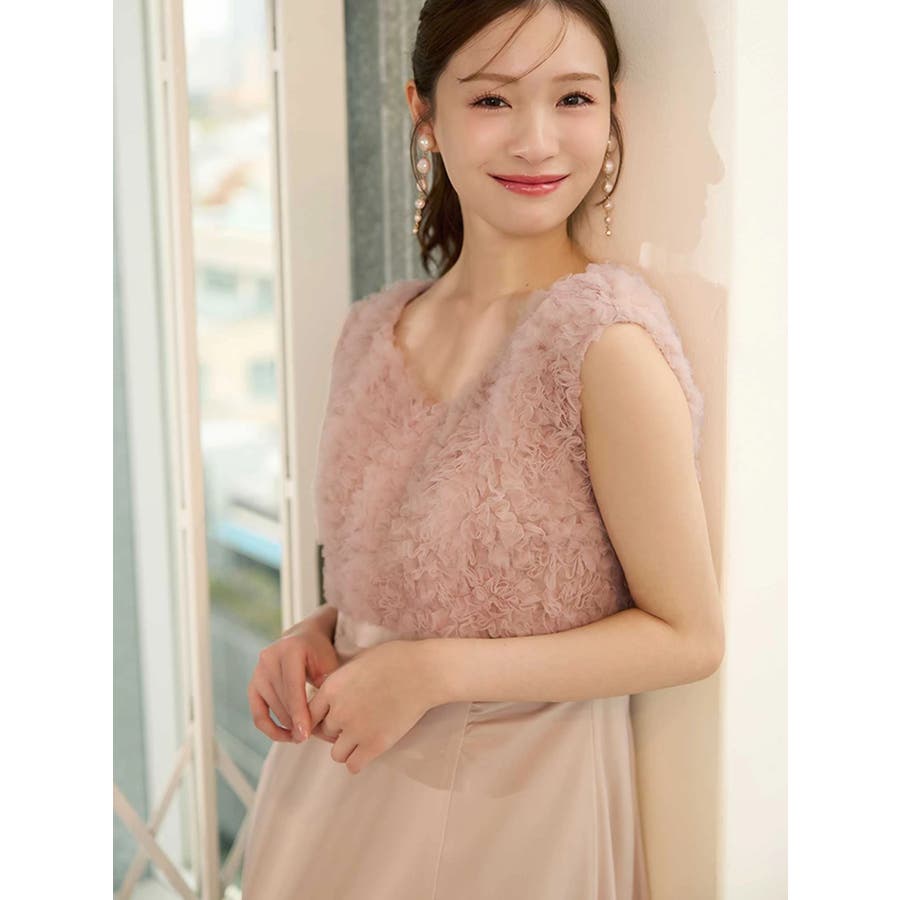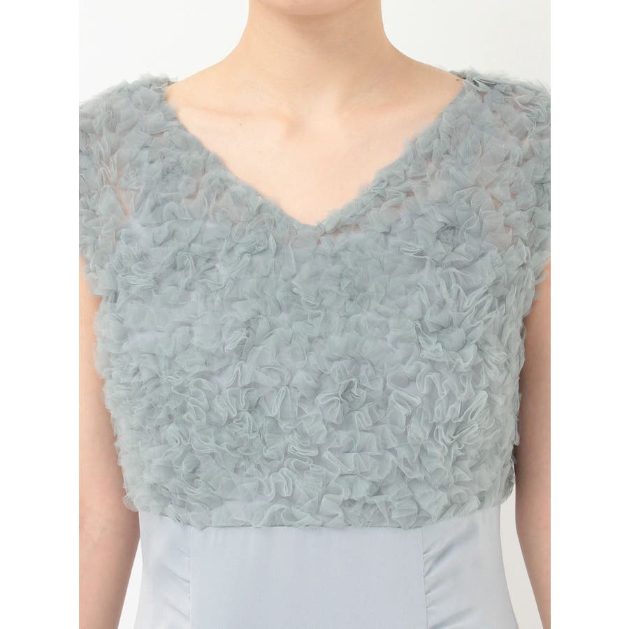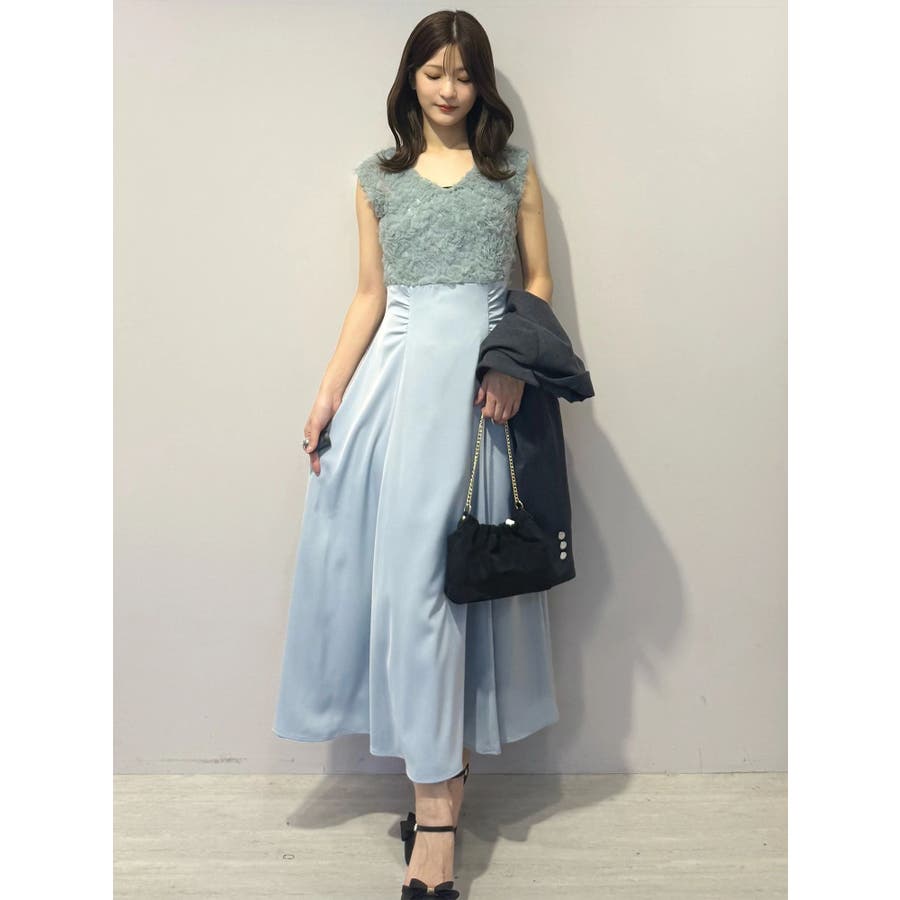 ランダムに叩きつけられたチュールフリルが、動くたびに繊細な表情を生み出すドレス。上身頃の軽やかなチュールと、上品な光沢を放つサテンスカートをドッキングしたデザインで、春らしい華やかさとエレガンスを両立しています。高めのハイウエスト切り替えに加え、ウエスト部分に寄せられたギャザーが自然にシルエットを整え、お腹まわりをさりげなくカバー。Vネックの開き具合や、二の腕をふんわり包むフレンチスリーブのカッティングも女性らしさを引き立てます。背中にはさりげなく光る金ボタンをあしらい、後ろ姿まで抜かりないデザインに。春の特別なシーンにぴったりの華やかな一着です。▼スタイリングデコルテが開いたデザインなので、アクセサリーを大振りにしてより華やかさをプラスするのがおすすめです。※実際にお届けする商品と仕様やサイズが異なる場合がございます。また、生産の都合上、お届け時期が前後する場合がございます。※画像は全てサンプルです。 ※SM着丈差7cm