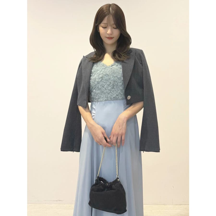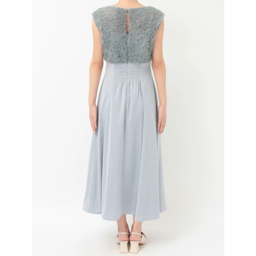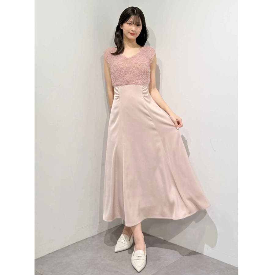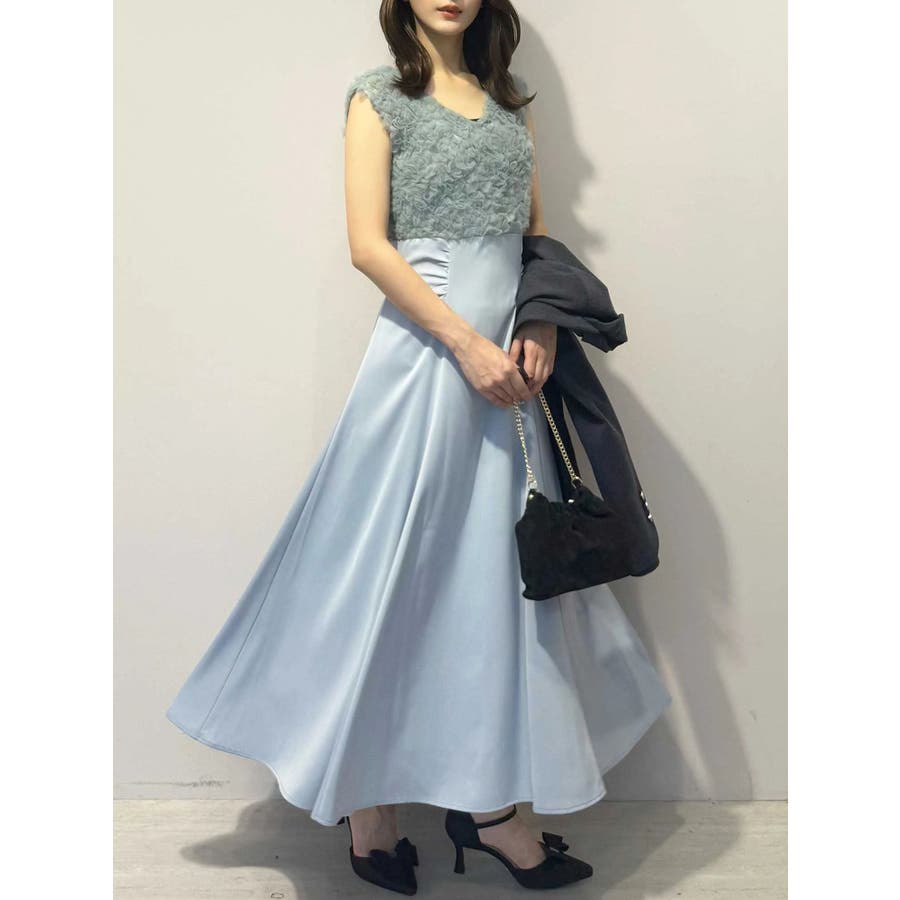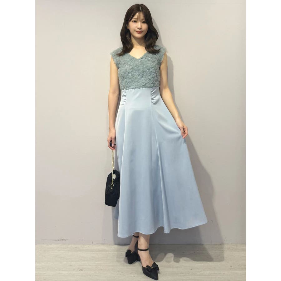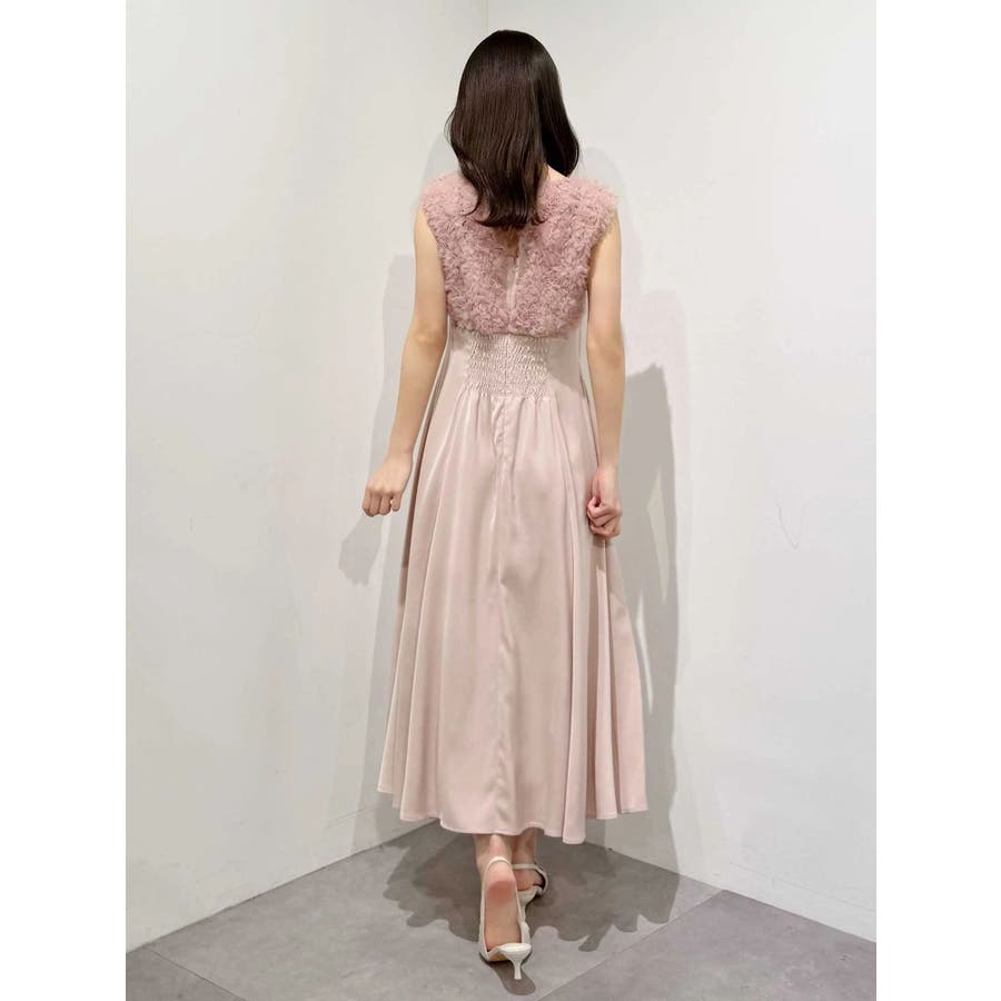 ランダムに叩きつけられたチュールフリルが、動くたびに繊細な表情を生み出すドレス。上身頃の軽やかなチュールと、上品な光沢を放つサテンスカートをドッキングしたデザインで、春らしい華やかさとエレガンスを両立しています。高めのハイウエスト切り替えに加え、ウエスト部分に寄せられたギャザーが自然にシルエットを整え、お腹まわりをさりげなくカバー。Vネックの開き具合や、二の腕をふんわり包むフレンチスリーブのカッティングも女性らしさを引き立てます。背中にはさりげなく光る金ボタンをあしらい、後ろ姿まで抜かりないデザインに。春の特別なシーンにぴったりの華やかな一着です。▼スタイリングデコルテが開いたデザインなので、アクセサリーを大振りにしてより華やかさをプラスするのがおすすめです。※実際にお届けする商品と仕様やサイズが異なる場合がございます。また、生産の都合上、お届け時期が前後する場合がございます。※画像は全てサンプルです。 ※SM着丈差7cm