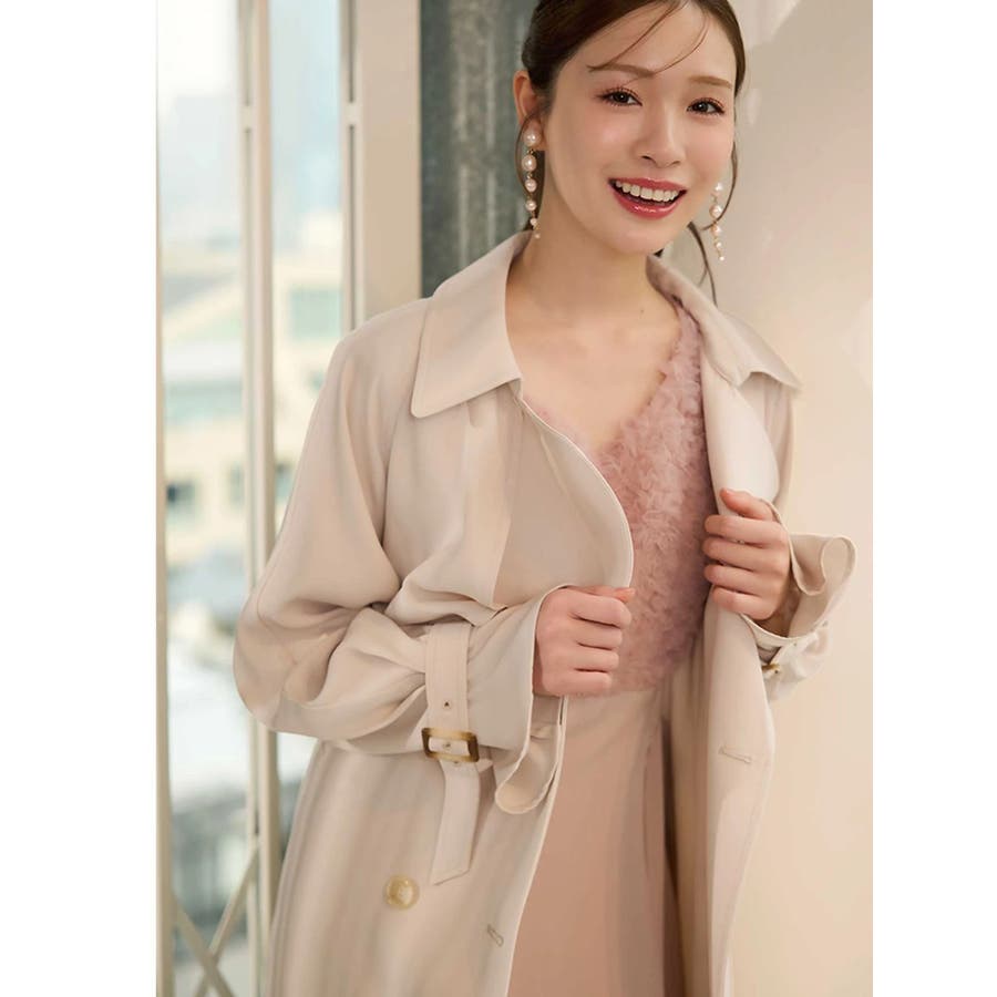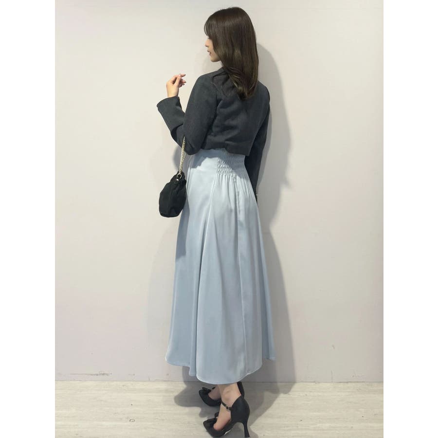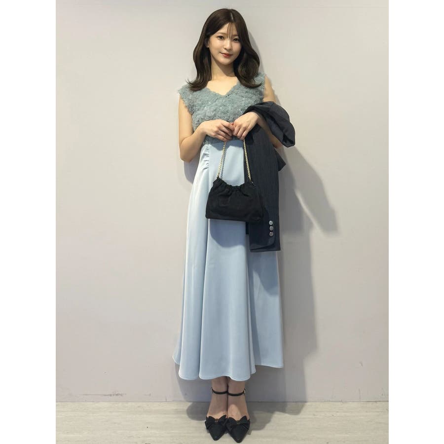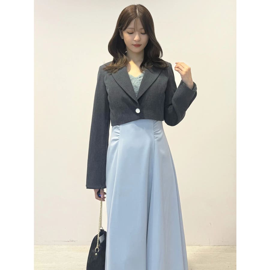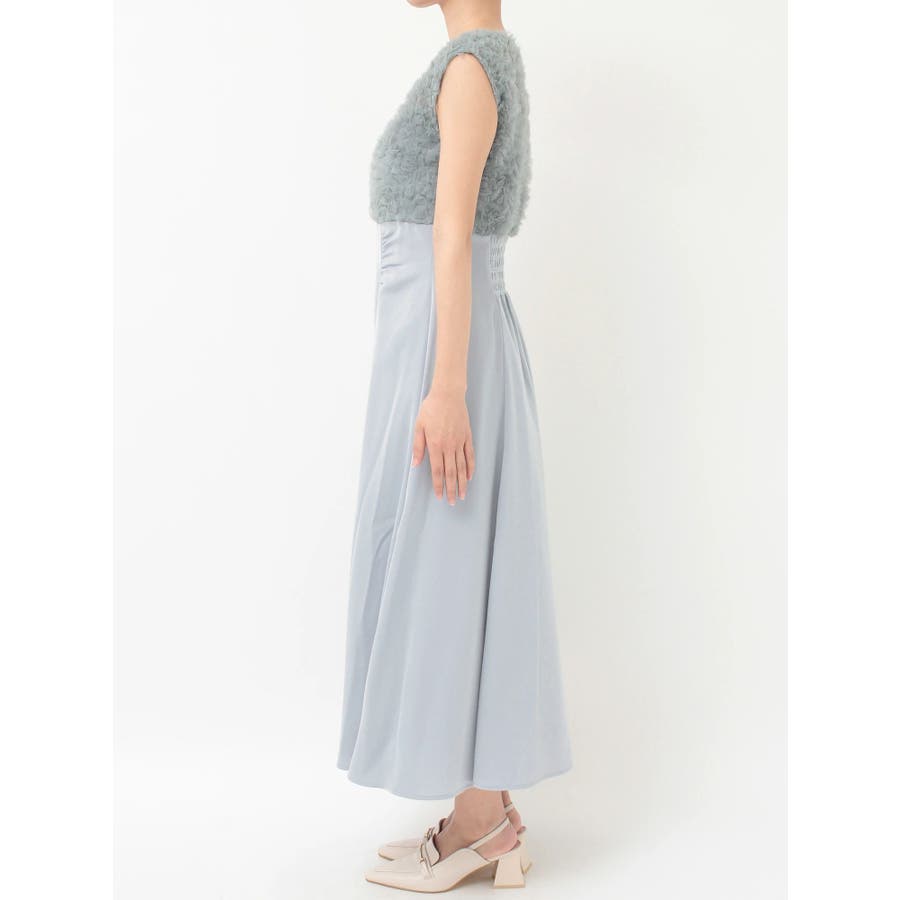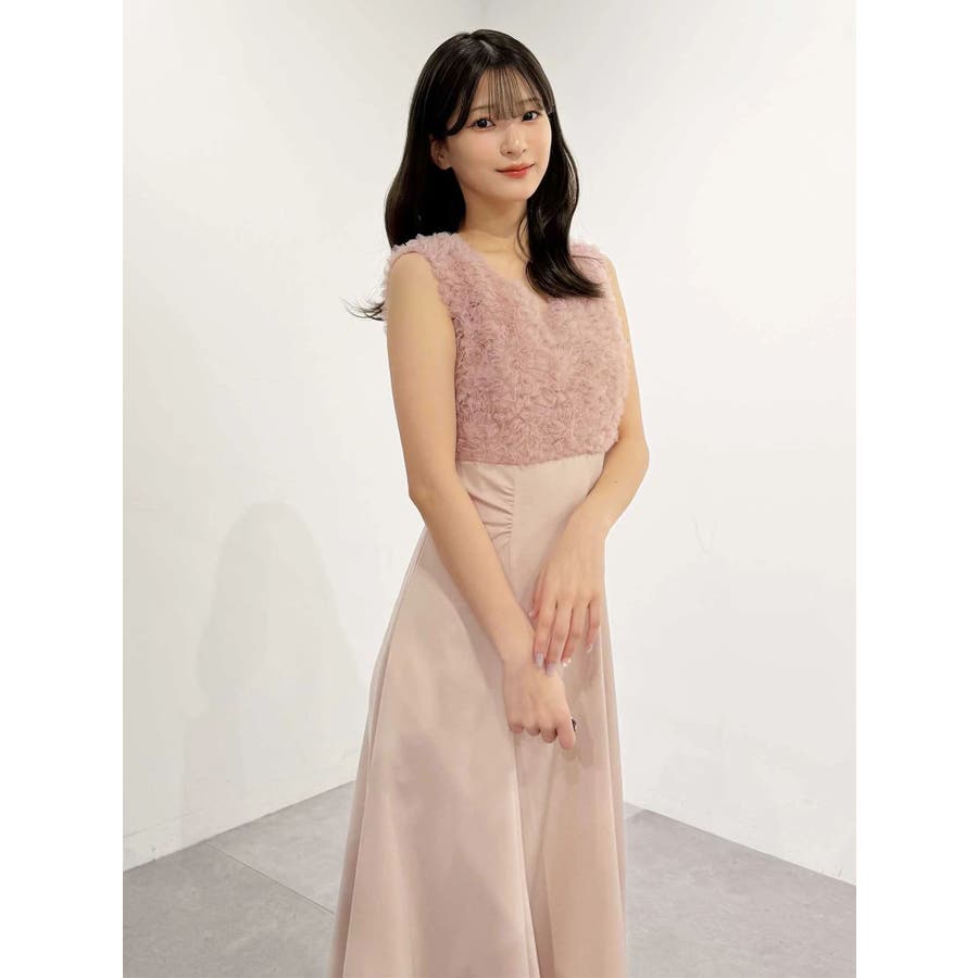 ランダムに叩きつけられたチュールフリルが、動くたびに繊細な表情を生み出すドレス。上身頃の軽やかなチュールと、上品な光沢を放つサテンスカートをドッキングしたデザインで、春らしい華やかさとエレガンスを両立しています。高めのハイウエスト切り替えに加え、ウエスト部分に寄せられたギャザーが自然にシルエットを整え、お腹まわりをさりげなくカバー。Vネックの開き具合や、二の腕をふんわり包むフレンチスリーブのカッティングも女性らしさを引き立てます。背中にはさりげなく光る金ボタンをあしらい、後ろ姿まで抜かりないデザインに。春の特別なシーンにぴったりの華やかな一着です。▼スタイリングデコルテが開いたデザインなので、アクセサリーを大振りにしてより華やかさをプラスするのがおすすめです。※実際にお届けする商品と仕様やサイズが異なる場合がございます。また、生産の都合上、お届け時期が前後する場合がございます。※画像は全てサンプルです。 ※SM着丈差7cm