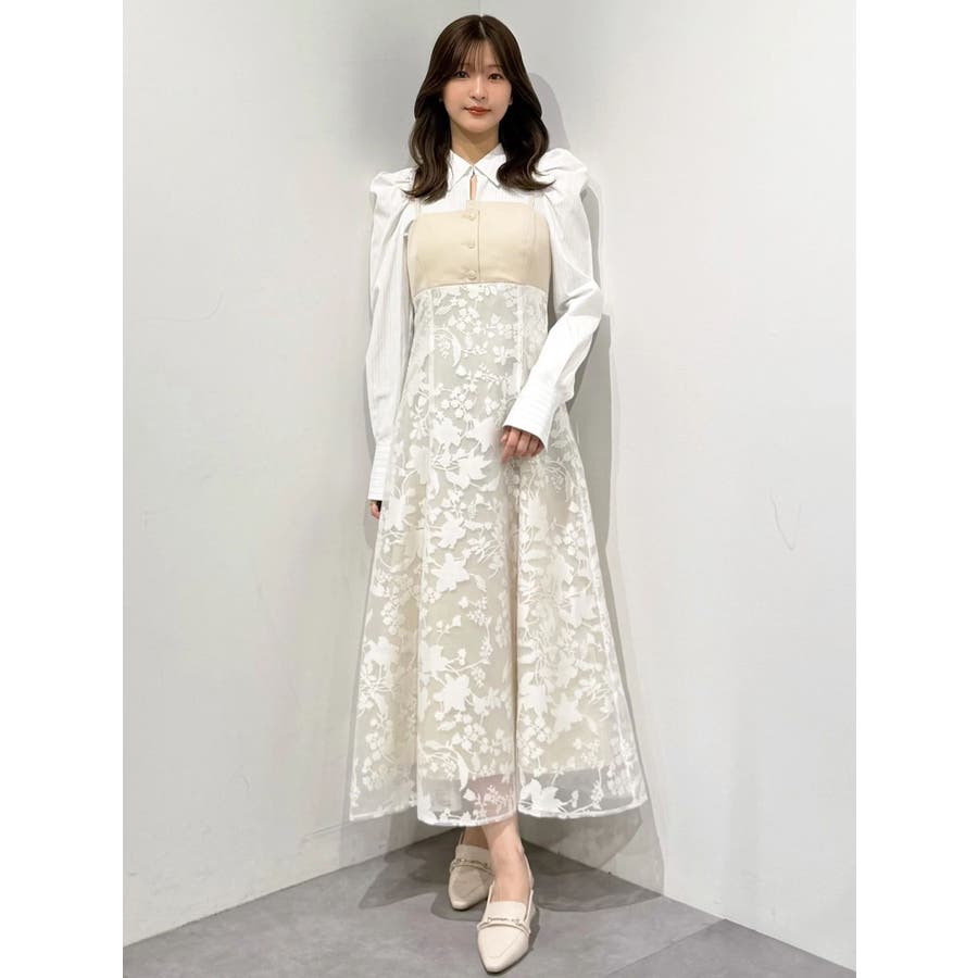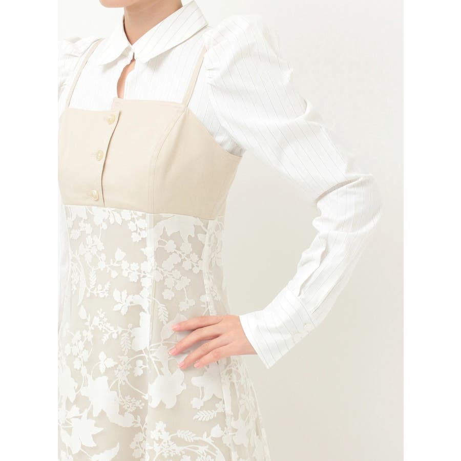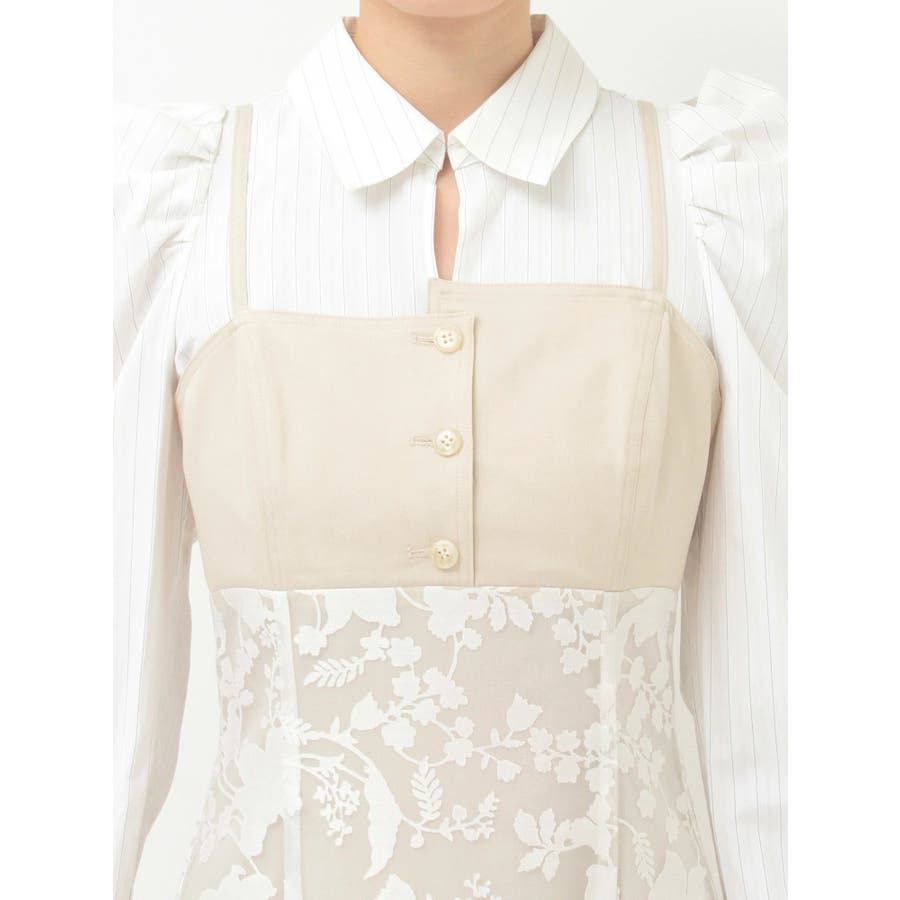| 素材 | ブラック布帛部分:ポリエステル98%/綿2%合皮部分:合成皮革裏地:ポリエステル80%/綿20%ブルーストライプ部分:ポリエステル100%ビスチェ:ポリエステル73%/レーヨン21%/ポリウレタン6%レース:ナイロン100%裏地:ポリエステル80%/綿20%ベージュストライプ部分:ポリエステル65%/綿35%ビスチェ:ポリエステル73%/レーヨン21%/ポリウレタン6%スカート:レーヨン55%/ポリエステル45%別布:ポリエステル80%/綿20%裏地:ポリエステル100% |