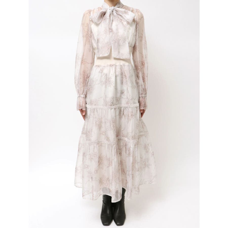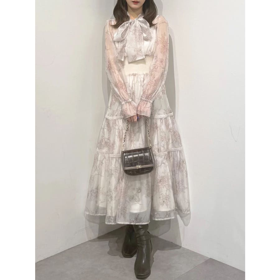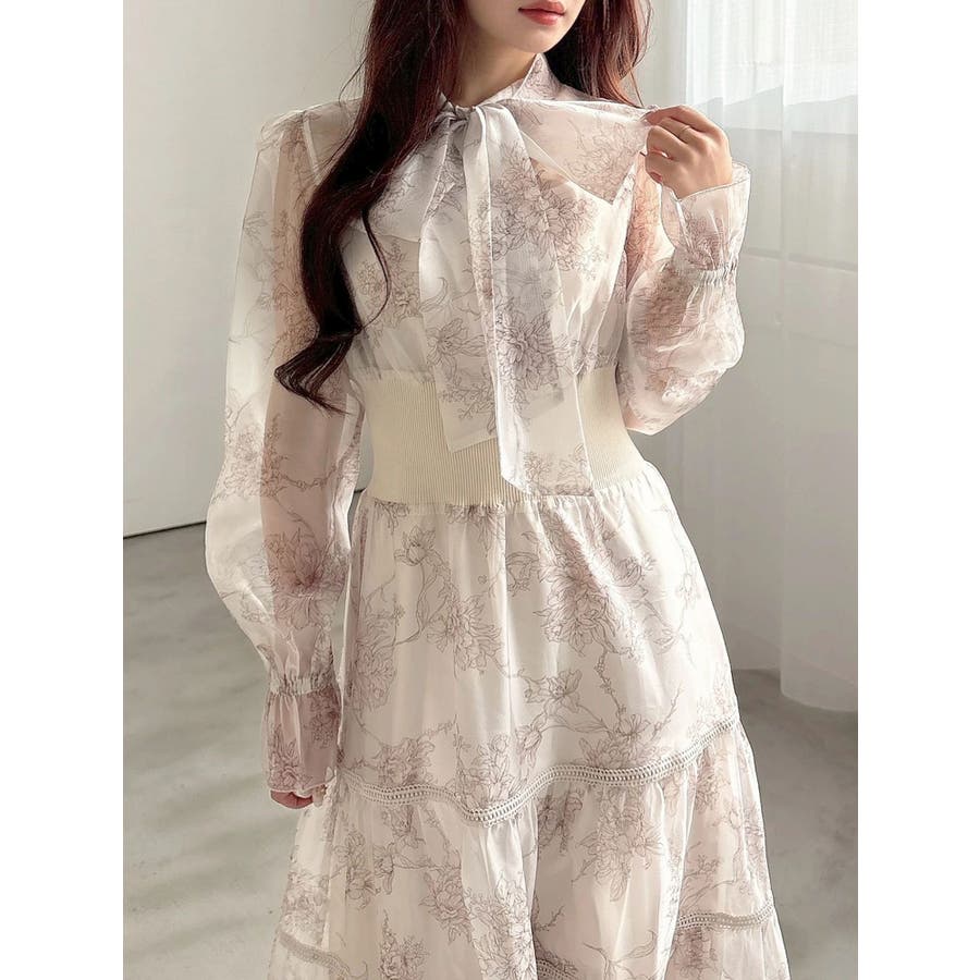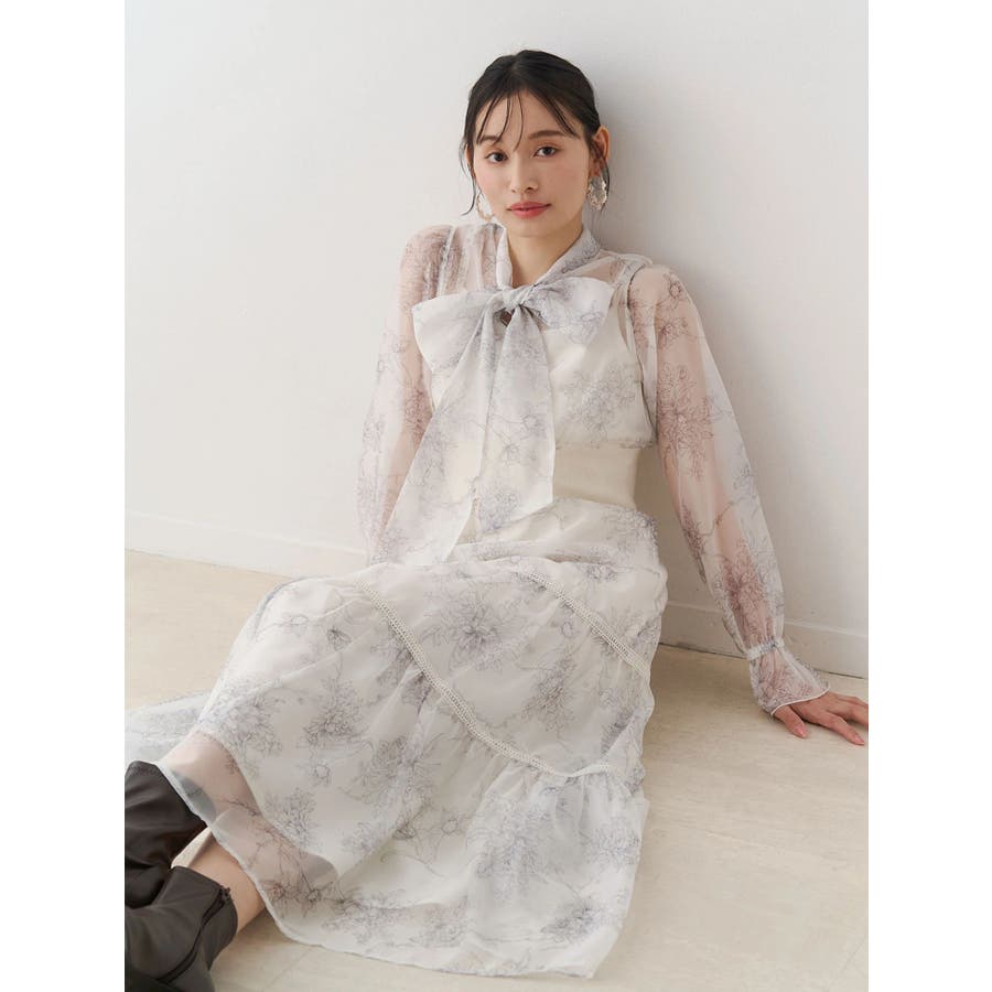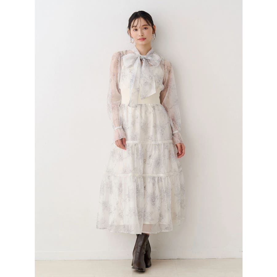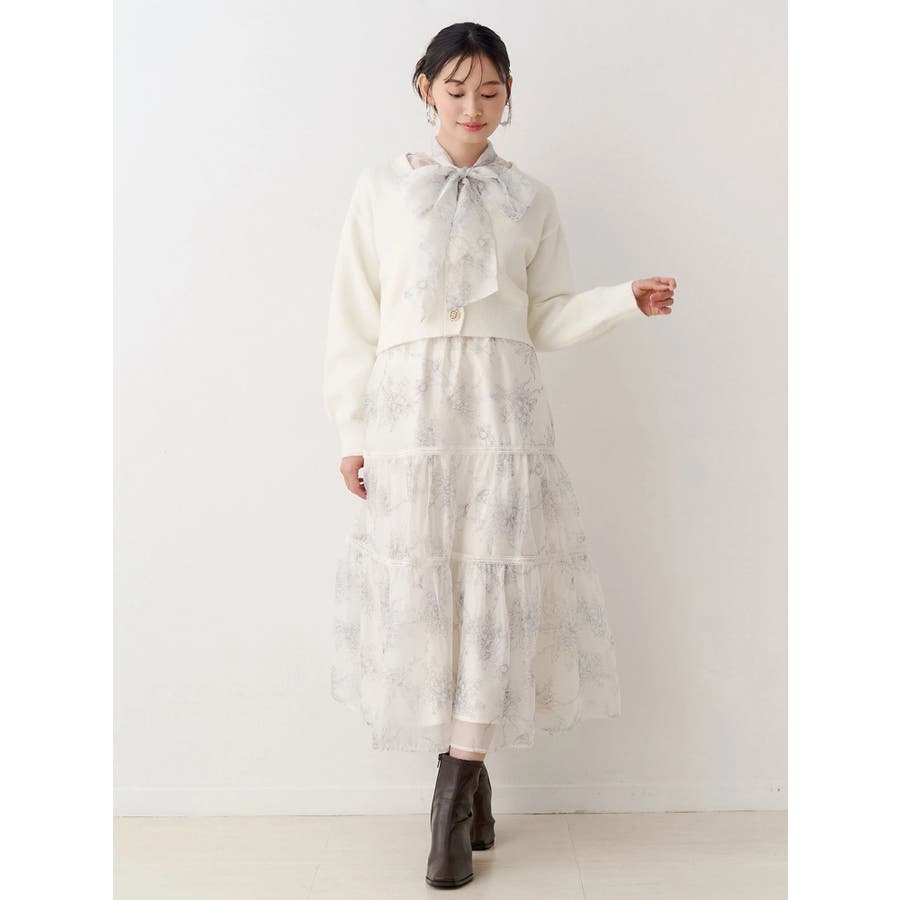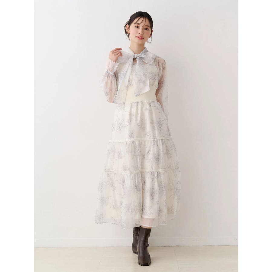 繊細なトワルドジュイ柄をオリジナルプリントで表現した、特別感あふれるボウタイワンピース。シアー感と程よい光沢感を併せ持つシフォンジー素材を使用し、軽やかで上品な印象に仕上げました。ウエストはリブ切替のコルセットデザインで、自然とメリハリのあるシルエットを演出。 スカート部分はティアード仕様にし、切替位置にはレースを叩きつけて、動くたびに表情が生まれる華やかなアクセントをプラスしています。デコルテ部分の裏地はキャミ型にすることで、程よい抜け感と女性らしさを両立。▼スタイリング一枚で着映えするデザインながら、春カラーのカーディガンを羽織れば、より季節感のあるスタイリングが完成します。※実際にお届けする商品と仕様やサイズが異なる場合がございます。また、生産の都合上、お届け時期が前後する場合がございます。※画像は全てサンプルです。