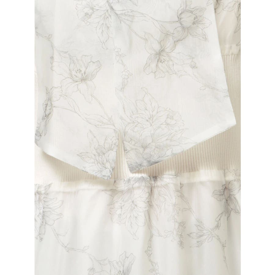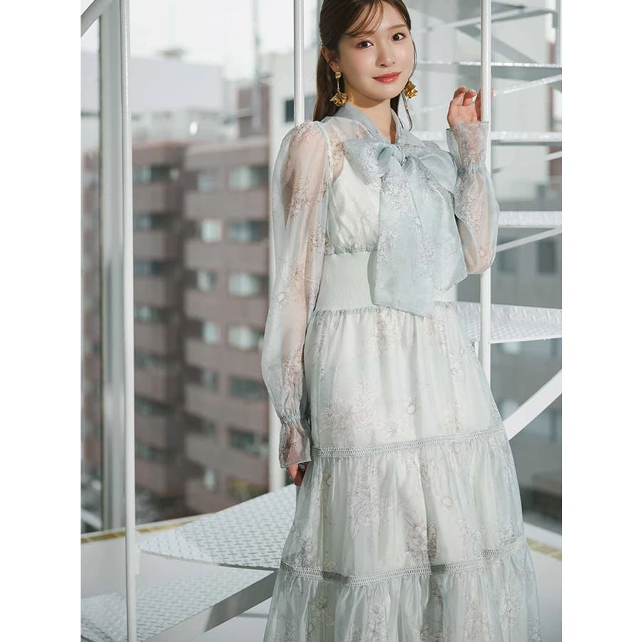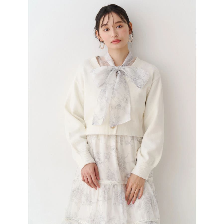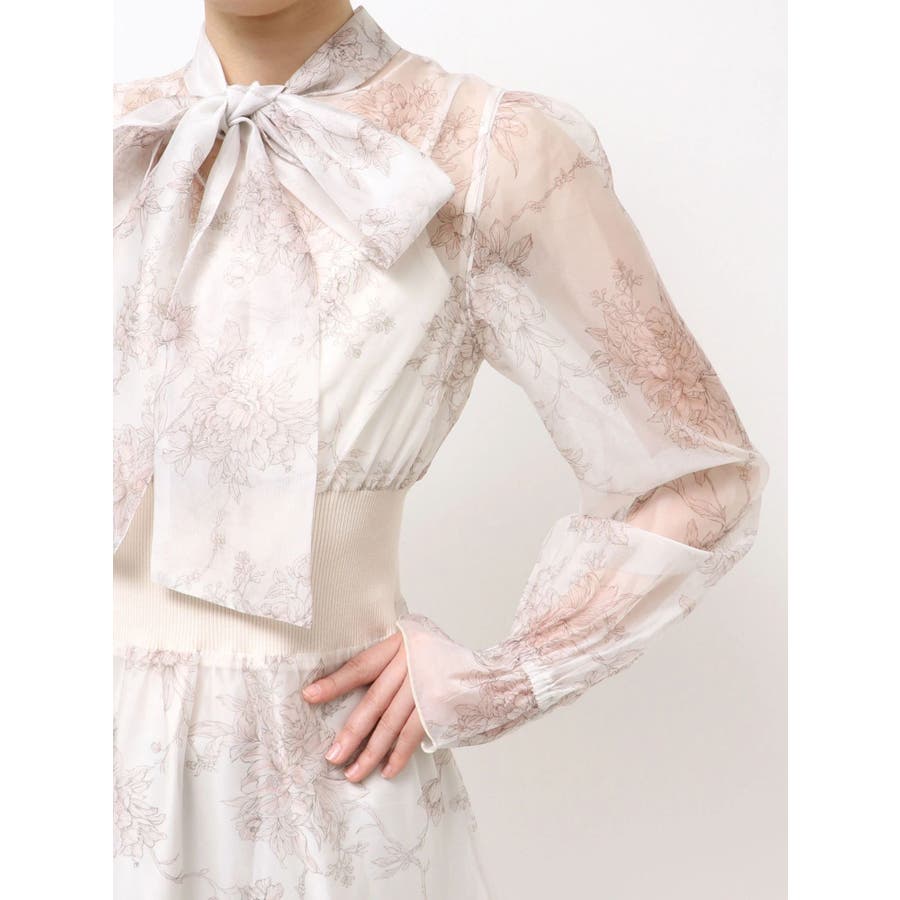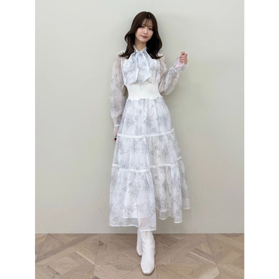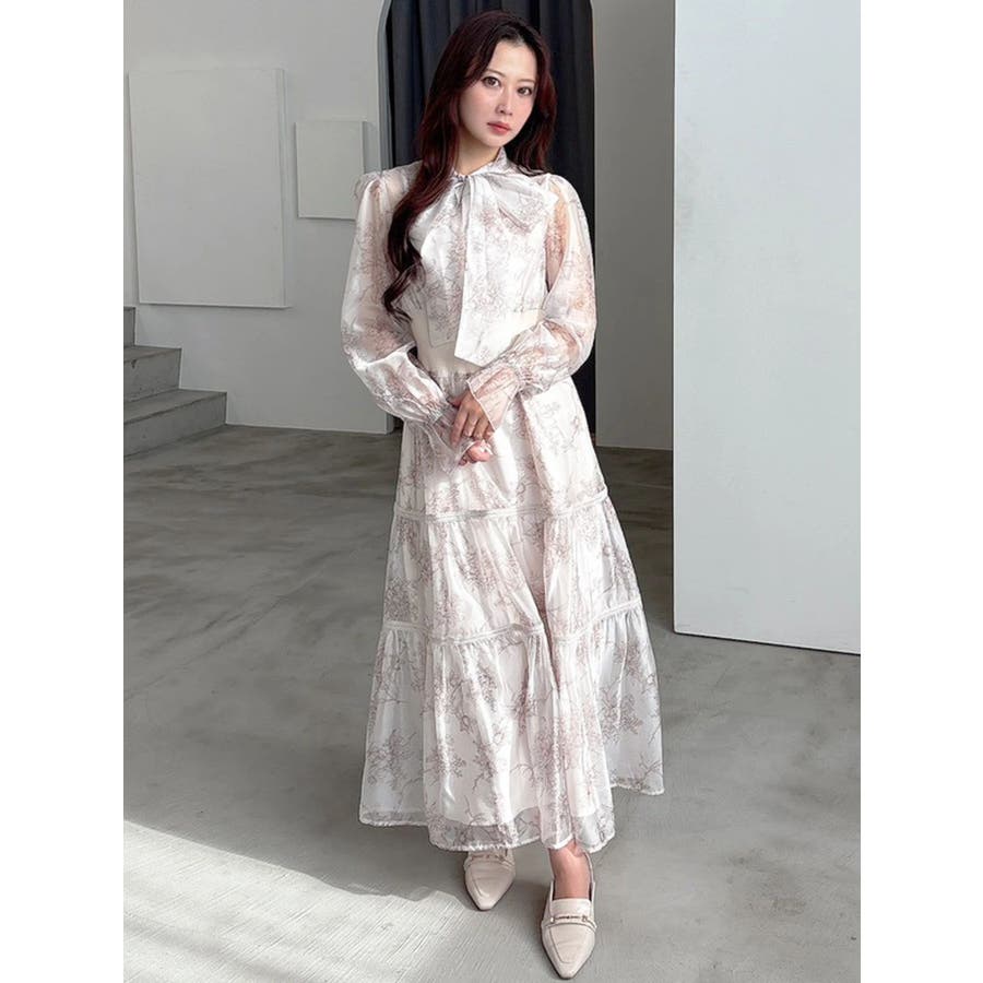 繊細なトワルドジュイ柄をオリジナルプリントで表現した、特別感あふれるボウタイワンピース。シアー感と程よい光沢感を併せ持つシフォンジー素材を使用し、軽やかで上品な印象に仕上げました。ウエストはリブ切替のコルセットデザインで、自然とメリハリのあるシルエットを演出。 スカート部分はティアード仕様にし、切替位置にはレースを叩きつけて、動くたびに表情が生まれる華やかなアクセントをプラスしています。デコルテ部分の裏地はキャミ型にすることで、程よい抜け感と女性らしさを両立。▼スタイリング一枚で着映えするデザインながら、春カラーのカーディガンを羽織れば、より季節感のあるスタイリングが完成します。※実際にお届けする商品と仕様やサイズが異なる場合がございます。また、生産の都合上、お届け時期が前後する場合がございます。※画像は全てサンプルです。