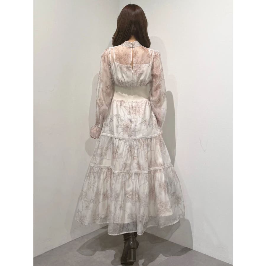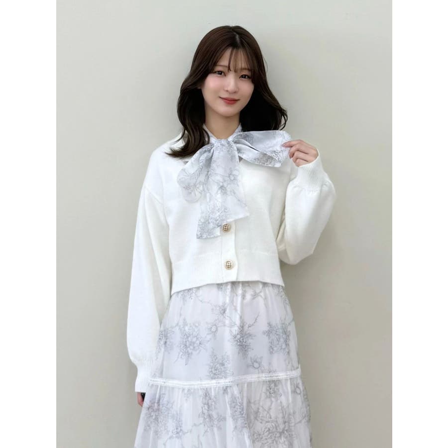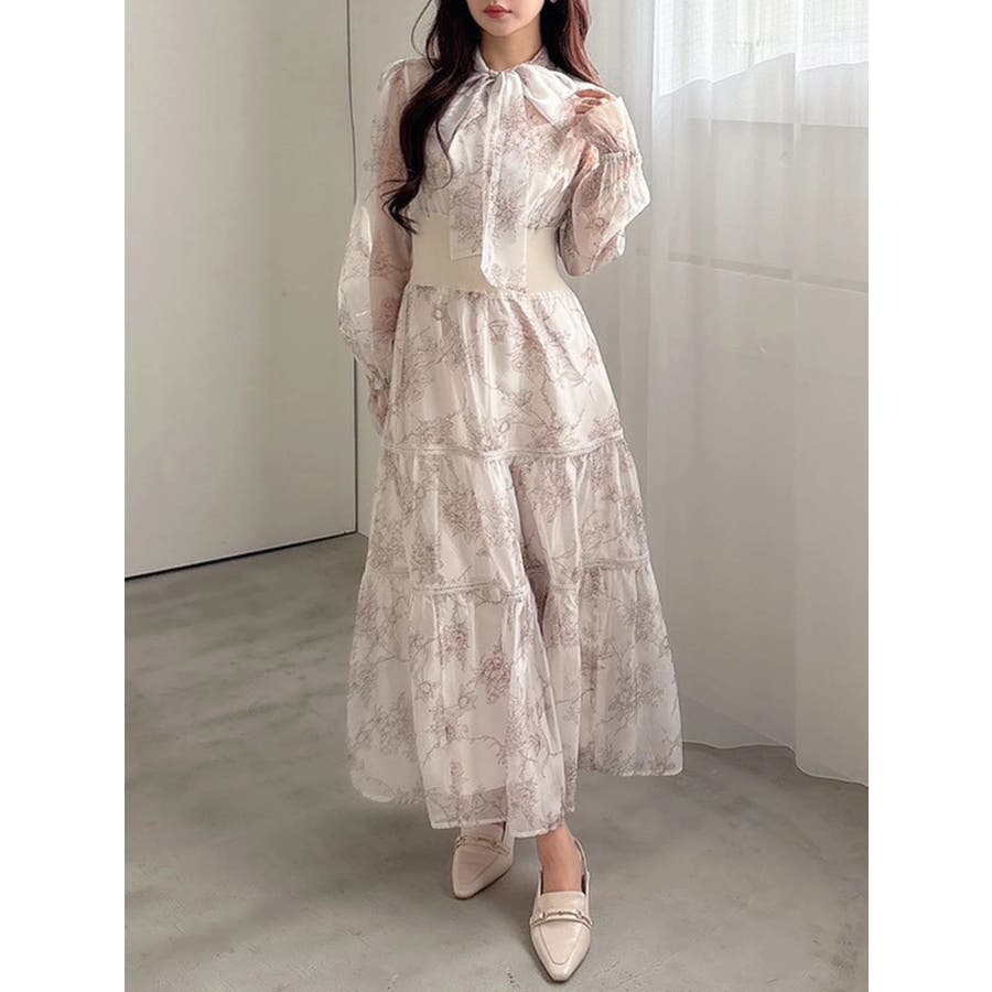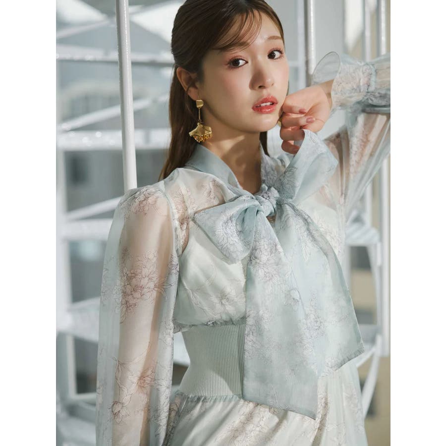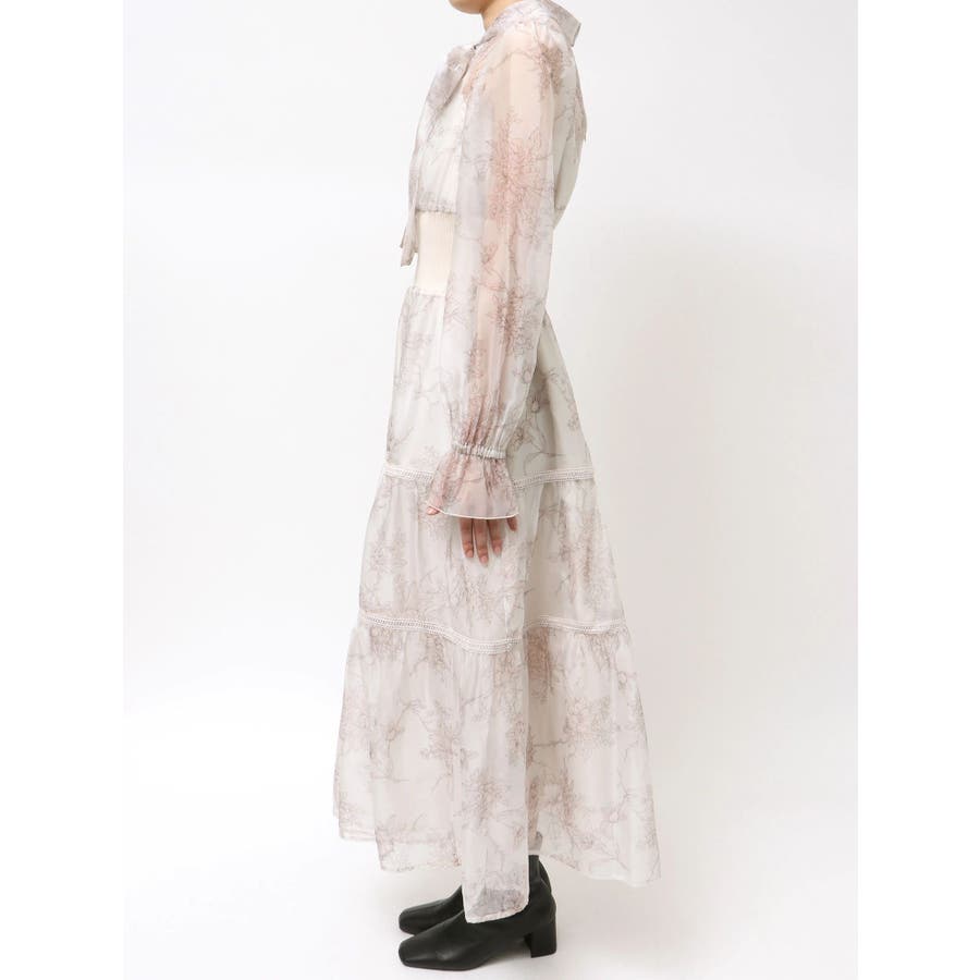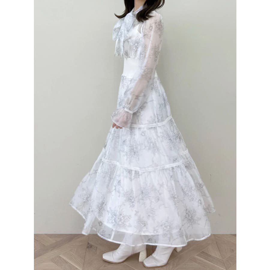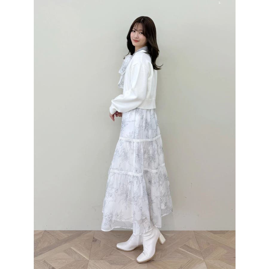 繊細なトワルドジュイ柄をオリジナルプリントで表現した、特別感あふれるボウタイワンピース。シアー感と程よい光沢感を併せ持つシフォンジー素材を使用し、軽やかで上品な印象に仕上げました。ウエストはリブ切替のコルセットデザインで、自然とメリハリのあるシルエットを演出。 スカート部分はティアード仕様にし、切替位置にはレースを叩きつけて、動くたびに表情が生まれる華やかなアクセントをプラスしています。デコルテ部分の裏地はキャミ型にすることで、程よい抜け感と女性らしさを両立。▼スタイリング一枚で着映えするデザインながら、春カラーのカーディガンを羽織れば、より季節感のあるスタイリングが完成します。※実際にお届けする商品と仕様やサイズが異なる場合がございます。また、生産の都合上、お届け時期が前後する場合がございます。※画像は全てサンプルです。