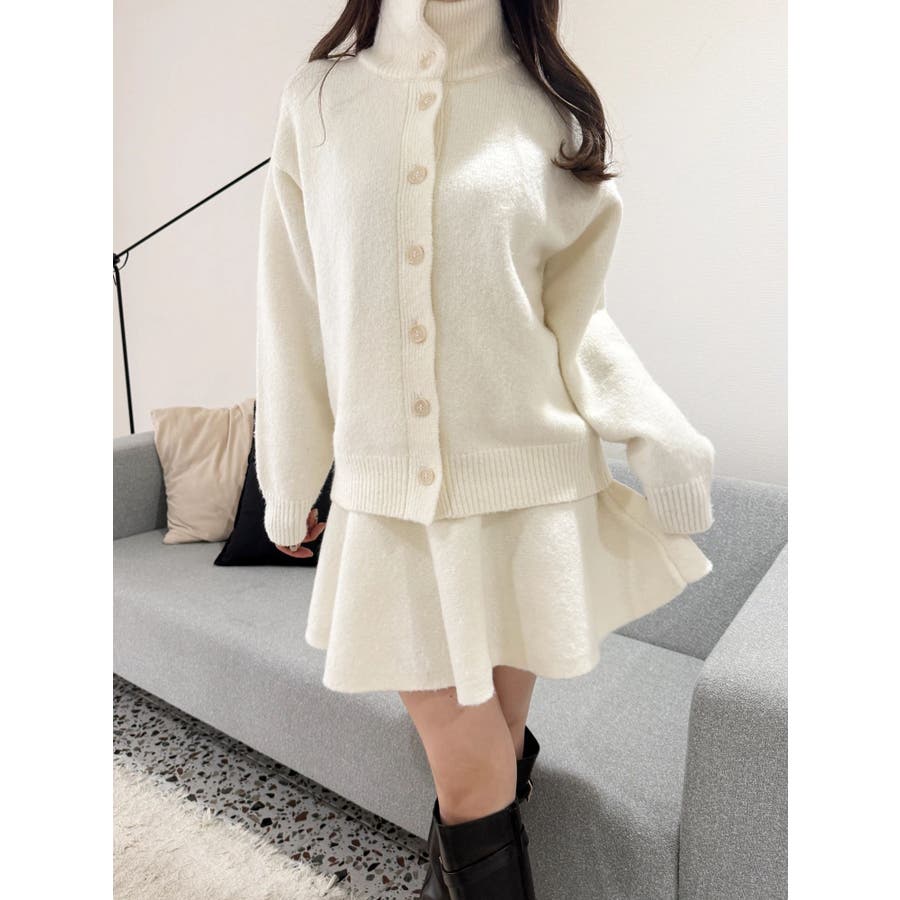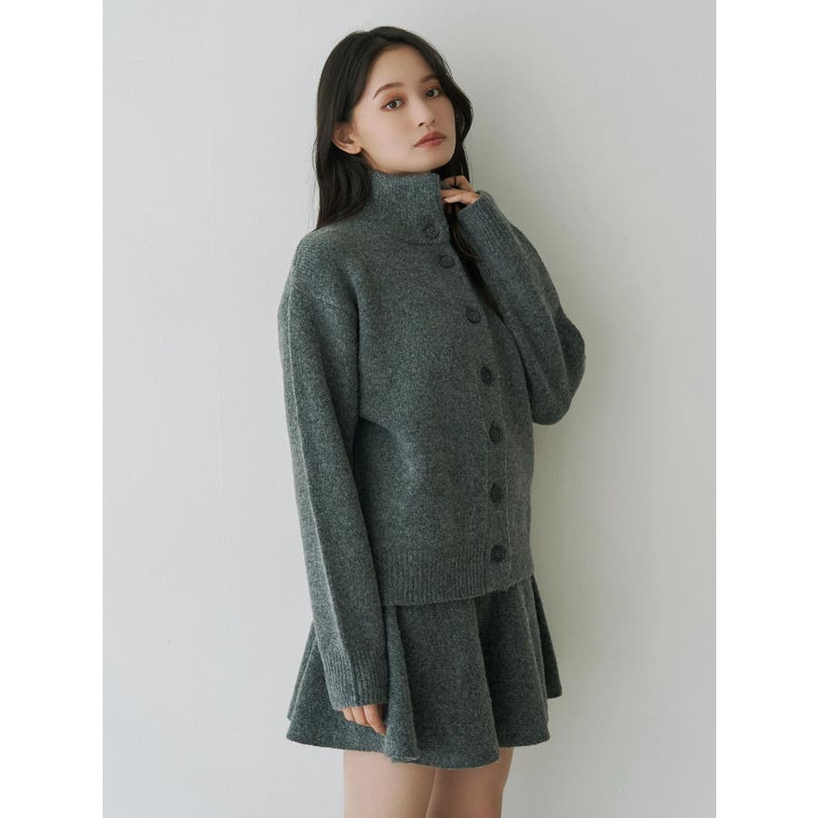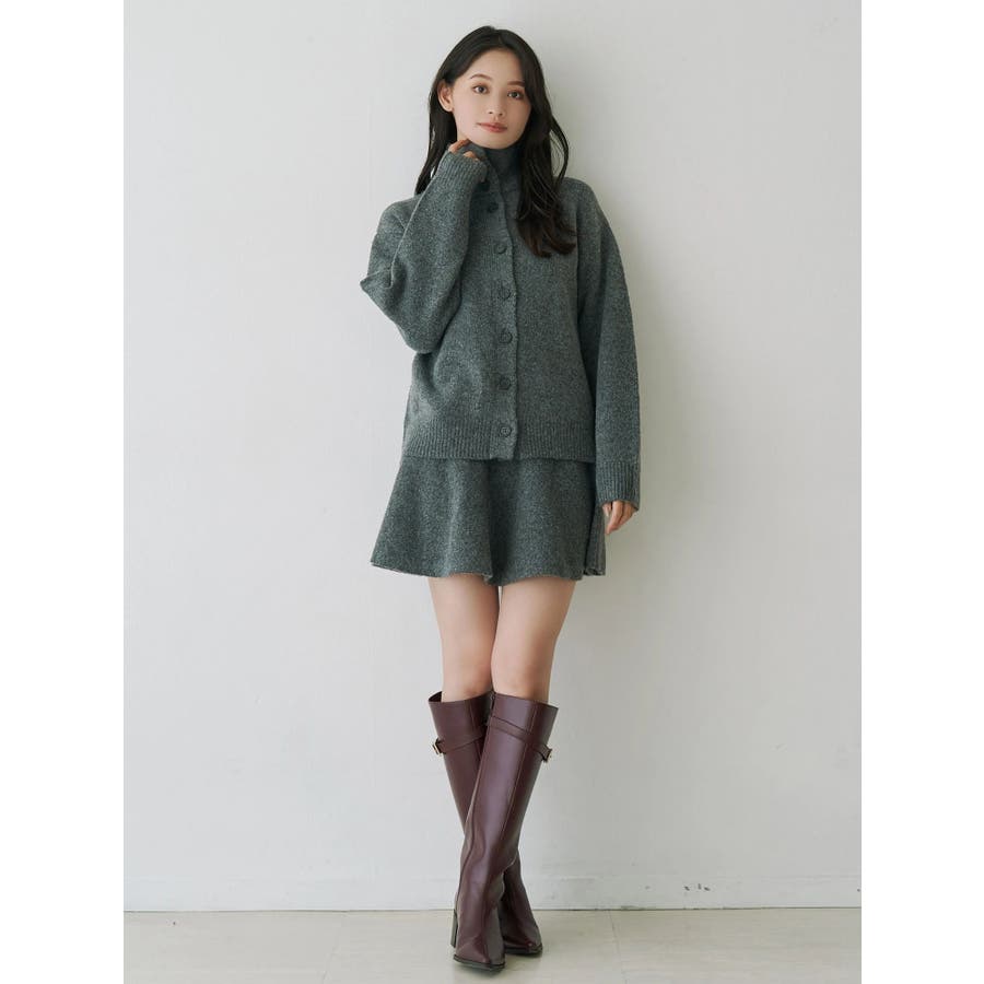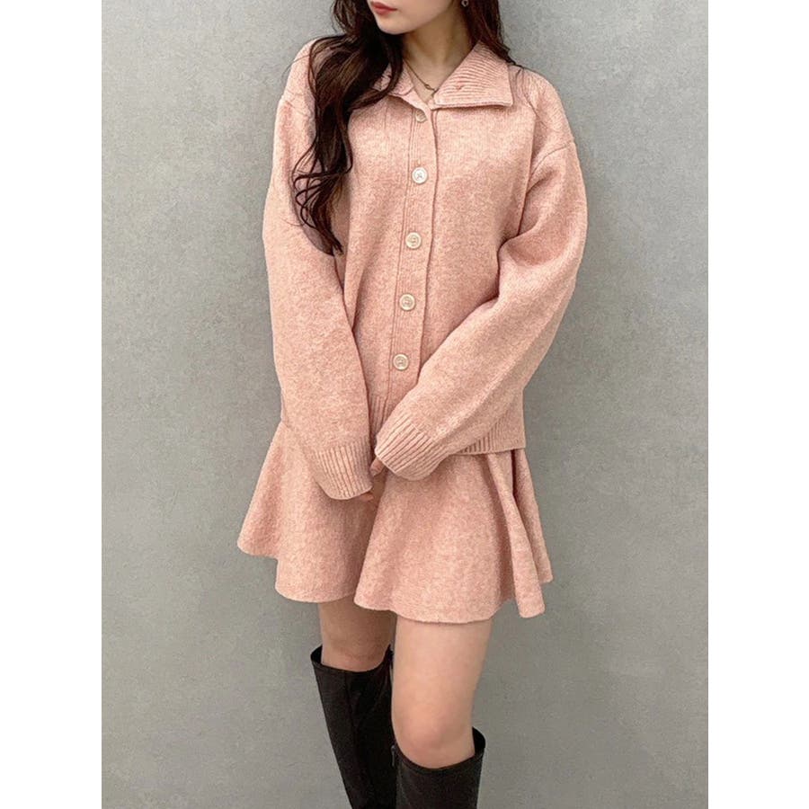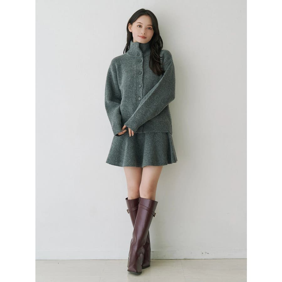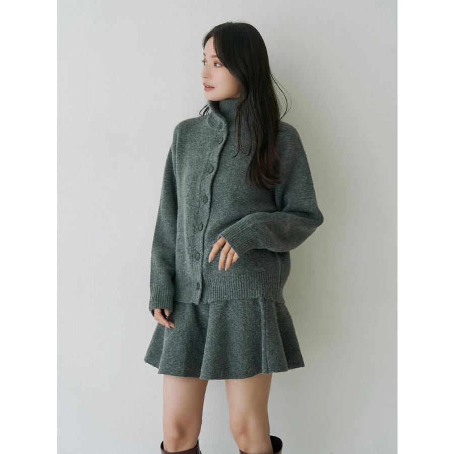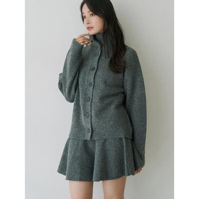 オーバーカーディガンとニットミニスカートのセットアップ。メランジ調の糸がトレンド感あるアイテムです。衿はハイネックとしても、折り返して衿のようにしてもご着用いただけます。スカートは程よく広がるミニマーメイドシルエットになっており、脚の細見え効果抜群です。▼スタイリング セットアップはもちろん、別々のアイテムとしてもご使用いただけます。アウターはチェスターコートやダウンなどとの合わせは抜群、ロービングチェックのジャケットと合わせても◎カーディガンは、ナローシルエットスカートの上にサラッと羽織ることでヒップ周りの体型カバーにもなります。ふわっとしたシルエットを作り出しつつ、ボトムにかけてキュッとしたシルエットのスタイリングが完成します。中にアメスリブラウスをインして、ツイードショートパンツ合わせも◎※着用画像は全てサンプルです。※アイスのボタンカラー、サンプルより濃いブラウンになります。※SM着丈差1.5cm