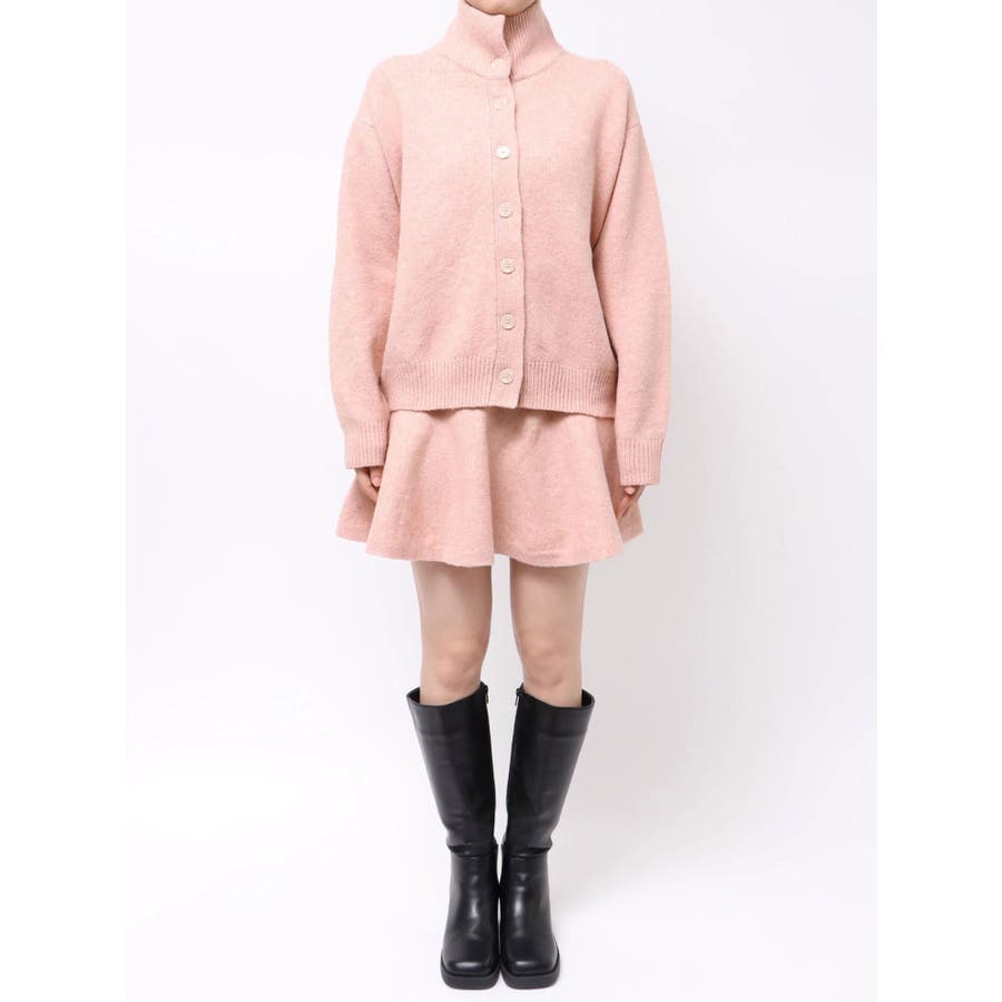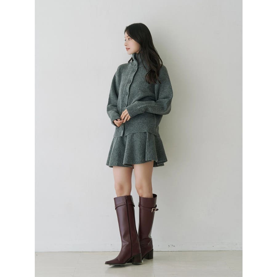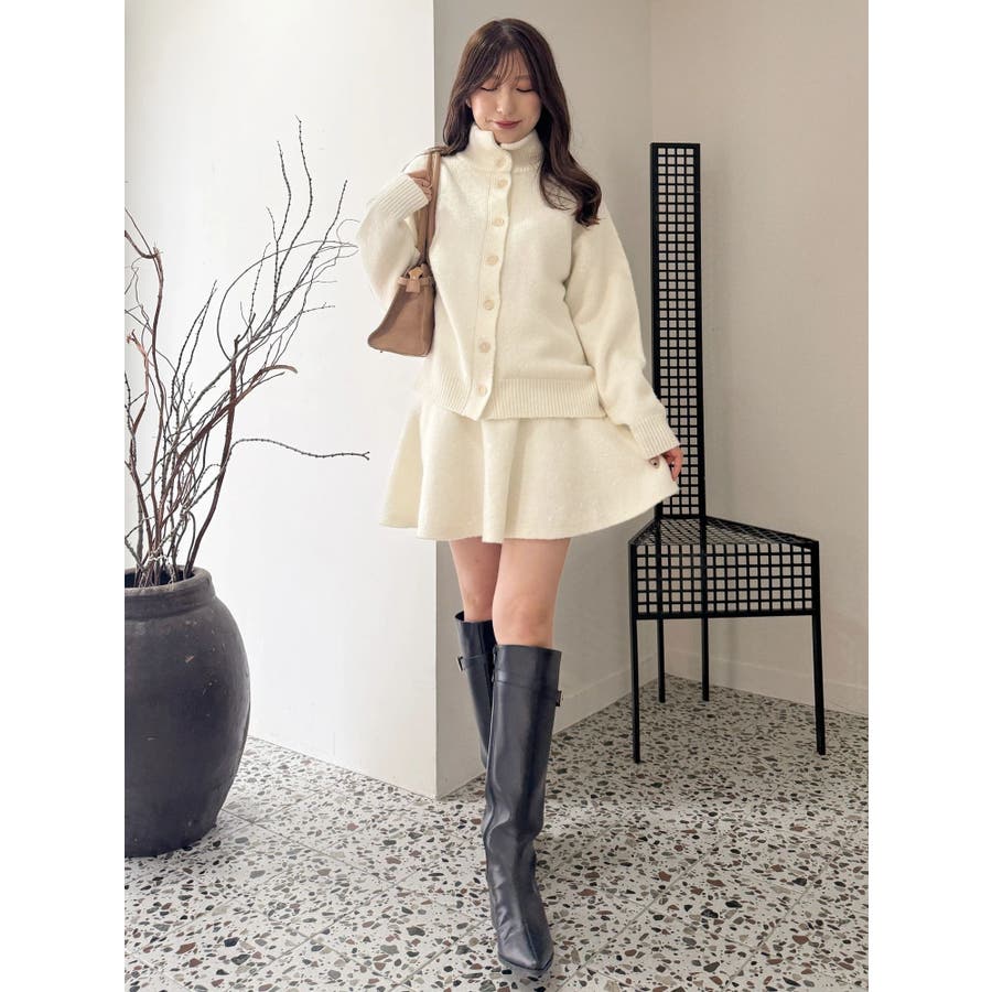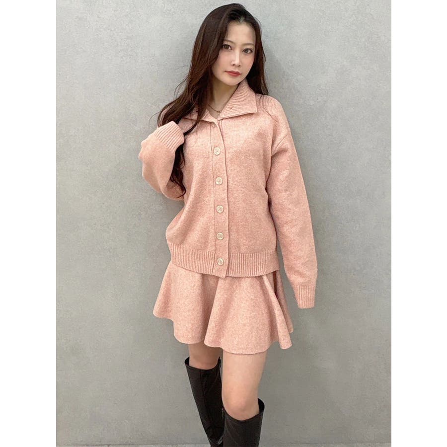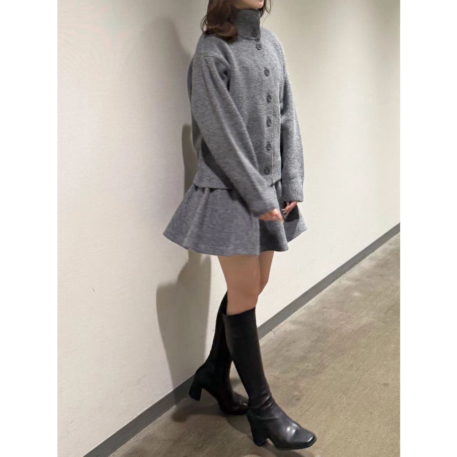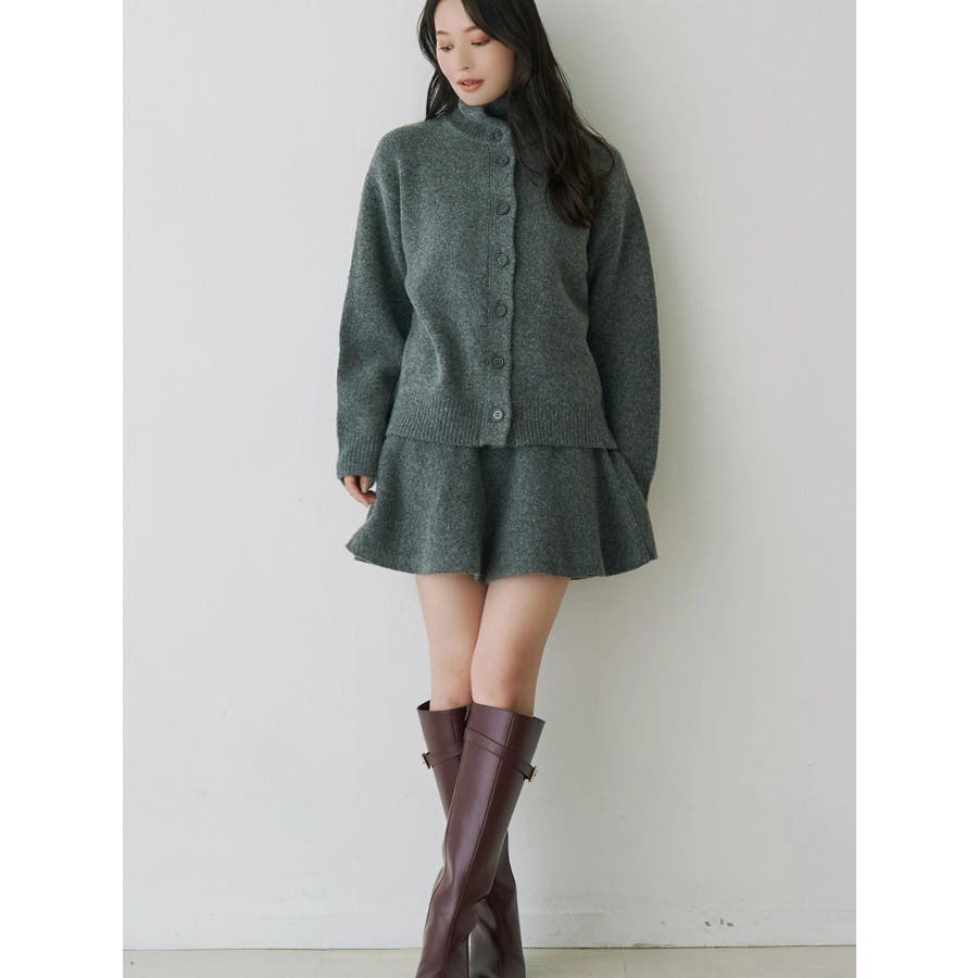 オーバーカーディガンとニットミニスカートのセットアップ。メランジ調の糸がトレンド感あるアイテムです。衿はハイネックとしても、折り返して衿のようにしてもご着用いただけます。スカートは程よく広がるミニマーメイドシルエットになっており、脚の細見え効果抜群です。▼スタイリング セットアップはもちろん、別々のアイテムとしてもご使用いただけます。アウターはチェスターコートやダウンなどとの合わせは抜群、ロービングチェックのジャケットと合わせても◎カーディガンは、ナローシルエットスカートの上にサラッと羽織ることでヒップ周りの体型カバーにもなります。ふわっとしたシルエットを作り出しつつ、ボトムにかけてキュッとしたシルエットのスタイリングが完成します。中にアメスリブラウスをインして、ツイードショートパンツ合わせも◎※着用画像は全てサンプルです。※アイスのボタンカラー、サンプルより濃いブラウンになります。※SM着丈差1.5cm