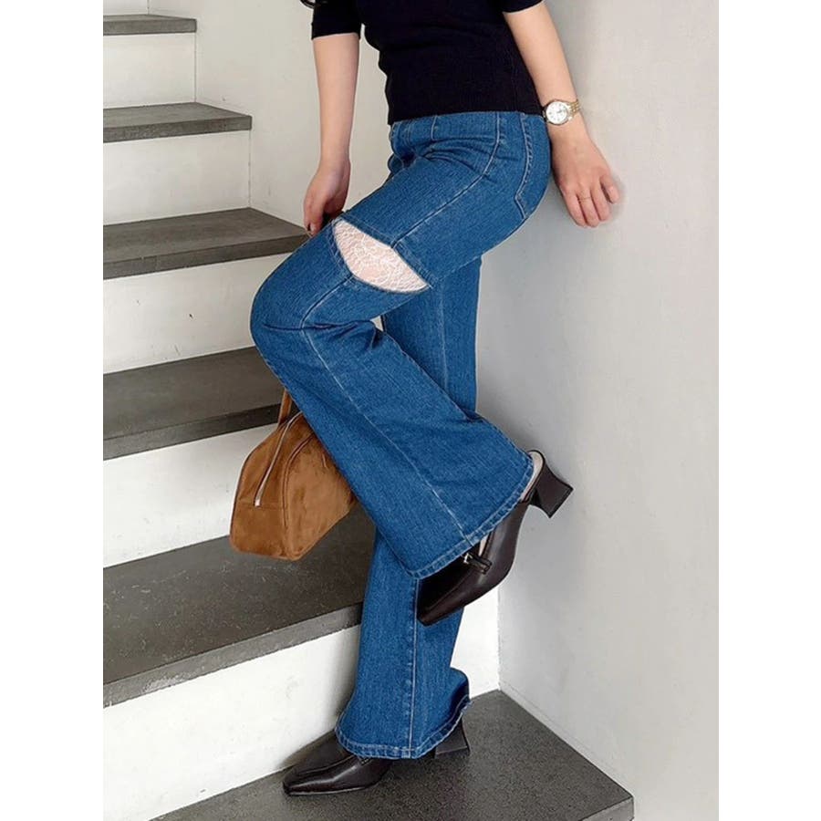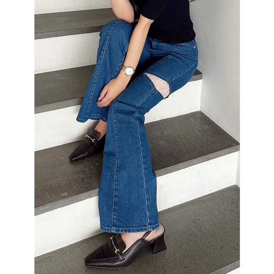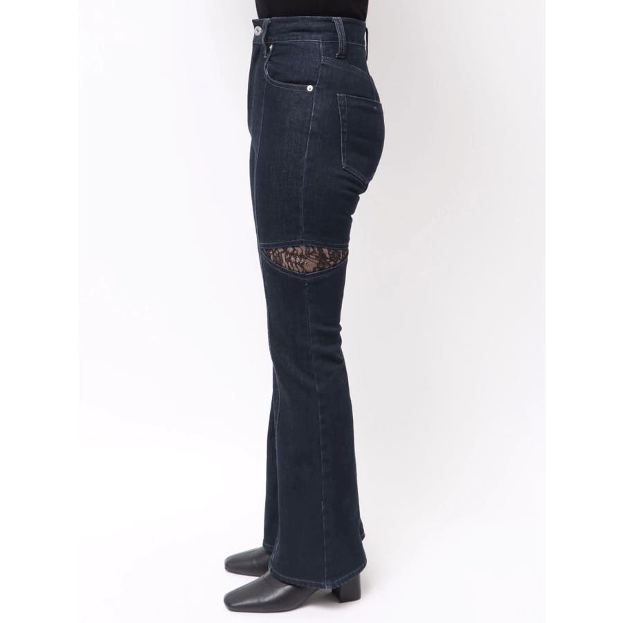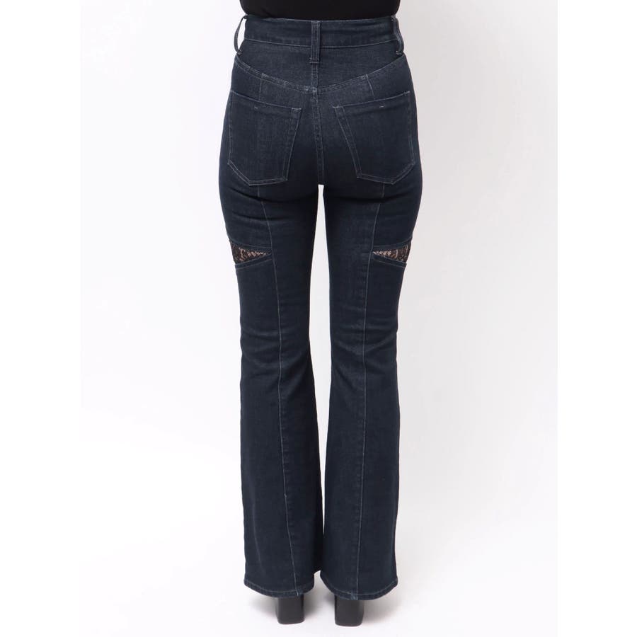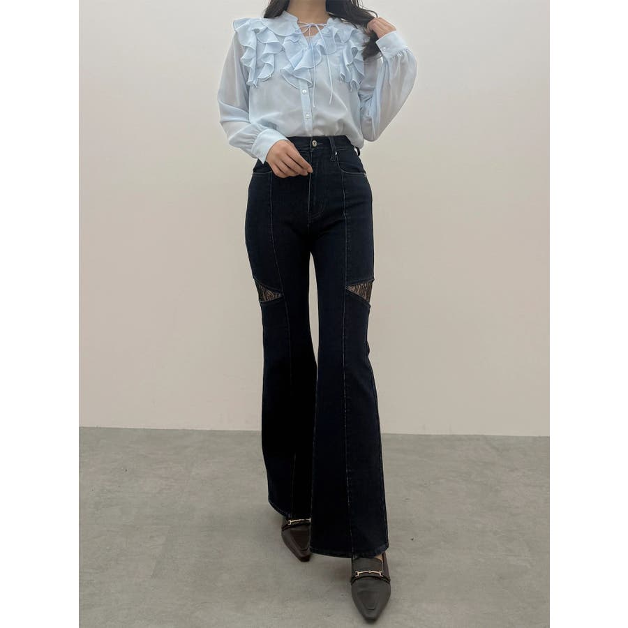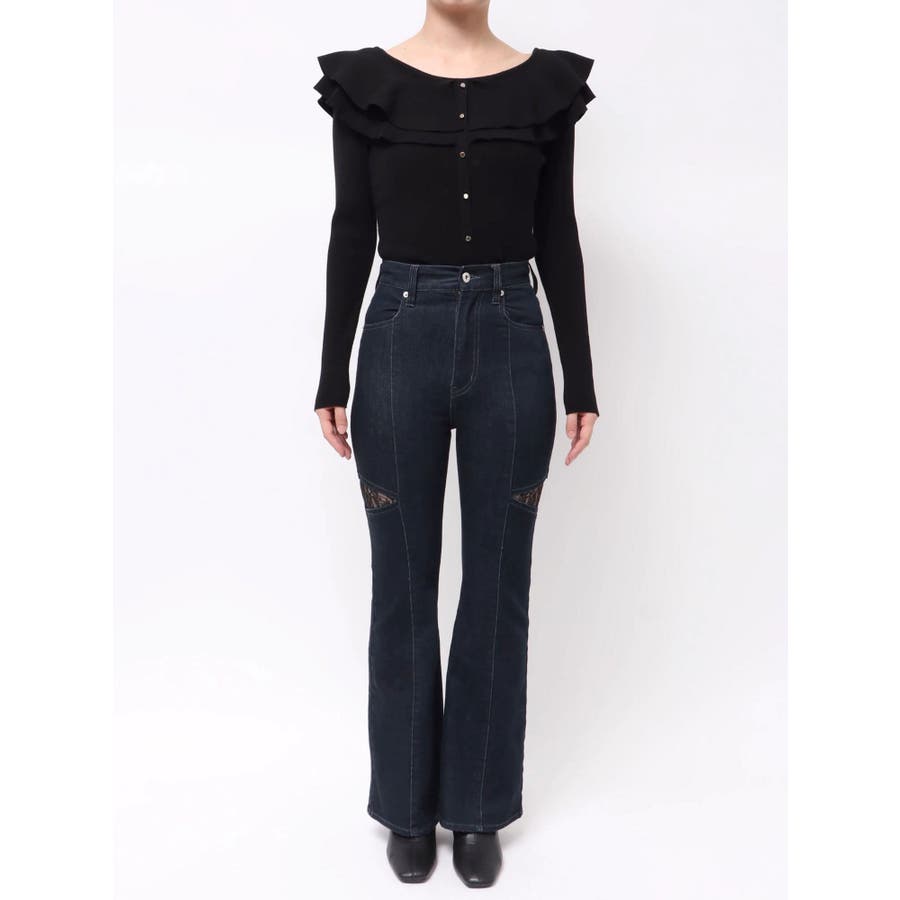 繊細なレースをレイヤードしたようなデザインカッティングが印象的なデニムパンツ。 太ももの高い位置に施したカットラインが、脚をすらりと長く見せてくれます。 伸縮性のあるデニム素材で身体に心地よくフィットし、ウエストはキュッと細く、女性らしいラインを引き立てながらもストレスフリーな着心地に。 前後の縦切り替えが太ももの張りをカバーし、フレアシルエットが美しい脚のラインを演出します。 ▼スタイリング フェミニンなブラウスを合わせて、カジュアルの中にも上品さを感じるスタイリングに。 ※画像は全てサンプルです。 ※レースの切り替え位置、サンプルより2cm高い位置になります。