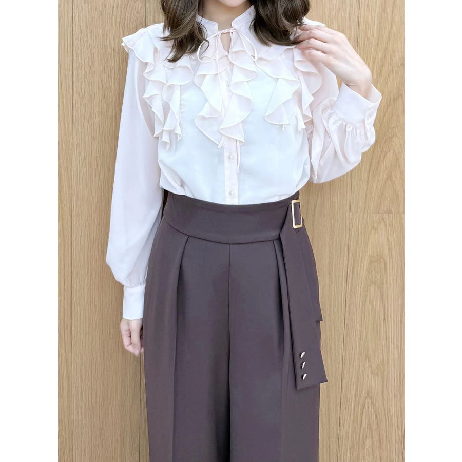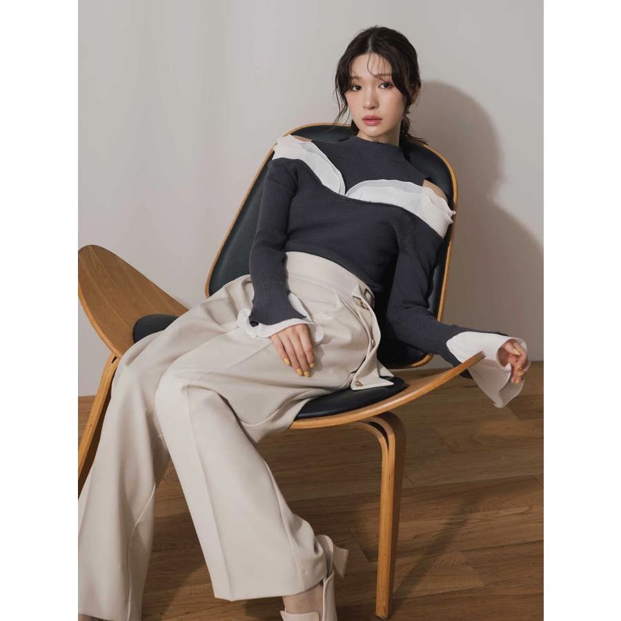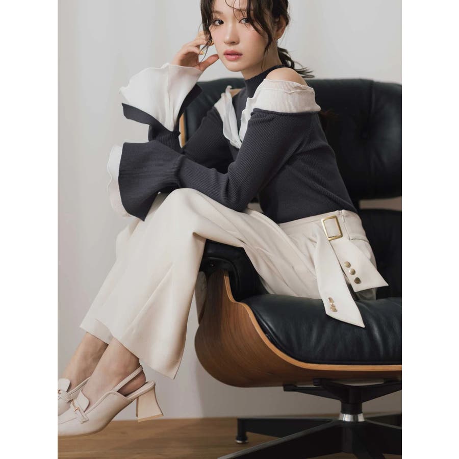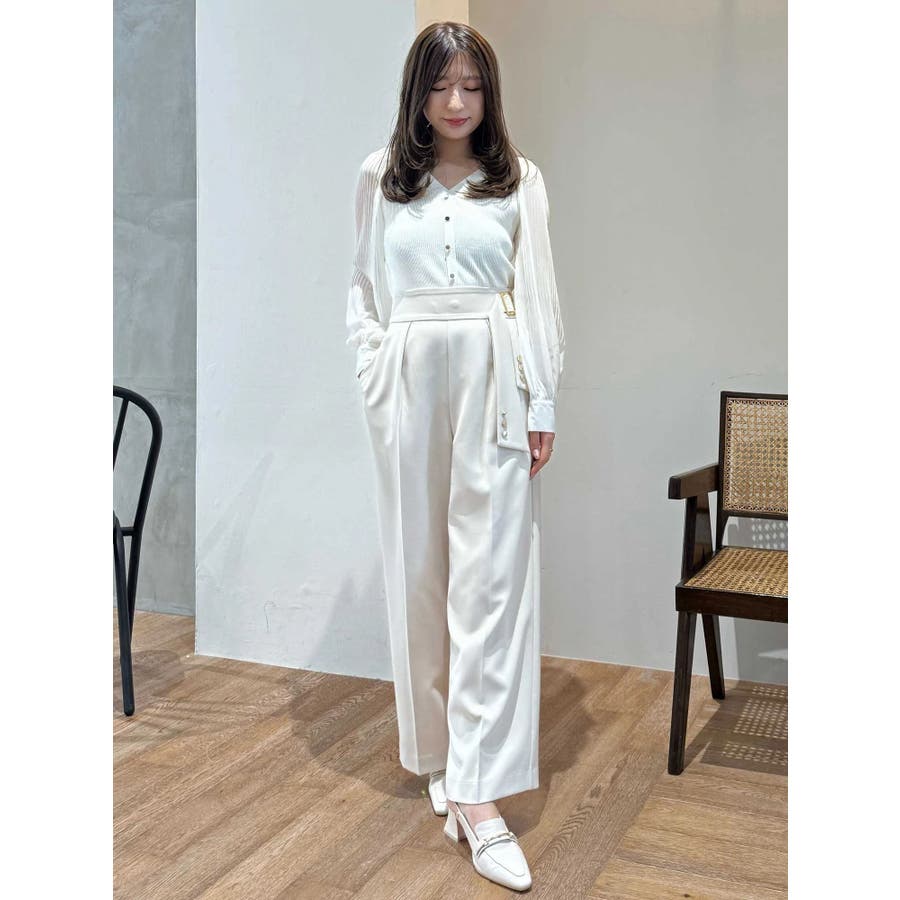 サイドベルトから流れるジャケットの袖に見立てたリボンがポイントのストレートパンツ。 同素材のバックドレープジャケットとセットアップも可能です。 ▼スタイリング セットアップ可能なジャケットとのコーディネートがおすすめ。 ベーシックなカラーなので、セットアップ以外にも活躍します。 ビジューのニット合わせやラッフルブラウス、ぴたっとしたシンプルニットまで幅広く着回せます。 足元はローファーミュールや雑材のミュールで季節感を演出しても◎ ※着用画像は全てサンプルです。 ※リボン先のボタン、艶ありゴールドですが、バックルと同じ艶無しゴールドになります。 ※SM着丈差4.5cm