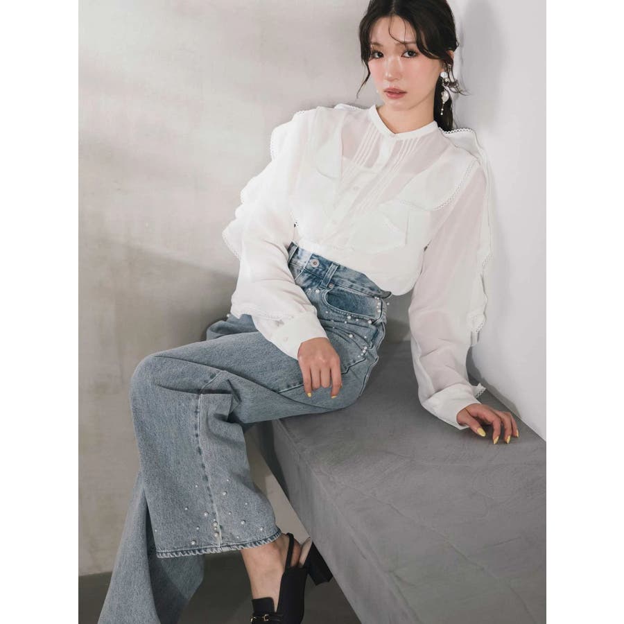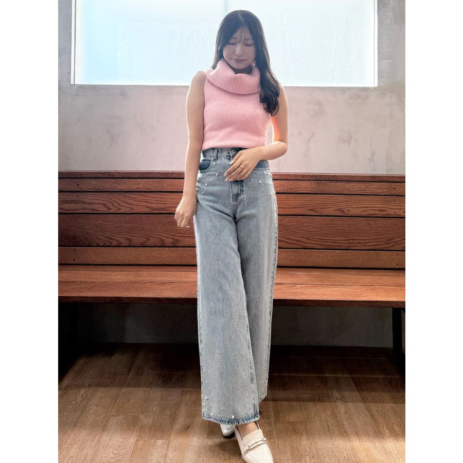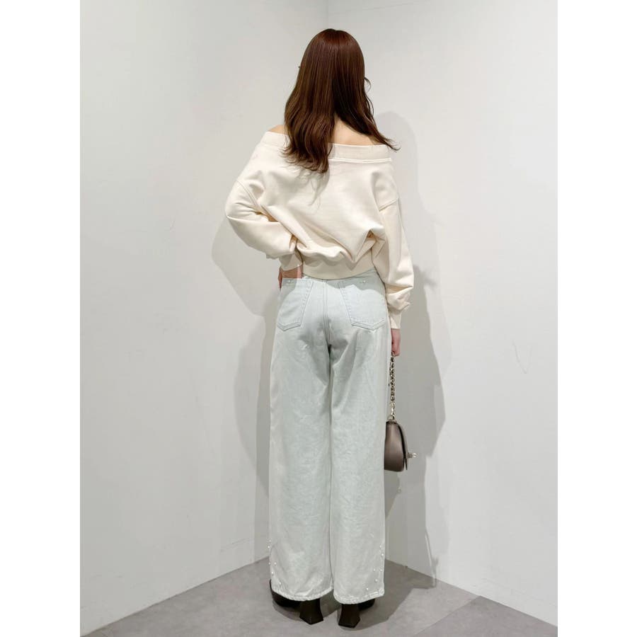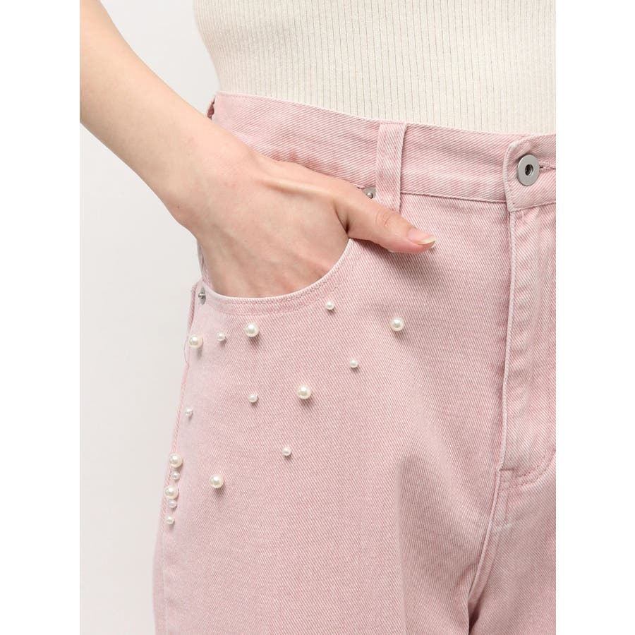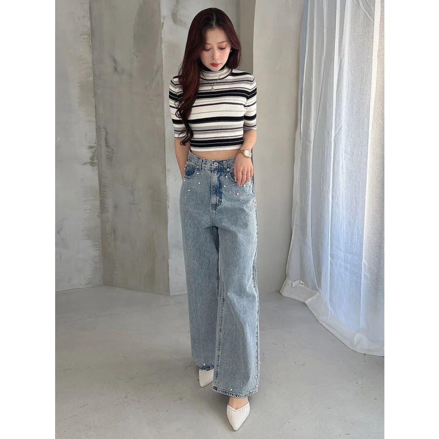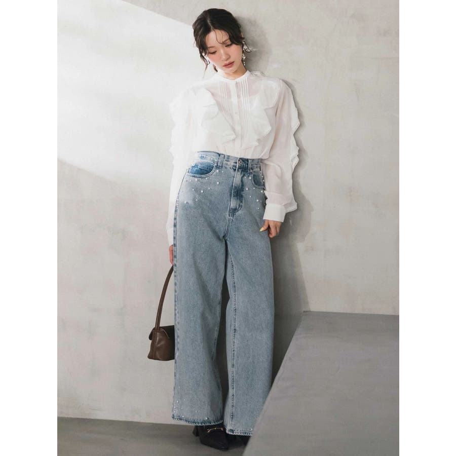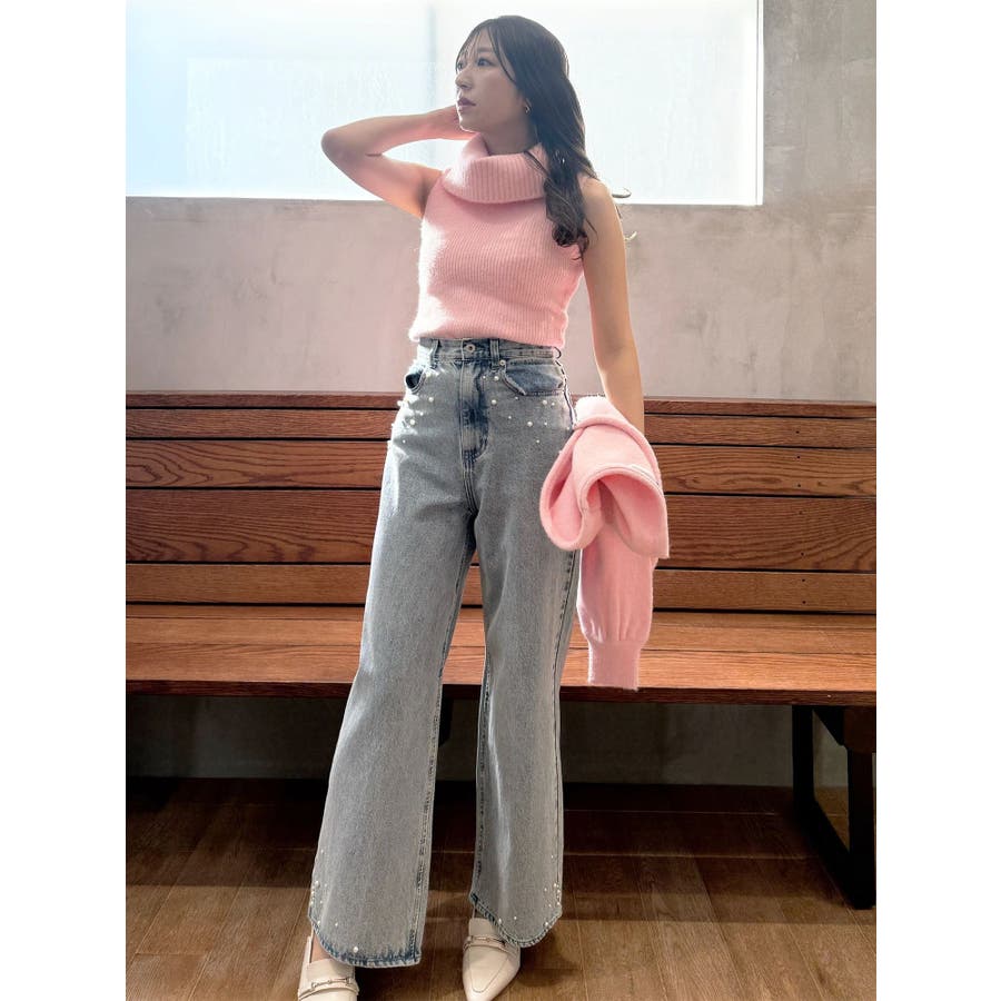 パールがウエスト周りと裾に打ち込まれている贅沢なハイウエストデニム。腰回りがすっきりとするハイウエストデザインなので脚長効果抜群。ぐるっと一周どこから見てもパールがキラッと輝くデザインなので、写真映え間違いなし◎▼スタイリング ジャケットと合わせてフェミニンカジュアルなスタイリングがおすすめ。今年はバックドレープジャケットと合わせるのがおすすめ。クロップドニットやポロニットと合わせてトレンド感あるスタイリングが楽しめます。※着用画像は全てサンプルです※SM着丈差4.5cm