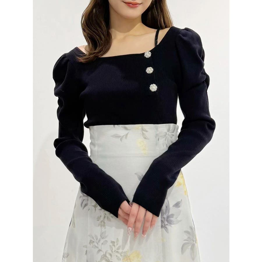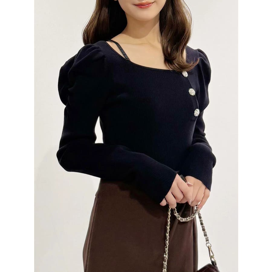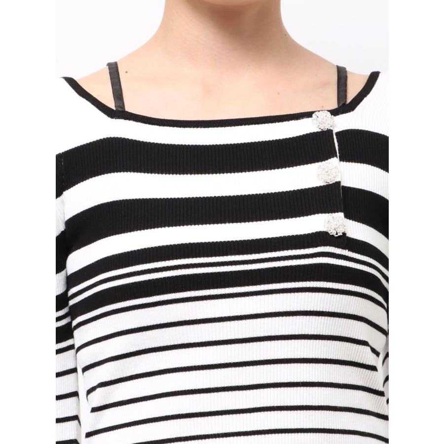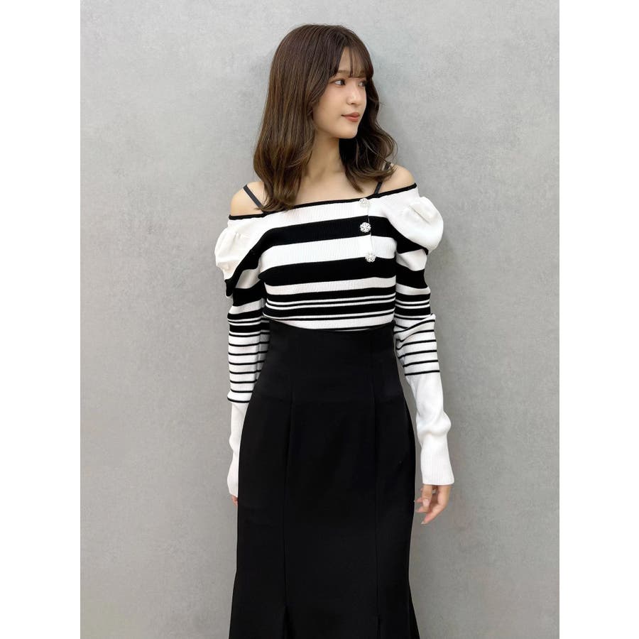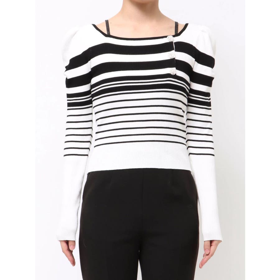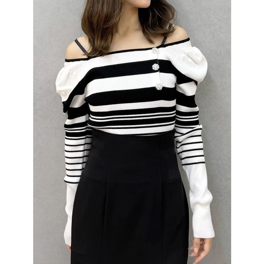 サイドにキラキラしたビジューが女っぽさを格上げしてくれるパワショルニット。 サテンの華奢なナローストラップがデコルテ周りをスッキリと見せてくれます。 ▼スタイリング 華やかな花柄スカートでフェミニンなコーデや、パンツ合わせで女性らしいパンツスタイリングのアイテムとして相性抜群。 デニムと合わせ足元はローファーミュールにすると、デイリーな大人カジュアルコーデに◎ ※着用画像は全てサンプルです。 ※MIXのボーダーのピッチは、バスト付近の太い線はサンプルより1cmほど細くなります。※詳細画像が正しい仕様となります。 ※着用画像はフラッシュの加減で実際の製品と色味等が異なる場合がございますので、生地のズームアップ画像をご確認ください。※ご利用の端末画面の設定により実際の商品と色味が異なる場合がございます。【商品特徴】透け感:なし伸縮性:あり生地の厚さ:普通サイズ感:普通裏地:なしポケット:なし