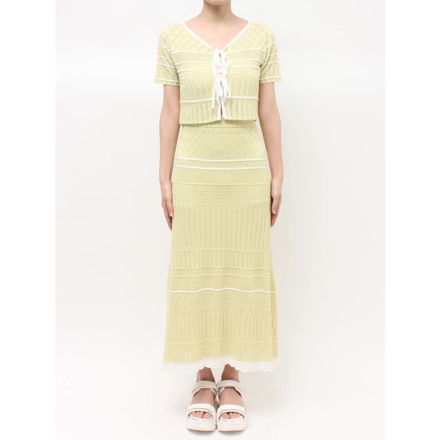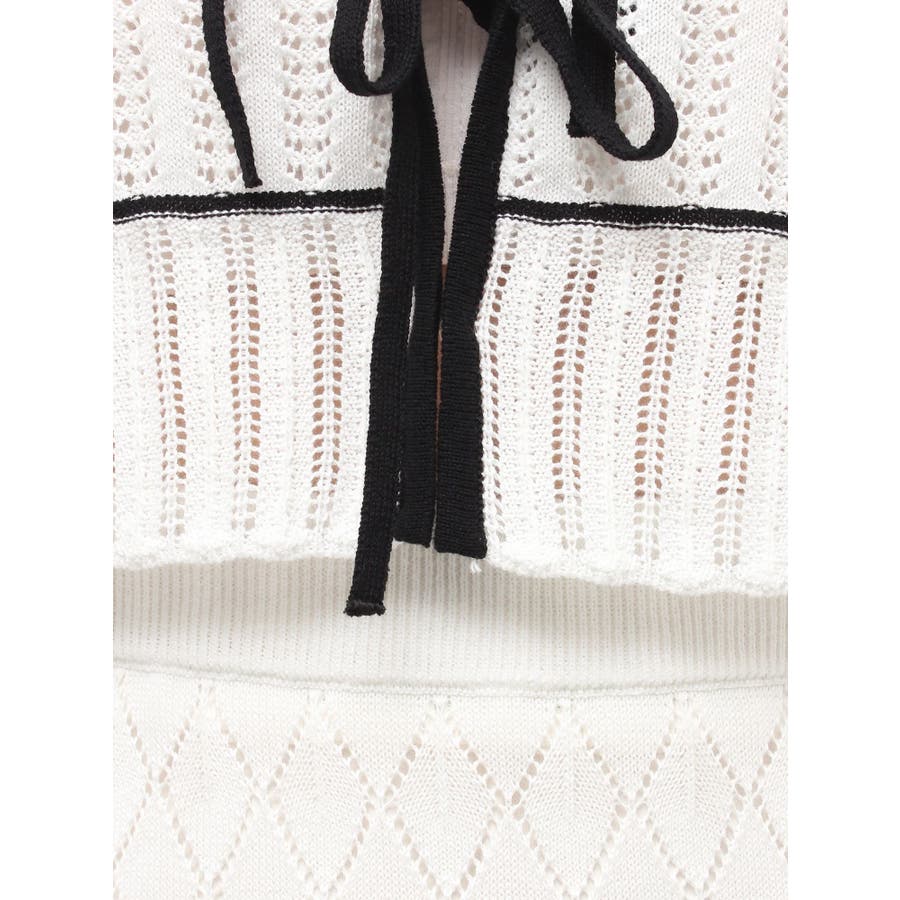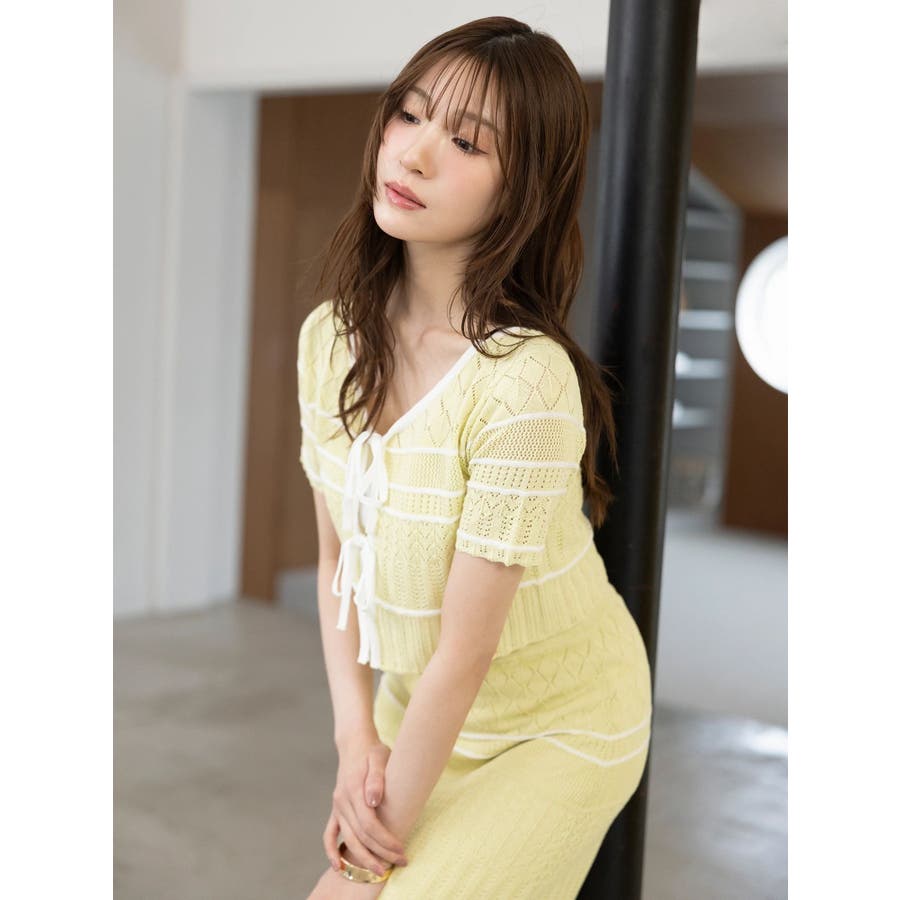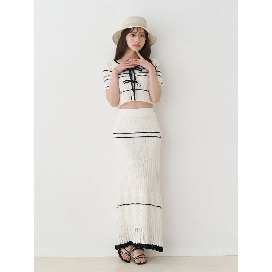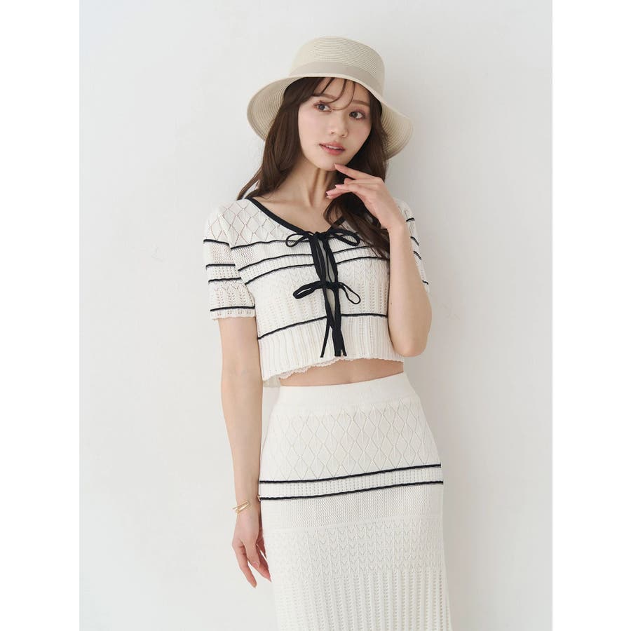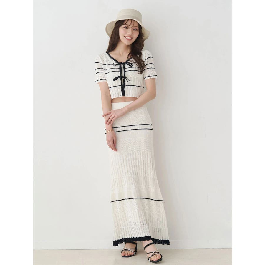 クロシェ風の透かし編みニットとスカートのセットアップ。軽やかな編み地がシーズンムードを高め、着るだけでコーデが決まる主役アイテムです。バイカラーラインとダブルリボンがアクセントになり、程よい甘さをプラス。トップスはカーデとしても着用でき、裾が開きすぎない隠しボタン付き。前後2way仕様で、フロントリボン・バックリボンどちらでも楽しめます。スカートはウエストぐるりゴム+裏地付きで、安心感とラクな着心地も魅力。▼スタイリング セット着用はもちろん、トップスはデニムでカジュアルに、スカートはTシャツ合わせで大人カジュアルにも◎ 足元は華奢なサンダルで抜け感を出すのがおすすめ。※ニットの特性上、着用を続けるうちに必ず伸びてきます。畳んだ状態で保管して下さい。また、伸びることを考慮して、少し短めの丈で仕上げています。※画像は全てサンプルです。