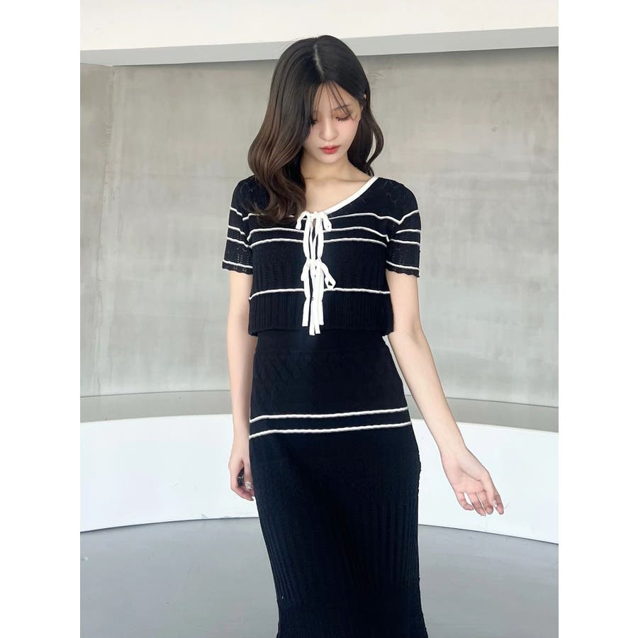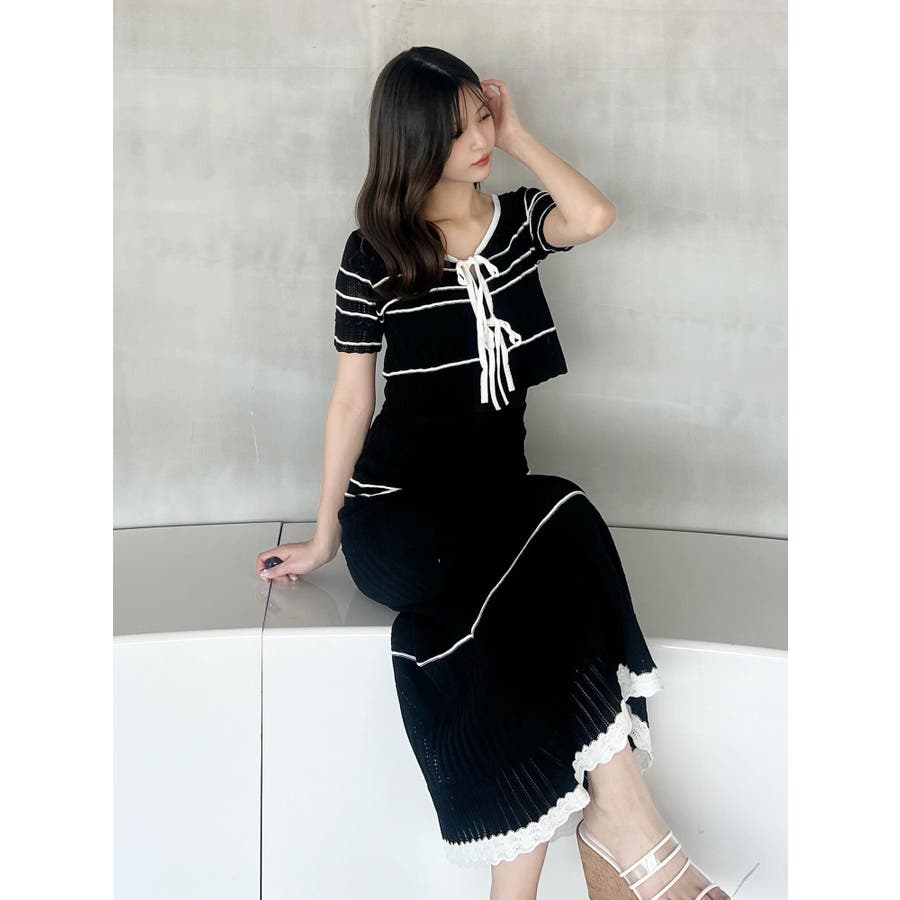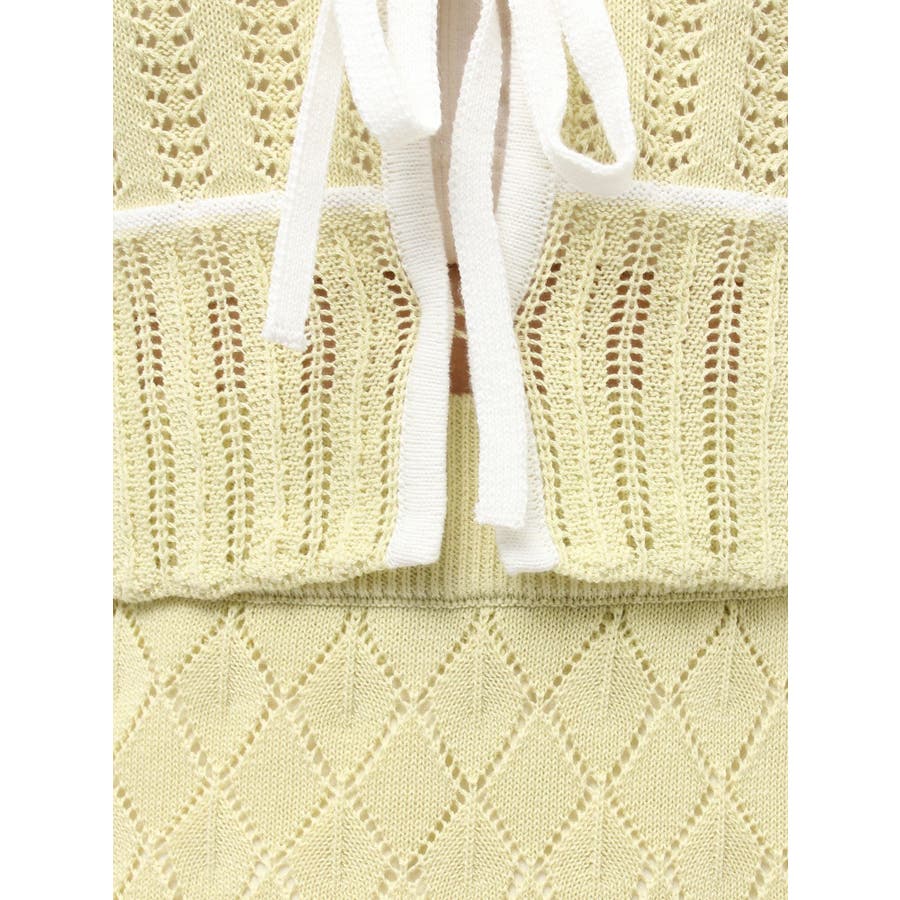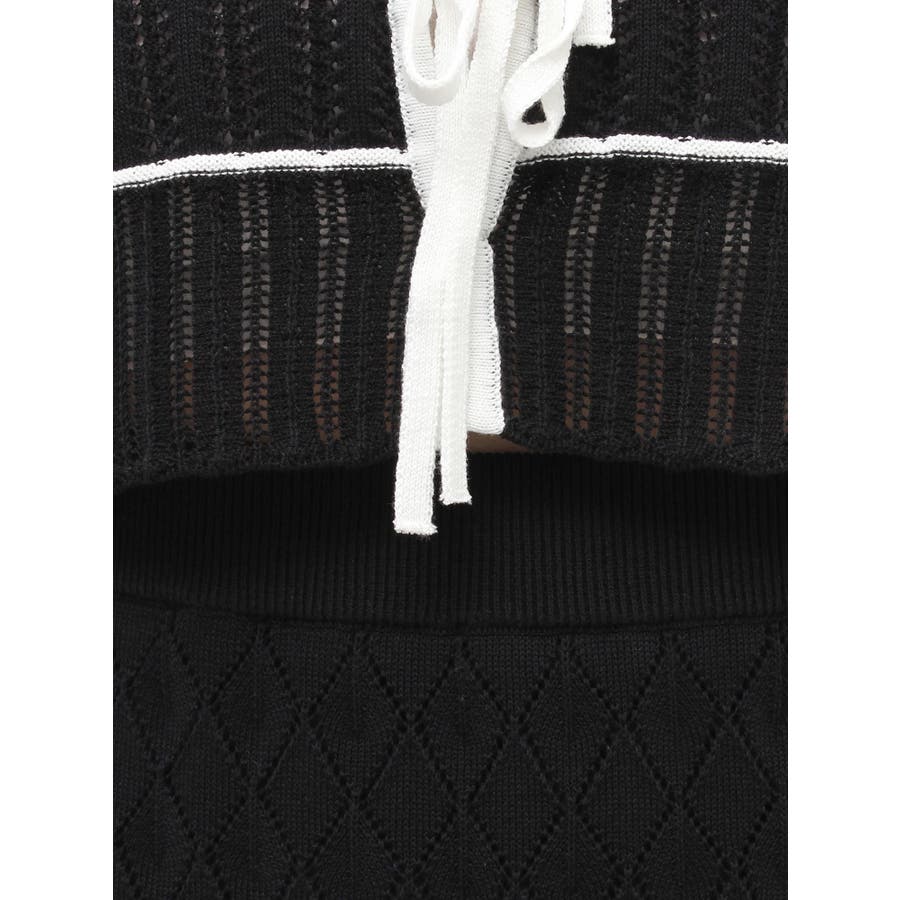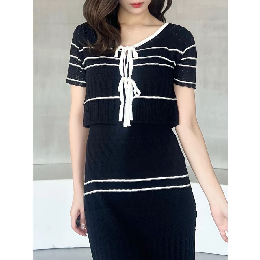 クロシェ風の透かし編みニットとスカートのセットアップ。軽やかな編み地がシーズンムードを高め、着るだけでコーデが決まる主役アイテムです。バイカラーラインとダブルリボンがアクセントになり、程よい甘さをプラス。トップスはカーデとしても着用でき、裾が開きすぎない隠しボタン付き。前後2way仕様で、フロントリボン・バックリボンどちらでも楽しめます。スカートはウエストぐるりゴム+裏地付きで、安心感とラクな着心地も魅力。▼スタイリング セット着用はもちろん、トップスはデニムでカジュアルに、スカートはTシャツ合わせで大人カジュアルにも◎ 足元は華奢なサンダルで抜け感を出すのがおすすめ。※ニットの特性上、着用を続けるうちに必ず伸びてきます。畳んだ状態で保管して下さい。また、伸びることを考慮して、少し短めの丈で仕上げています。※画像は全てサンプルです。