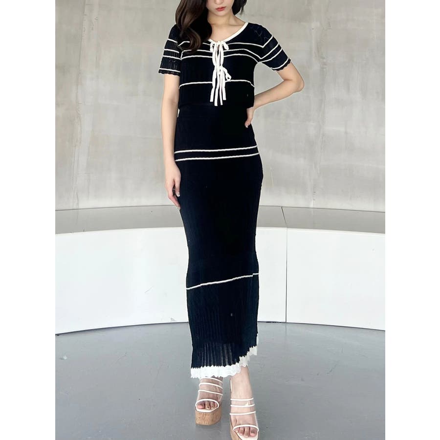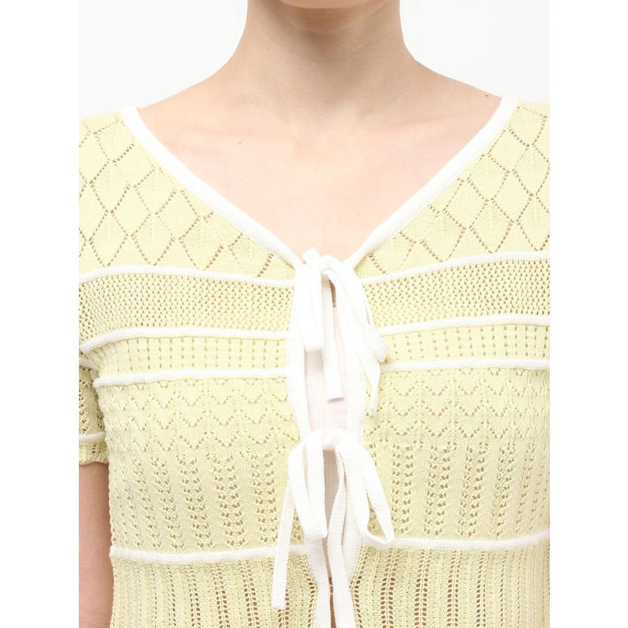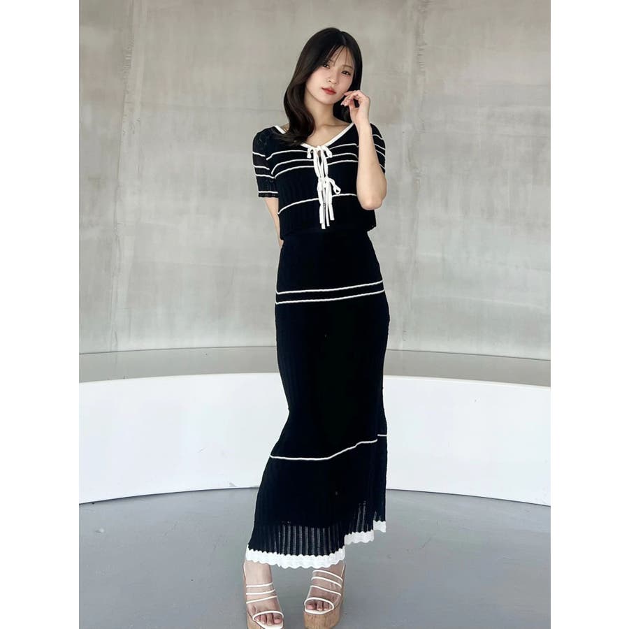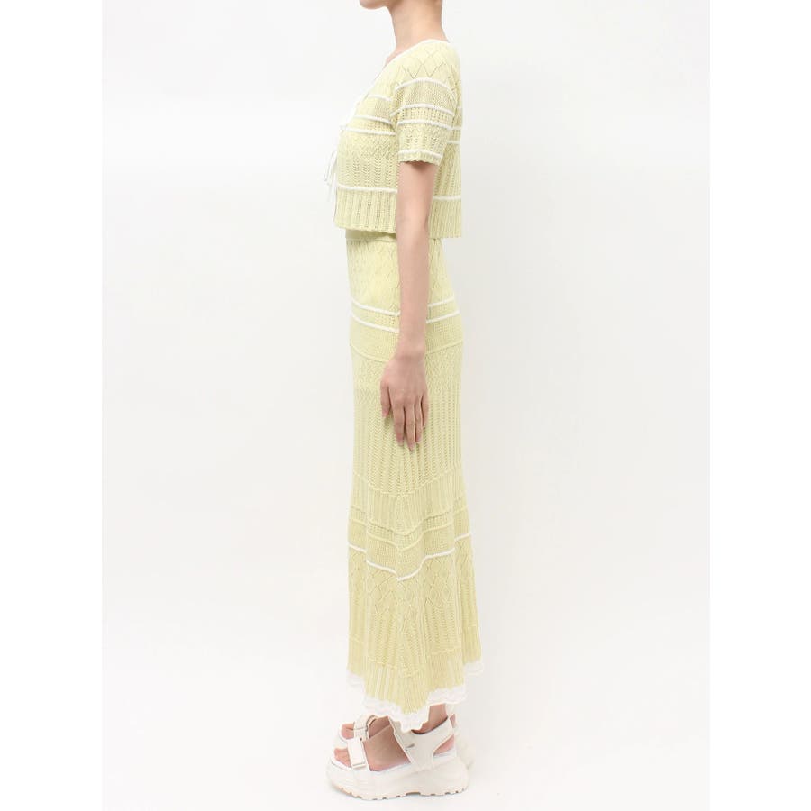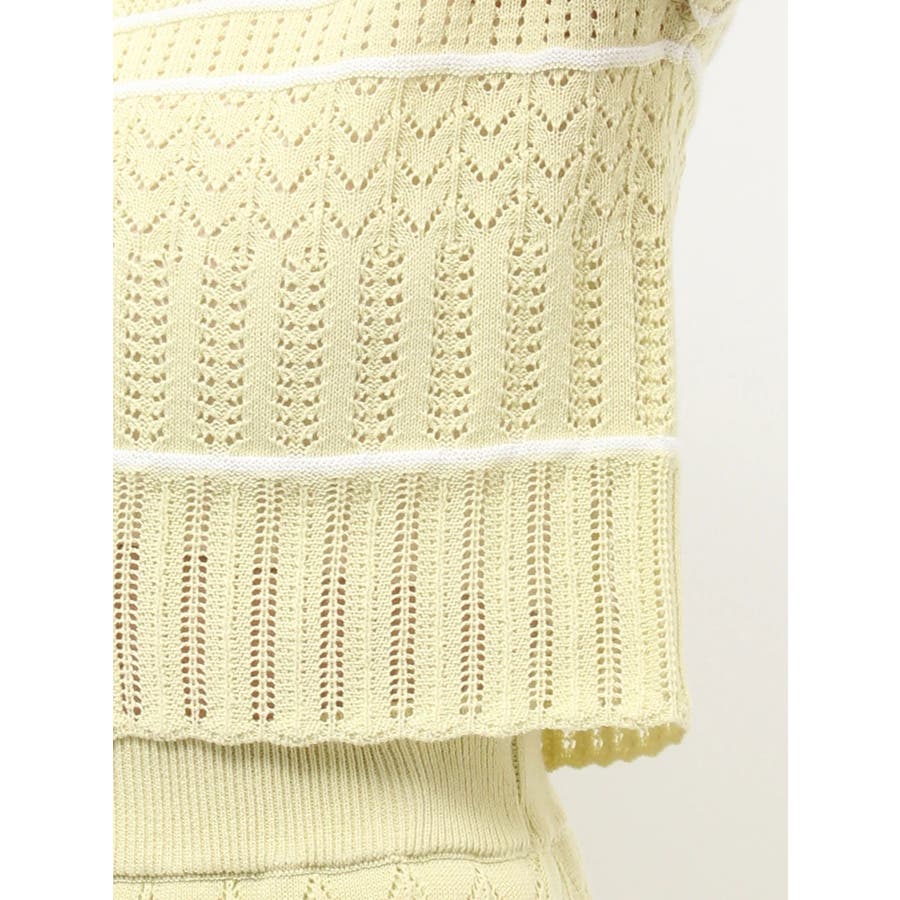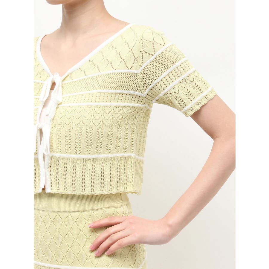 クロシェ風の透かし編みニットとスカートのセットアップ。軽やかな編み地がシーズンムードを高め、着るだけでコーデが決まる主役アイテムです。バイカラーラインとダブルリボンがアクセントになり、程よい甘さをプラス。トップスはカーデとしても着用でき、裾が開きすぎない隠しボタン付き。前後2way仕様で、フロントリボン・バックリボンどちらでも楽しめます。スカートはウエストぐるりゴム+裏地付きで、安心感とラクな着心地も魅力。▼スタイリング セット着用はもちろん、トップスはデニムでカジュアルに、スカートはTシャツ合わせで大人カジュアルにも◎ 足元は華奢なサンダルで抜け感を出すのがおすすめ。※ニットの特性上、着用を続けるうちに必ず伸びてきます。畳んだ状態で保管して下さい。また、伸びることを考慮して、少し短めの丈で仕上げています。※画像は全てサンプルです。