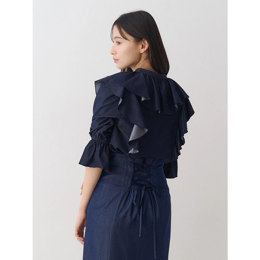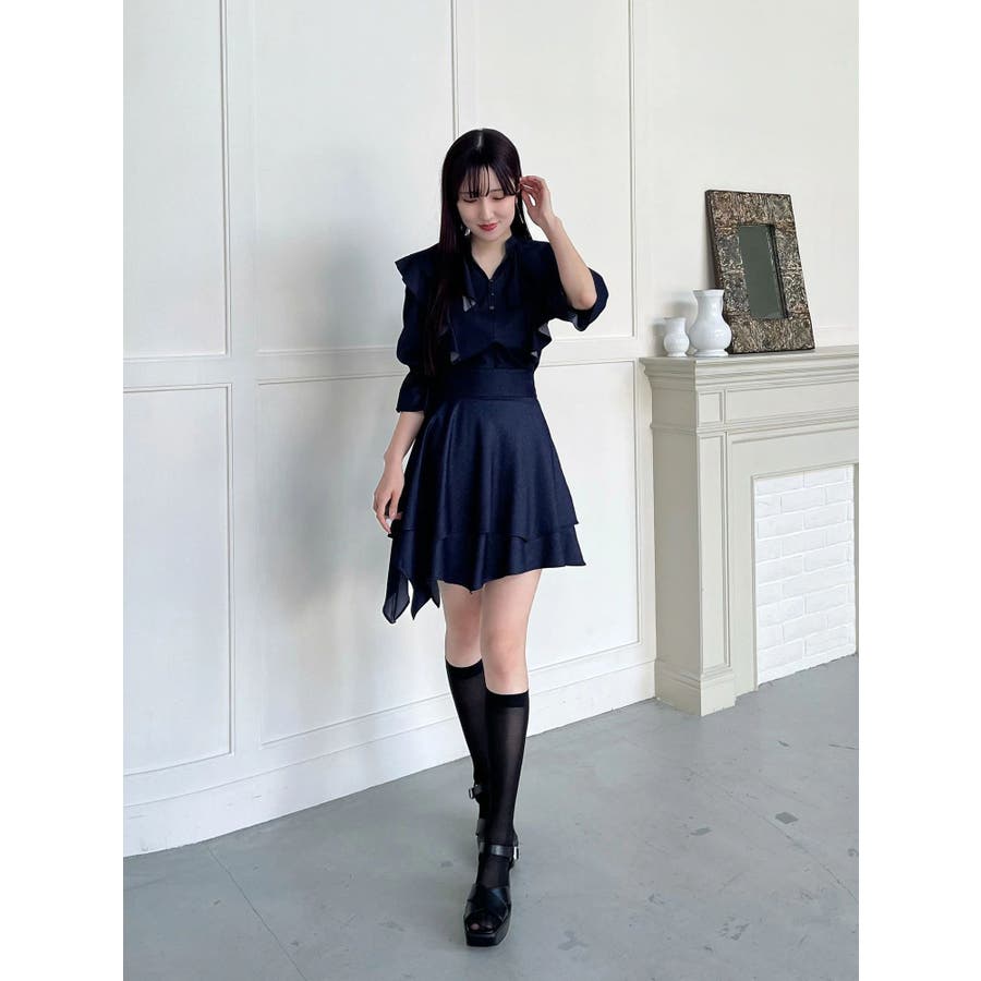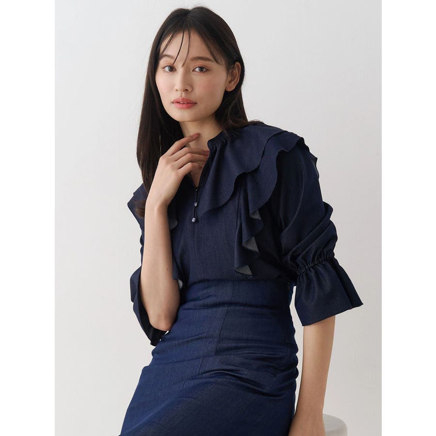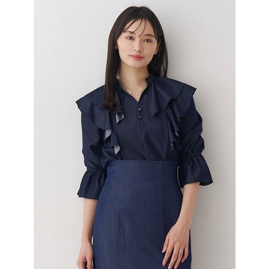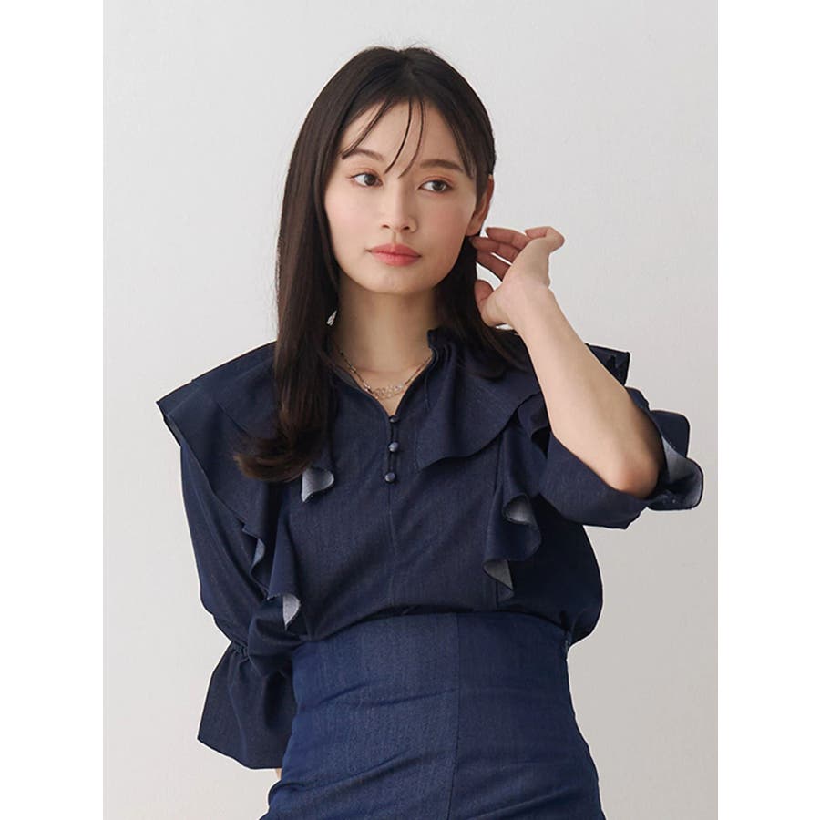 デコルテ周りのラッフルが春のコーディネートを格上げしてくれるブラウス。袖口はキャンディースリーブでゴムが入っており、上げて留めることができるので気温変化にも対応できます。 カラーによって素材を変えており、ブラックはシアーチェック、アイスはシャツ地のストライプ、インディゴはシャンブレーデニムです。 ▼スタイリング セットアップ着用可能なラッフルミニスカパンと合わせて、ミニワンピース見えコーデがおすすめ。 インディゴは、ストレッチマーメイドスカートのインディゴと合わせればロングワンピース見えにも。 足元はロングブーツやメッシュブーツで春の気分を高めたスタイリングに◎セットアップ以外にも、スカートやパンツとの合わせは抜群です ※着用画像は全てサンプルです。 ※ブラックのみインナーキャミが付きます。※セットアップ着用可のスカートは、アイスブルーのお作りがございません。