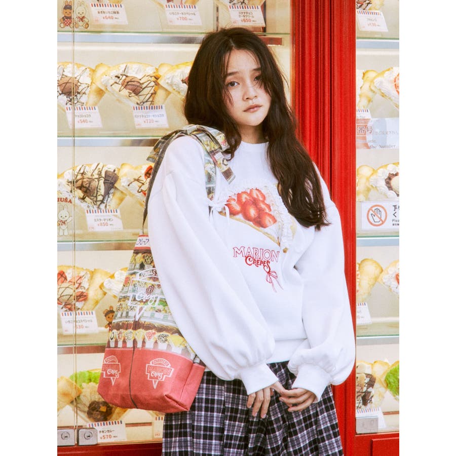 ○ MARION CREPES × merry jenny(メリージェニー) ○ special collaboration!! ※製品版は、リボンが肩紐部分に縫い付けられます。※詳細画像が正規の商品となります。 ■デザイン マリオンクレープの店頭ショーウィンドウを全面にプリントした、フォトプリントトートバッグです。 ヴィンテージ感のある落ち着いた色味で、デイリー使いしやすく仕上げました。 ■サイズ感 A4サイズの書類がすっぽり入るサイズ感。 マチや内ポケットが付いており、荷物の多い日でも安心です。 ■スタイリング シンプルな形で、様々なお洋服とマッチするデザインです。 肩部分のリボンが、スタイリングのアクセントになります◯ 【商品情報】 透け感:無し 裏地:無し 伸縮性:無し 光沢感:無し 生地の厚さ:普通【マリオンクレープ】 1976年に渋谷公園通りにて、日本で初めて紙で巻くクレープの食べ歩き文化を広めた。 翌年の1977年に原宿竹下通り店がオープン。 現在では全国に90店舗以上。 さらに、2024年に公式キャラクターのマリうさが誕生し、グッズ・コラボなども展開中。