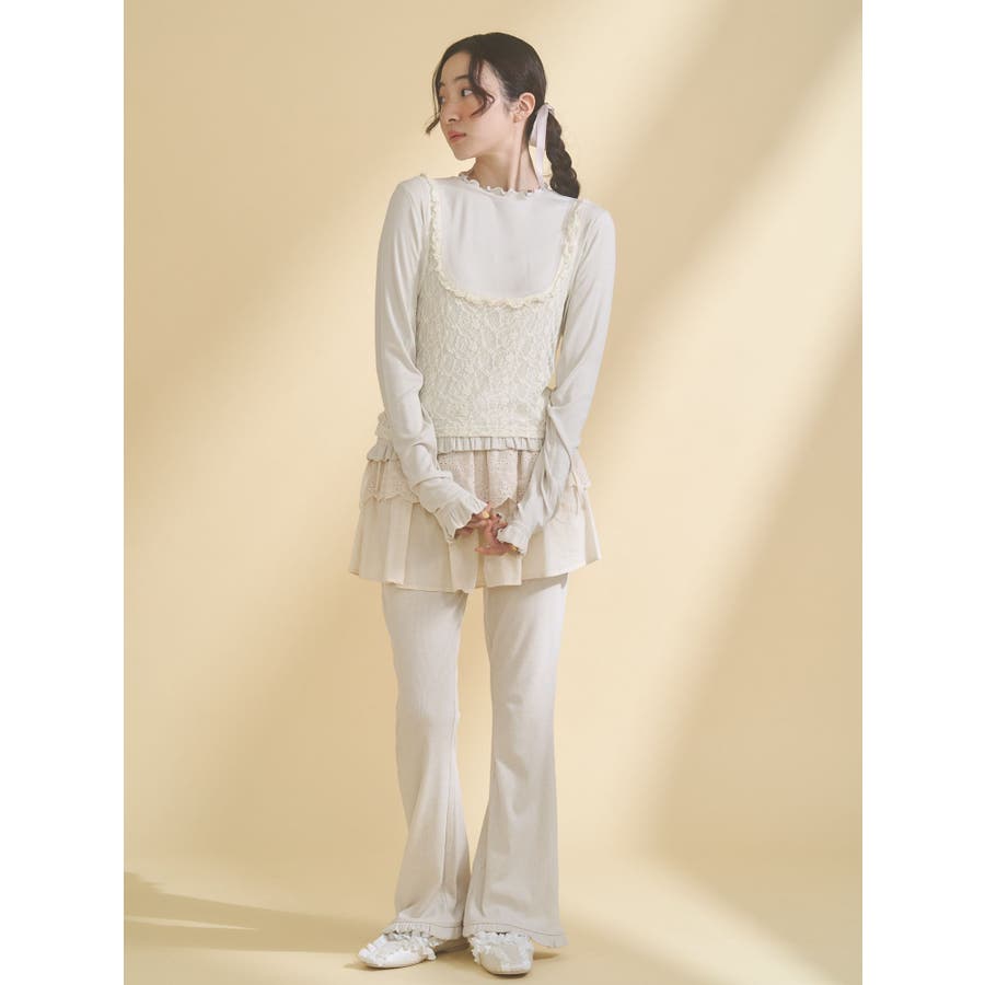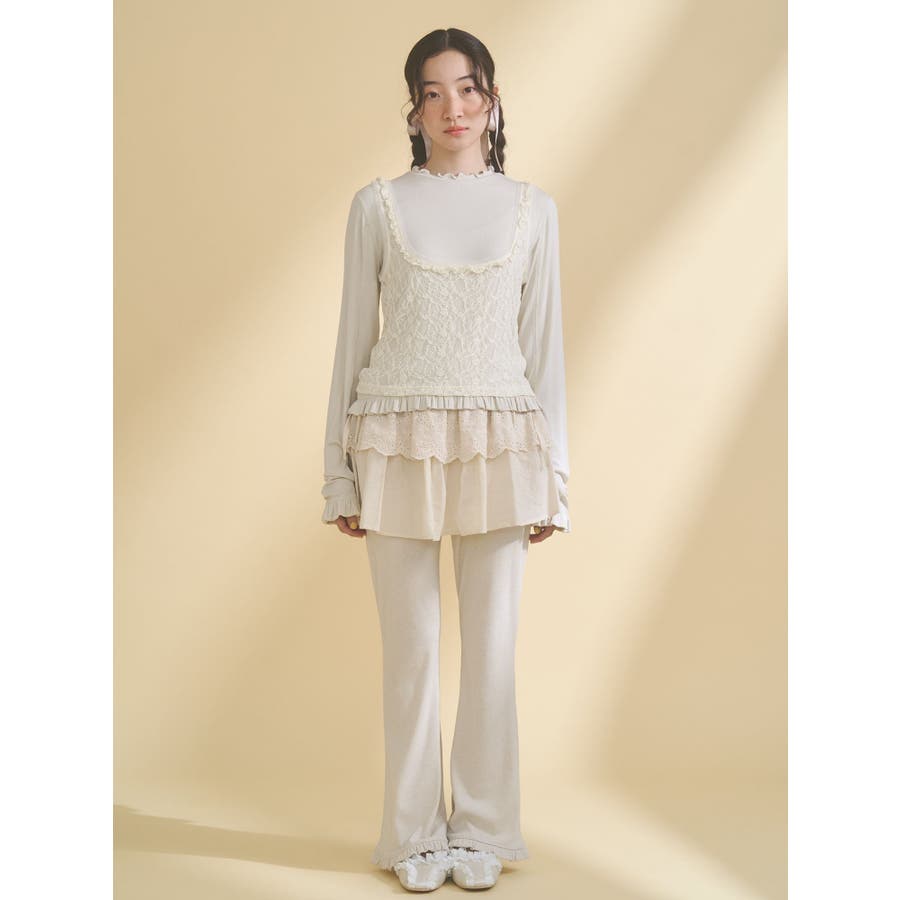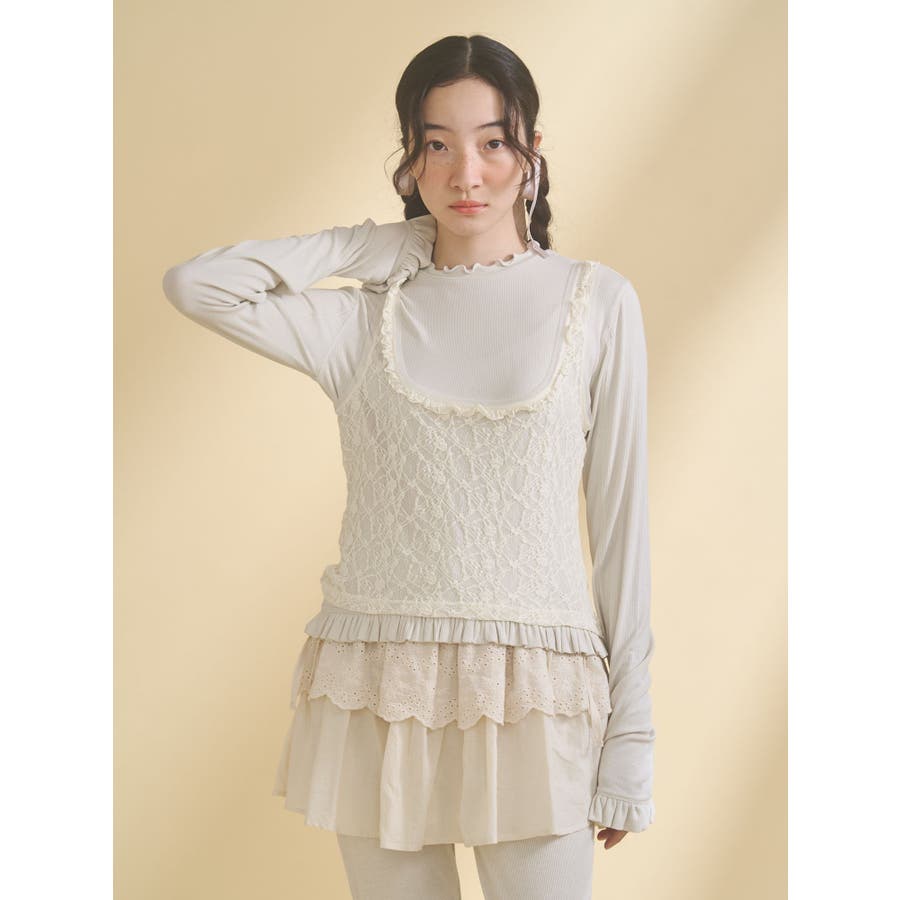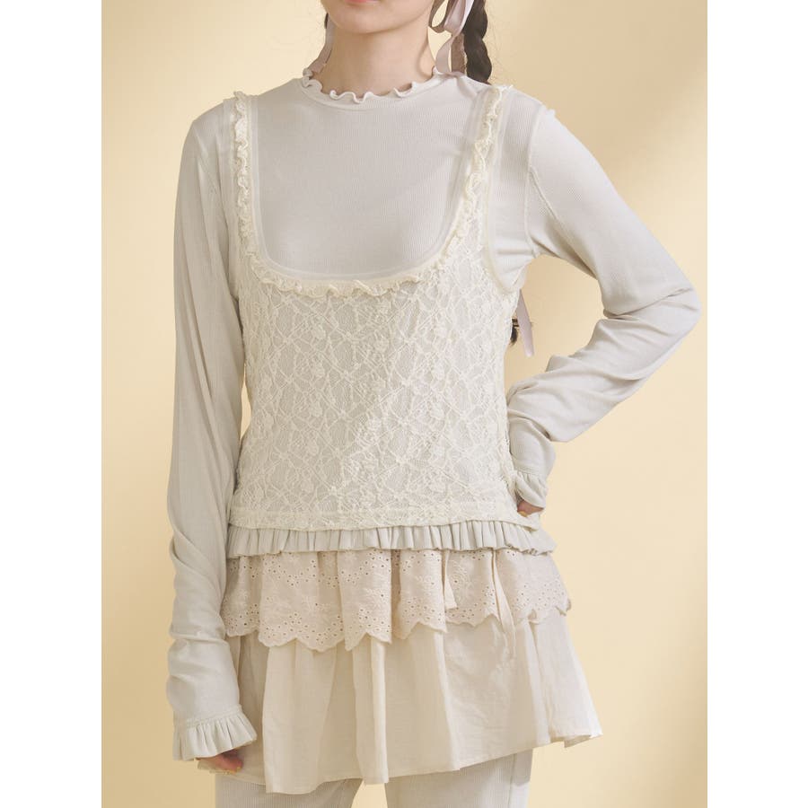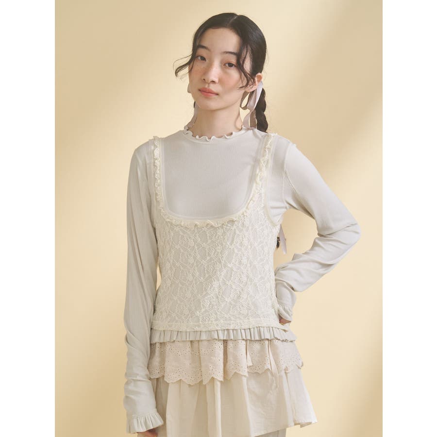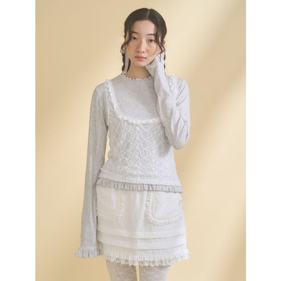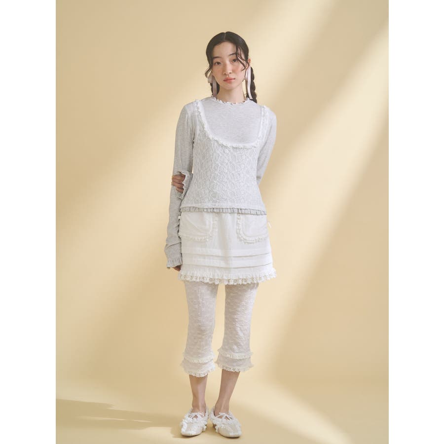 | 素材 | (仮)表地:セルロース95% ポリウレタン5% レース生地:ナイロン90% ポリウレタン10% チュール:ポリエステル100% |