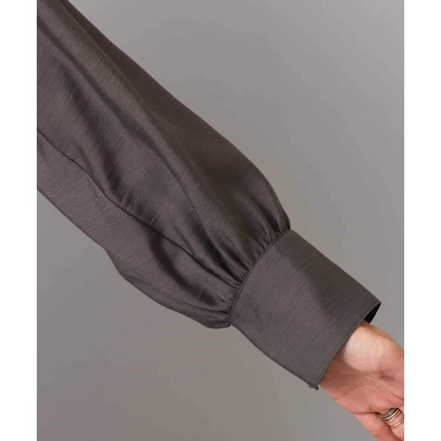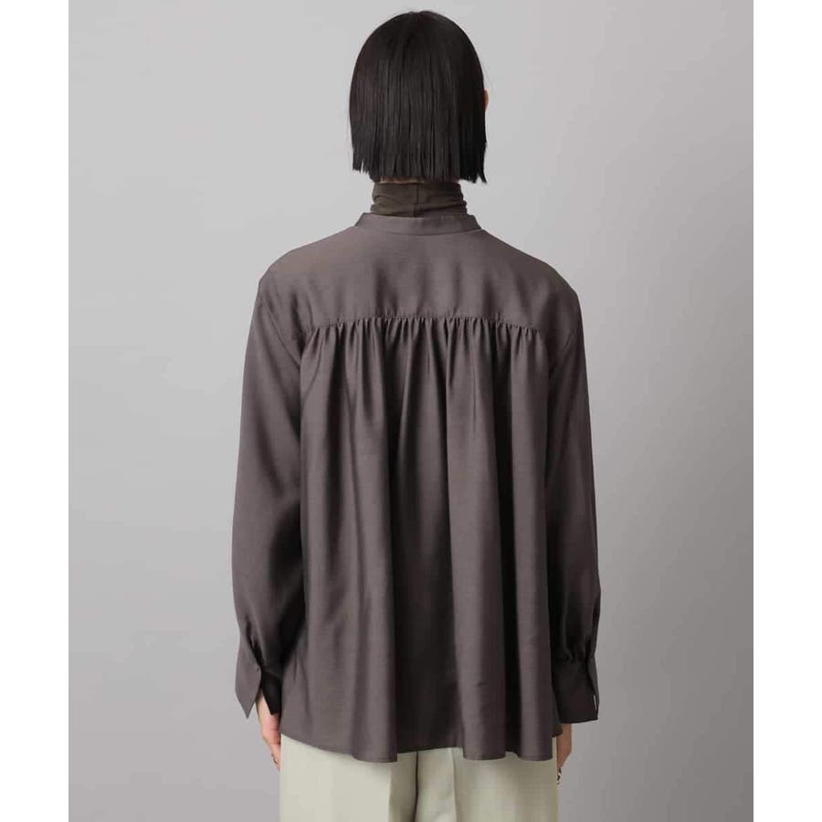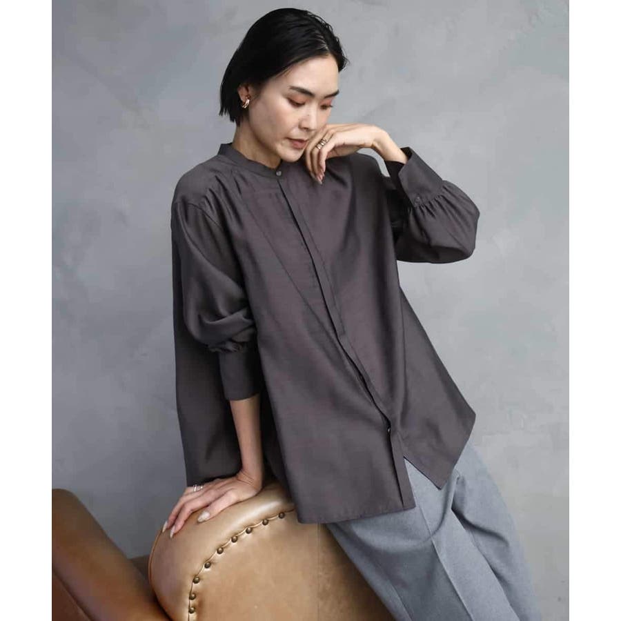 素材の特性を活かしたAラインシルエットのデザインブラウス。程よい透け感と軽さで重くならず、適度なはり感がボディラインを拾わず美しいシルエットをキープします。40サイズは限定店舗展開です。