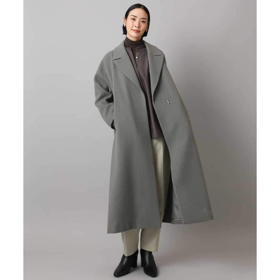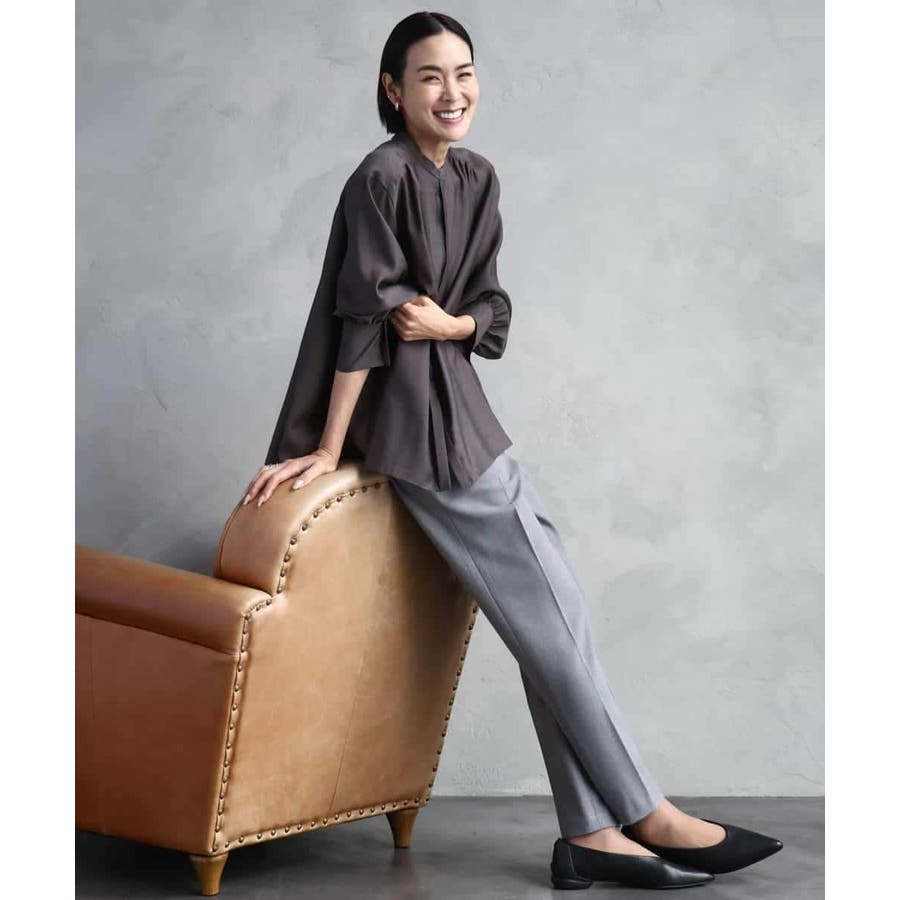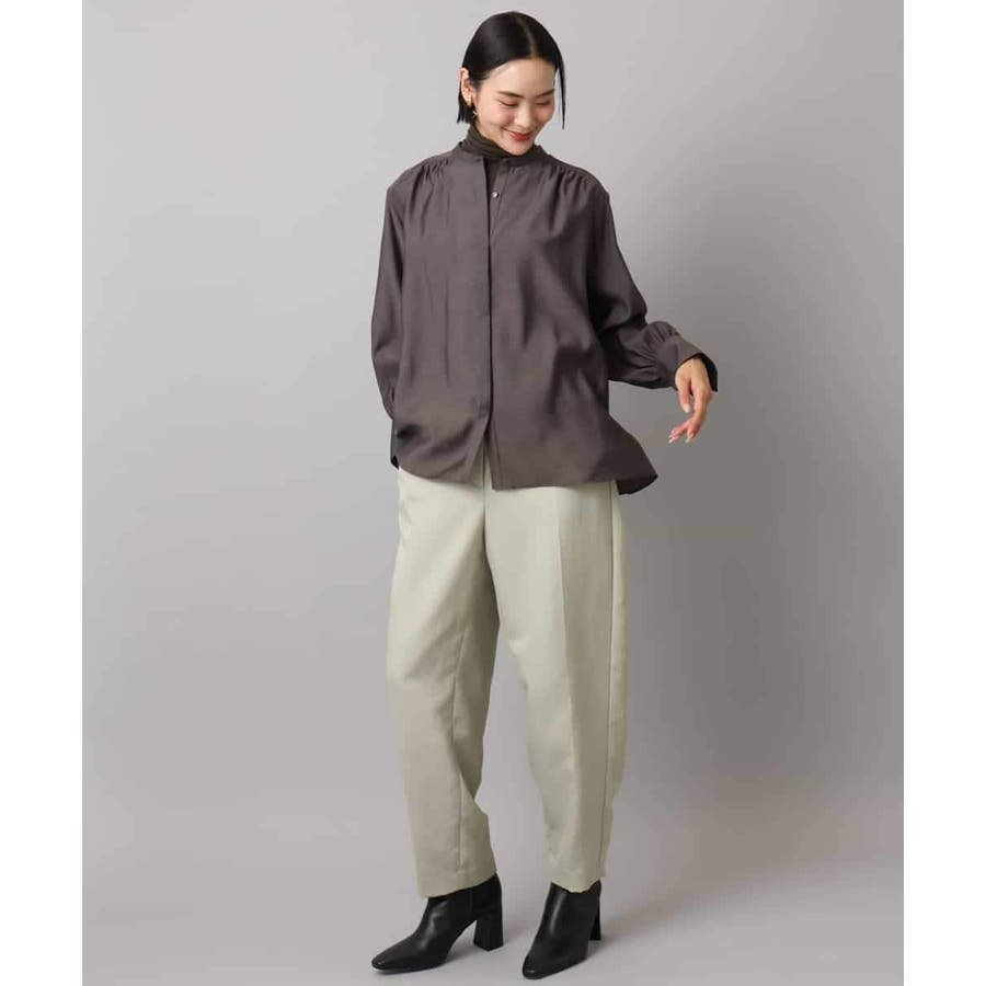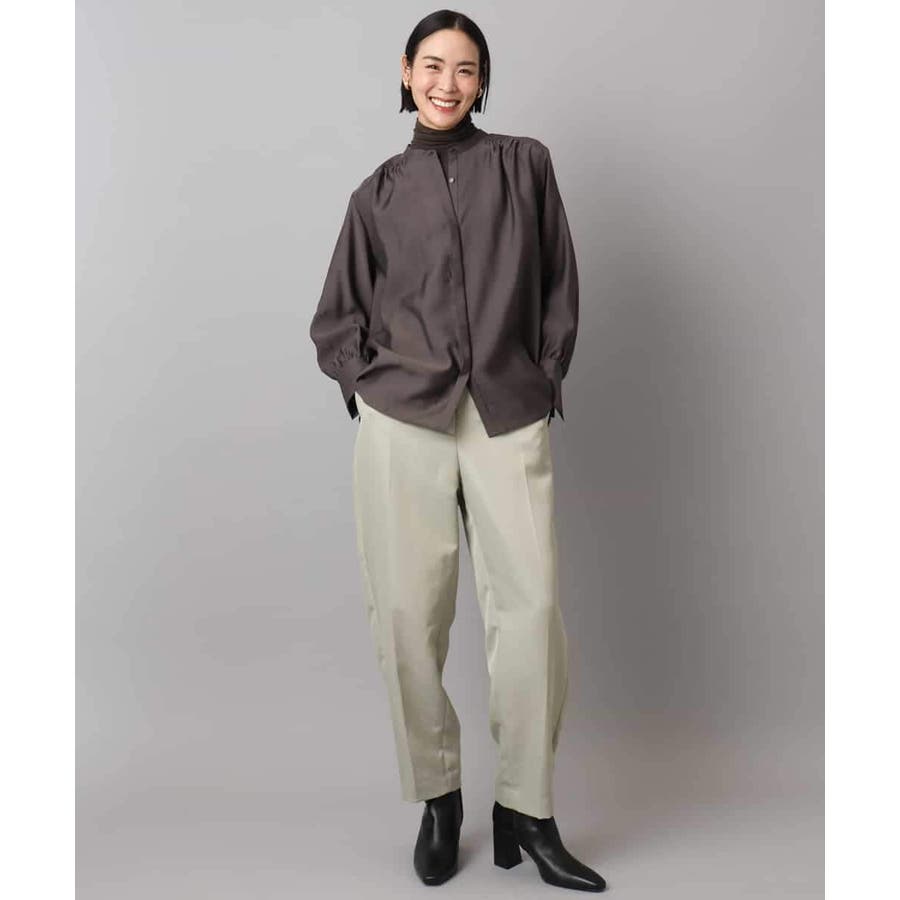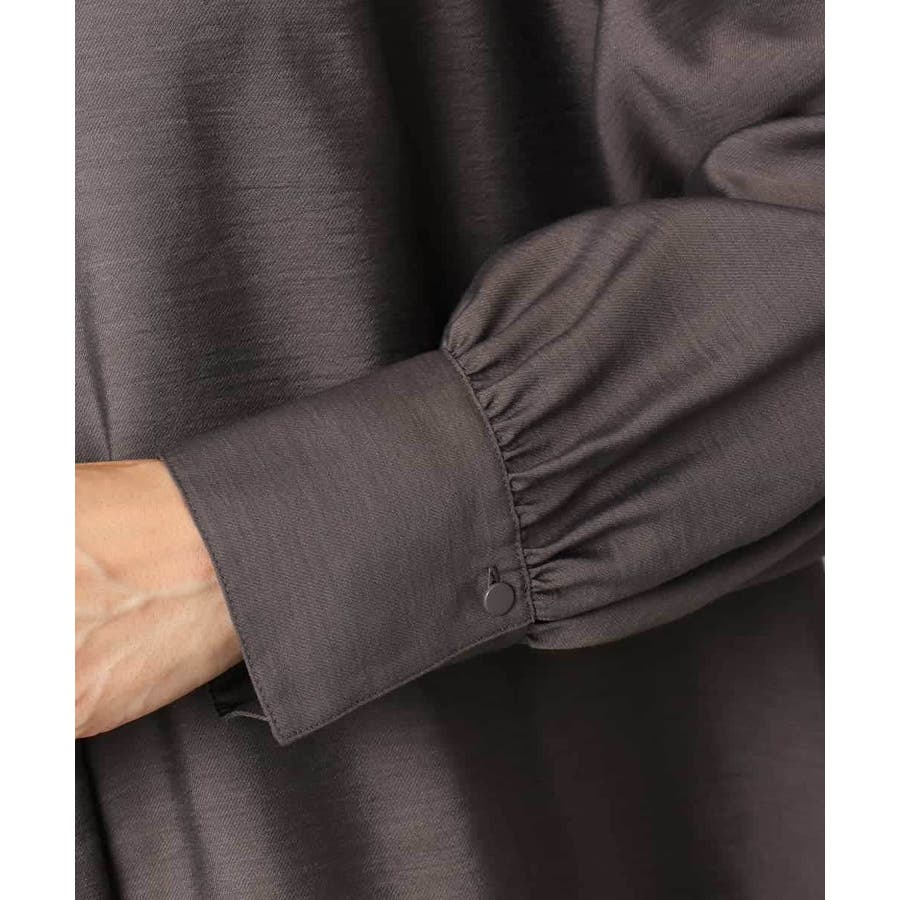 微光沢感が上品なポリエステルレーヨン素材。ほのかなシアー感がありながら薄すぎず、長い期間着用できる素材です。やや陰影感のある洗練された印象が魅力です。